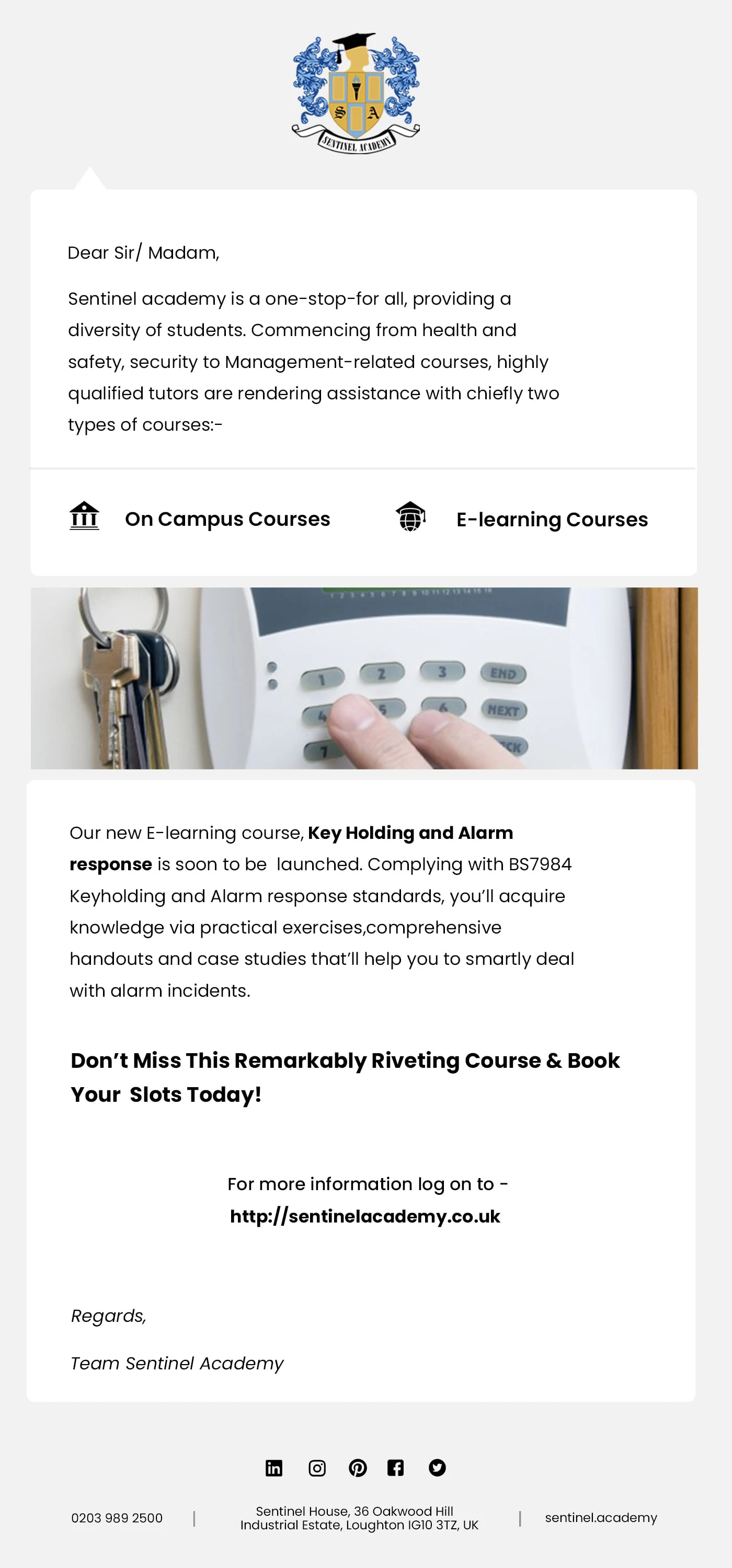 Designed a mailshot for Sentinel Academy launching it's new e-learning course on the website prompting audiences to check it out on the website.