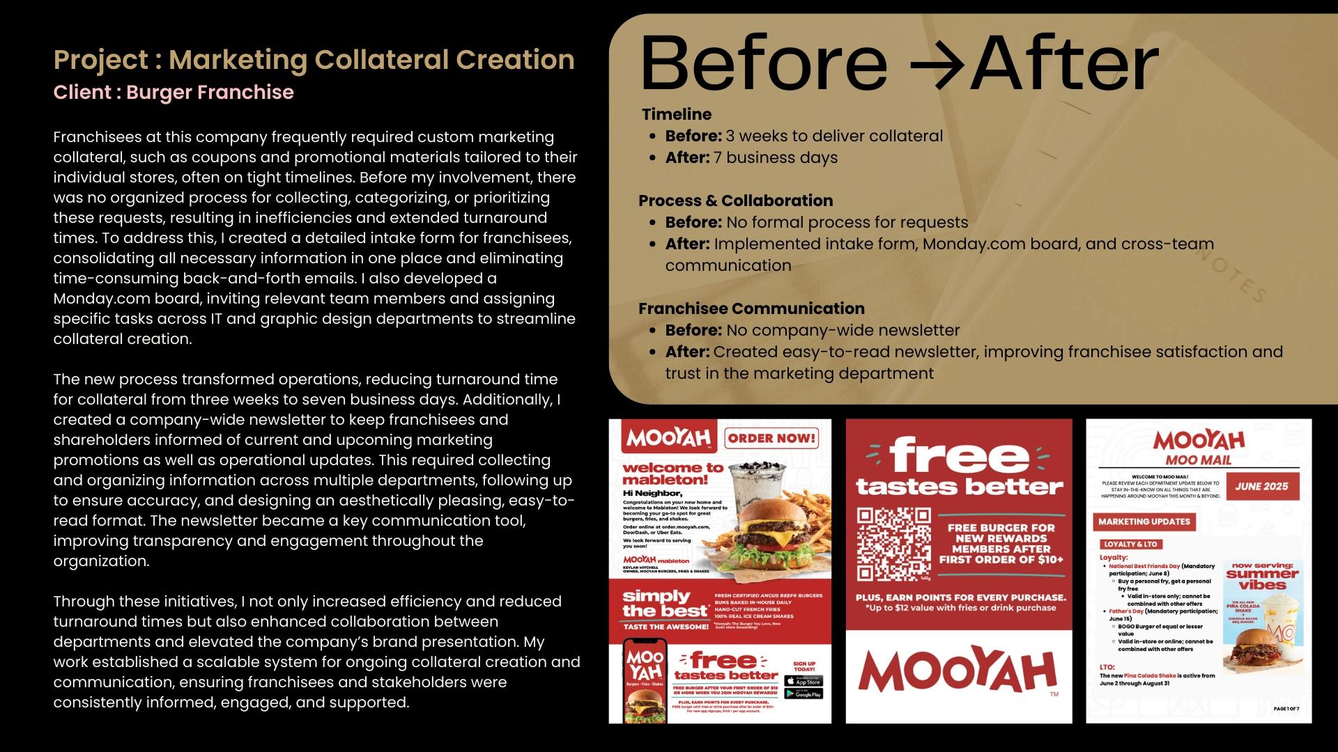 As the LSM Manager at MOOYAH Burgers, Shakes & Fries, I built the systems & intake processes that brought structure and clarity to franchise marketing requests.