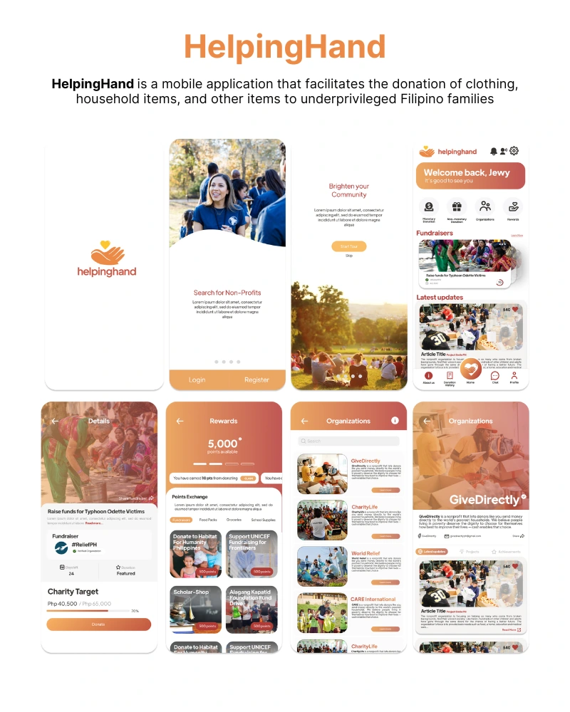 HelpingHand is a mobile application that facilitates the donation of clothing, household items, and other items to underprivileged Filipino families. The applic
