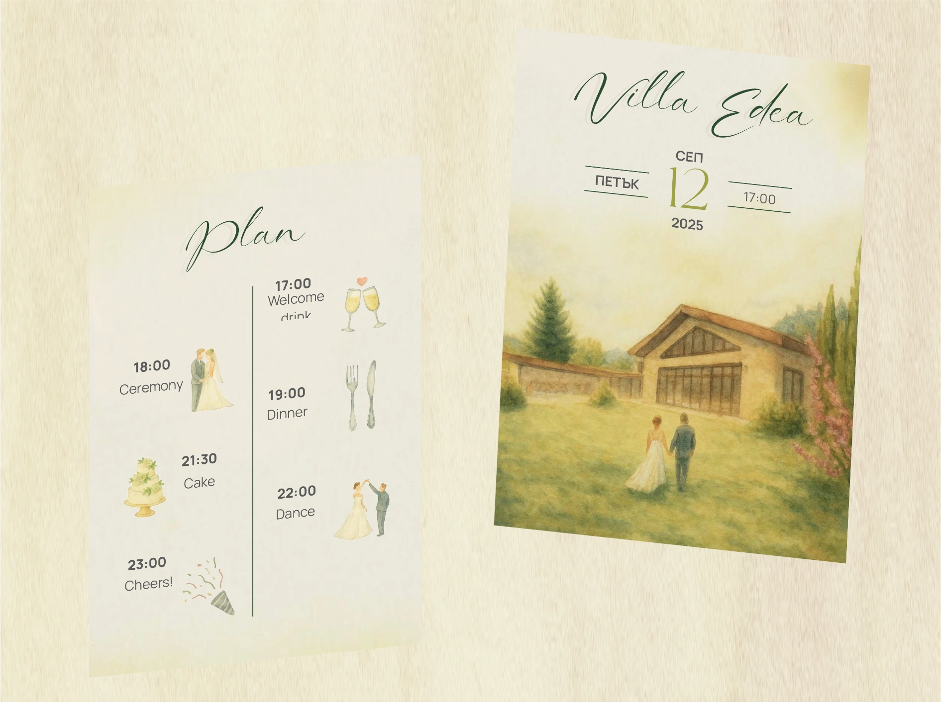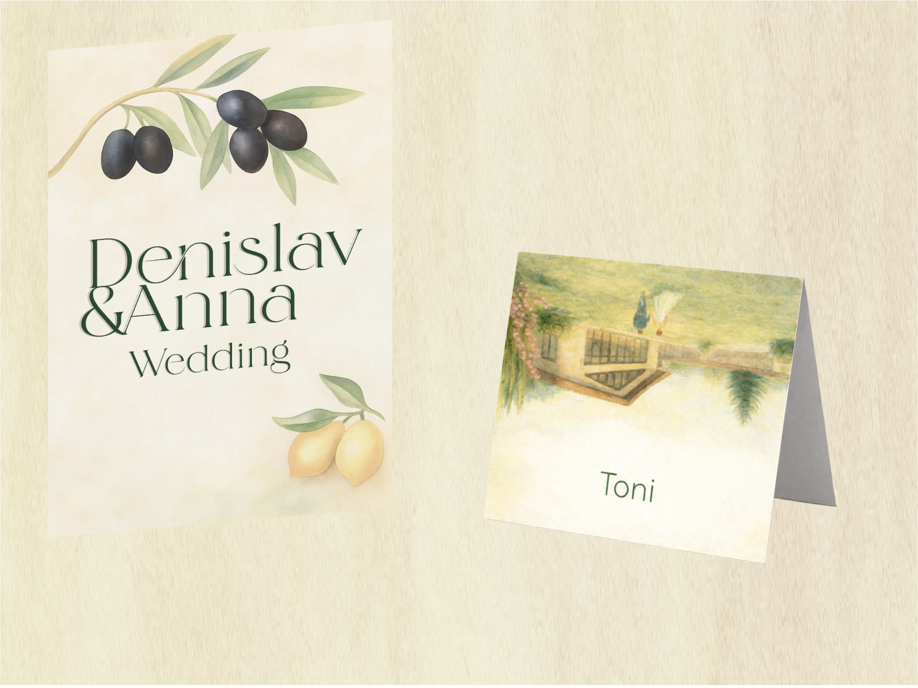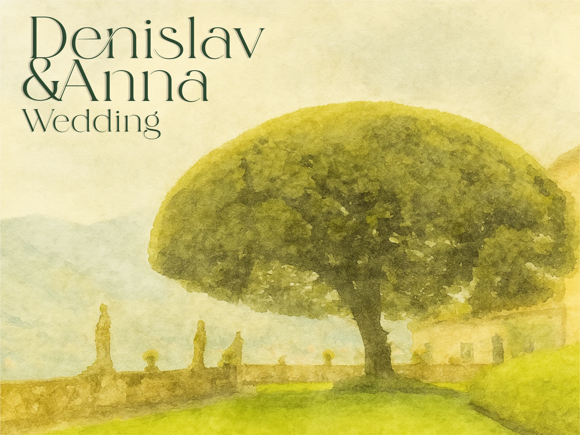 For this personal wedding project, I created a custom watercolor-based visual identity inspired by Italian aesthetics, designing hand-painted illustrations of the exact tree on Lake Como where the proposal took place as the main symbolic artwork, as well as the real wedding venue featured on the invitations. I developed a refined typographic system and cohesive print layout, ensuring that every element was not only visually elegant but directly connected to the couple’s real story and locations, turning the design into a meaningful narrative rather than just decorative stationery.