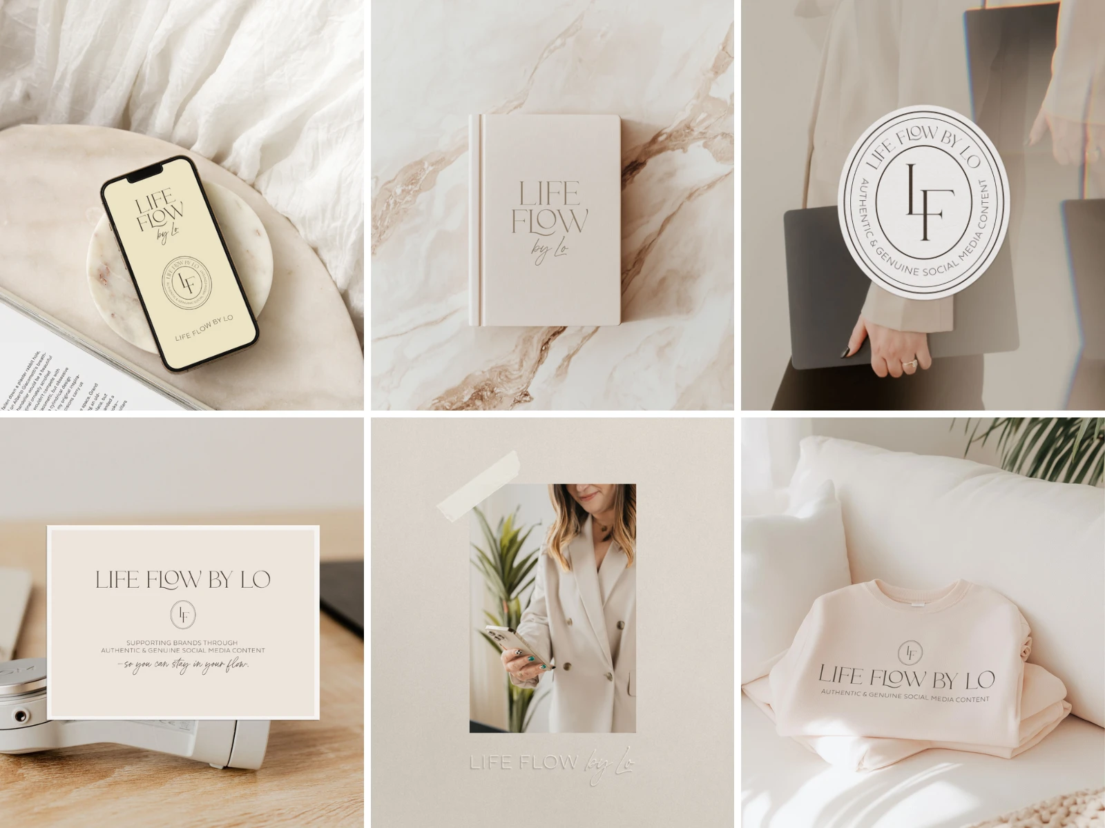 Life Flow by Lo’s branding was built to reflect Lo’s approach to content—thoughtful, genuine, and quietly confident. The visual identity embraces softness without feeling overly delicate, using a palette of warm neutrals, soft whites, and a gentle pop of buttery yellow to bring a sense of warmth and ease.