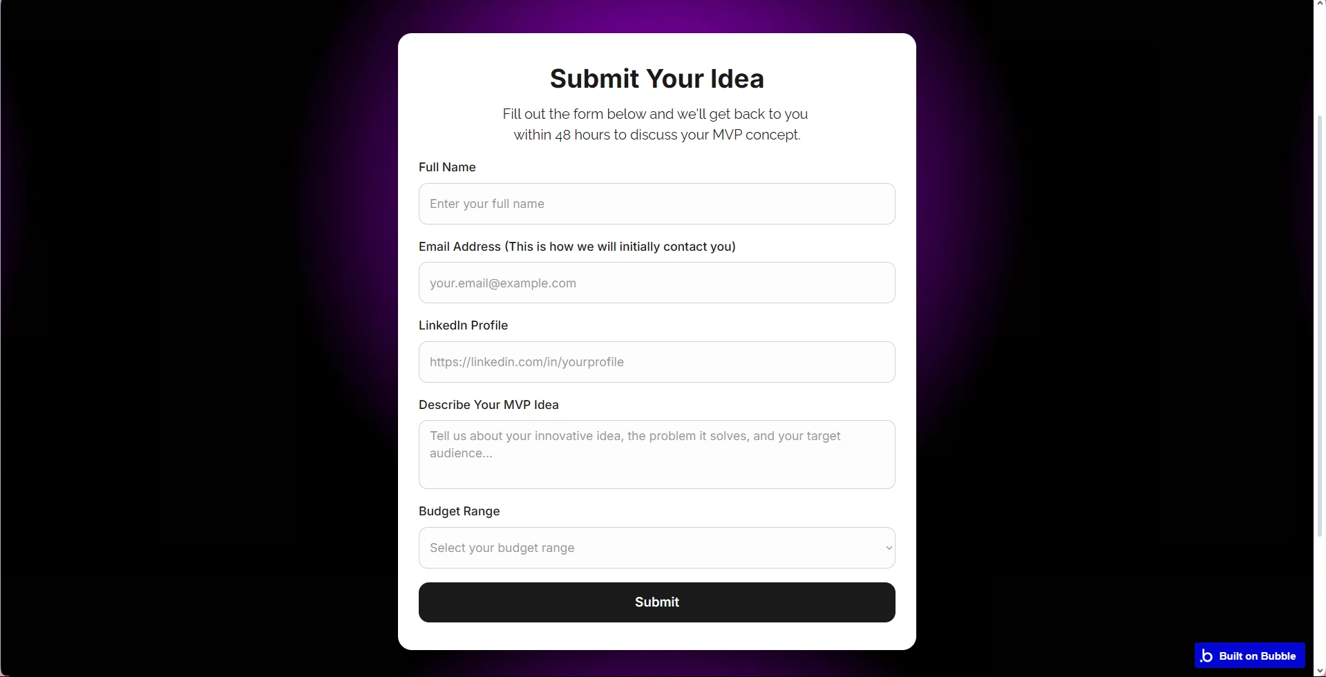 Form One is a streamlined client onboarding tool built in Bubble, designed to collect structured information from founders about the MVP they want to build. It features: