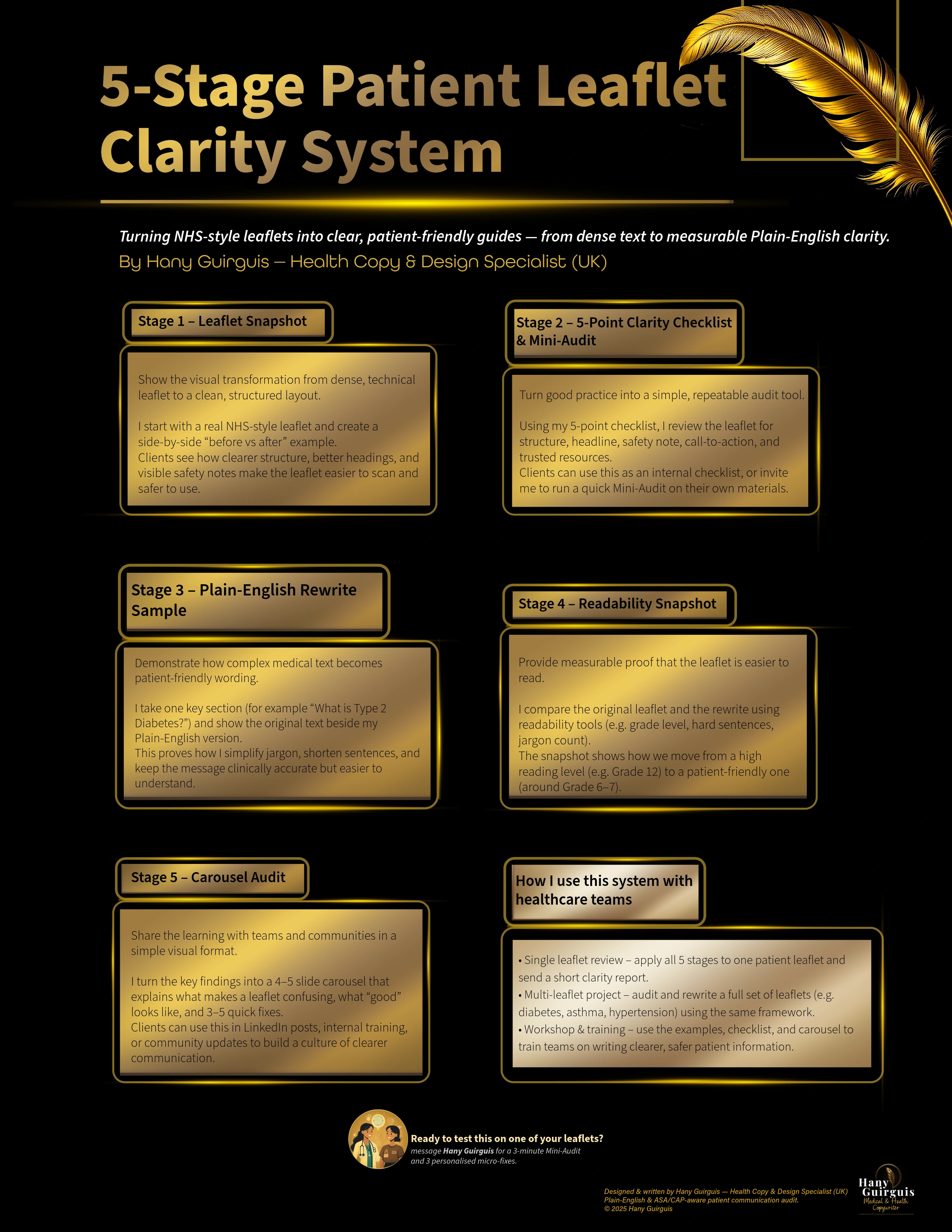 A clear, repeatable process showing how I transform medical information into safe, patient-friendly communication — from research to delivery.