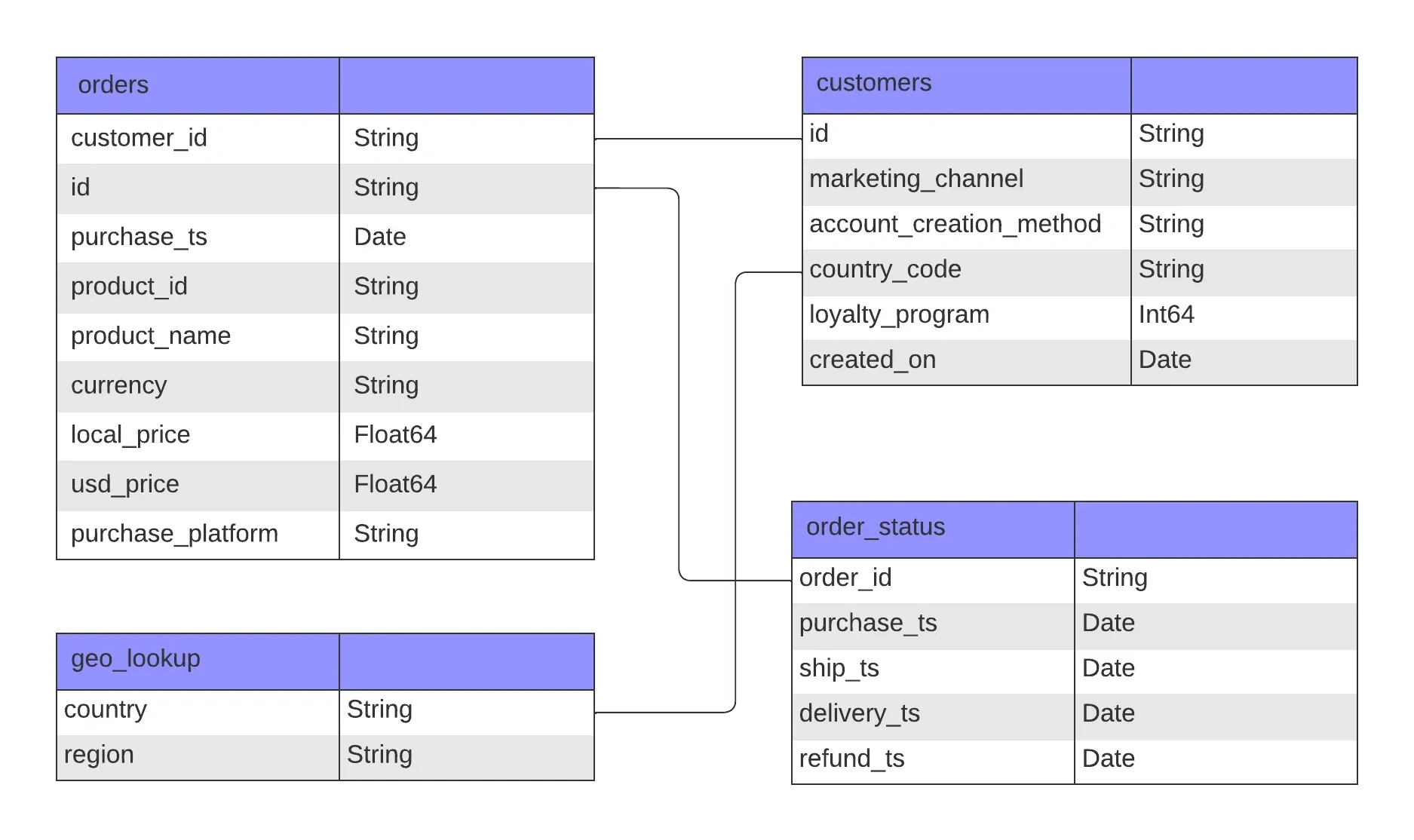 Below is a small sample of some of the tables and datamodelling done for the project. The final datamodel consisted of a handful of fact tables containing information about website funnel visits, leads, bookings and sales, as well as multiple dimension tables containing demographic information, orders, product bundle etc.