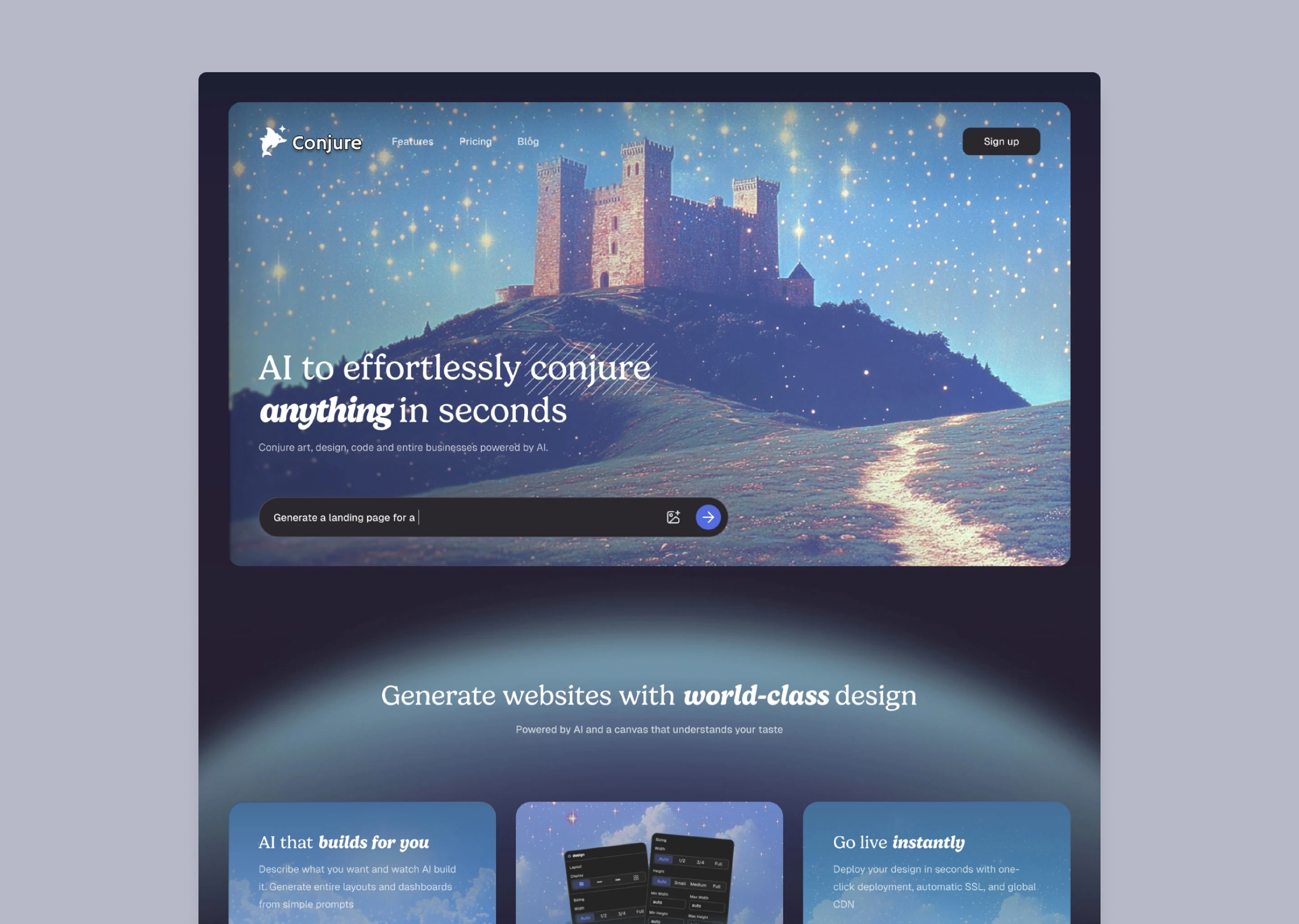 Conjure is a tool that lets users make landing pages using AI. They wanted a hero and a landing page that was eye-catching and true to their brand.