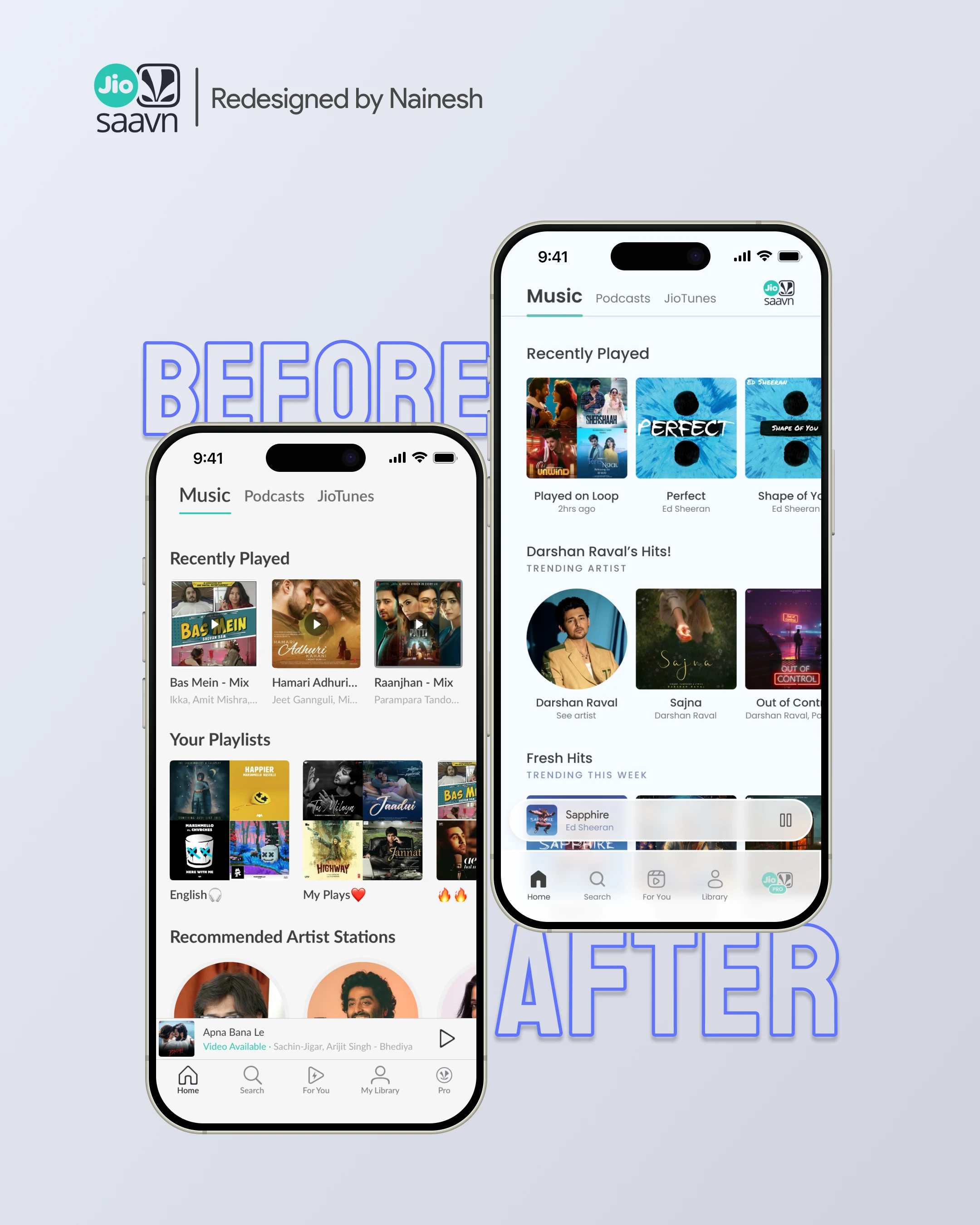 Redesigned JioSaavn with clean, intuitive UI focused on better navigation, content hierarchy, and an improved listening experience across light and dark modes.