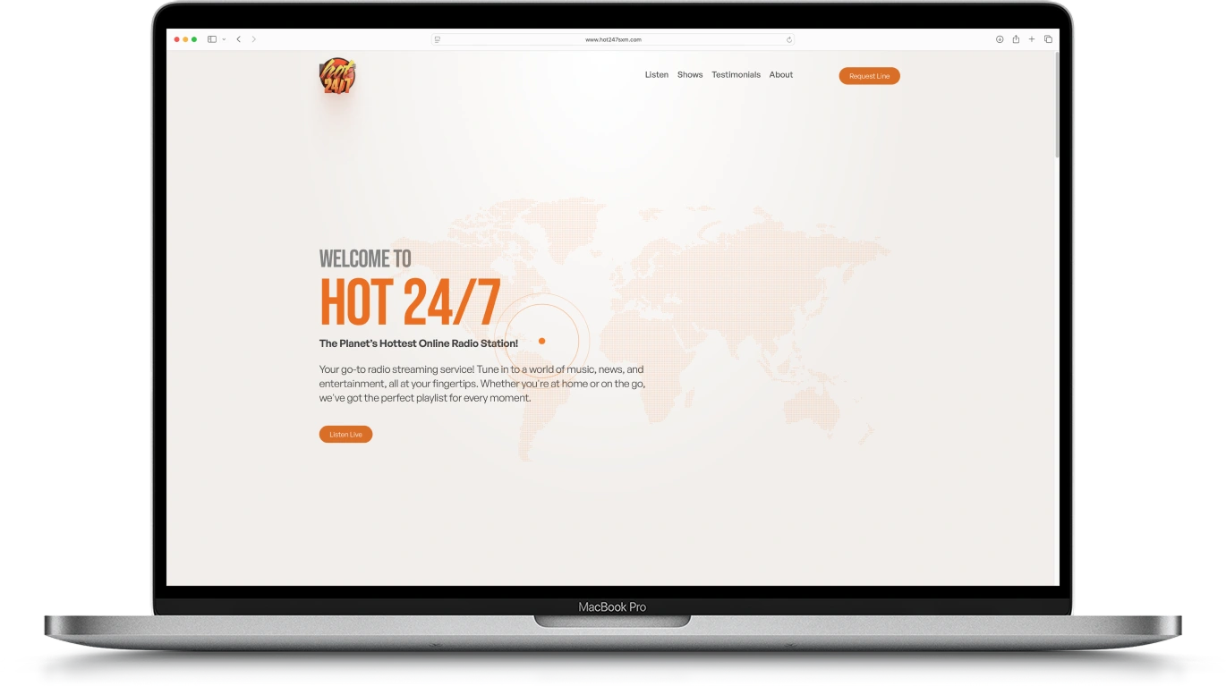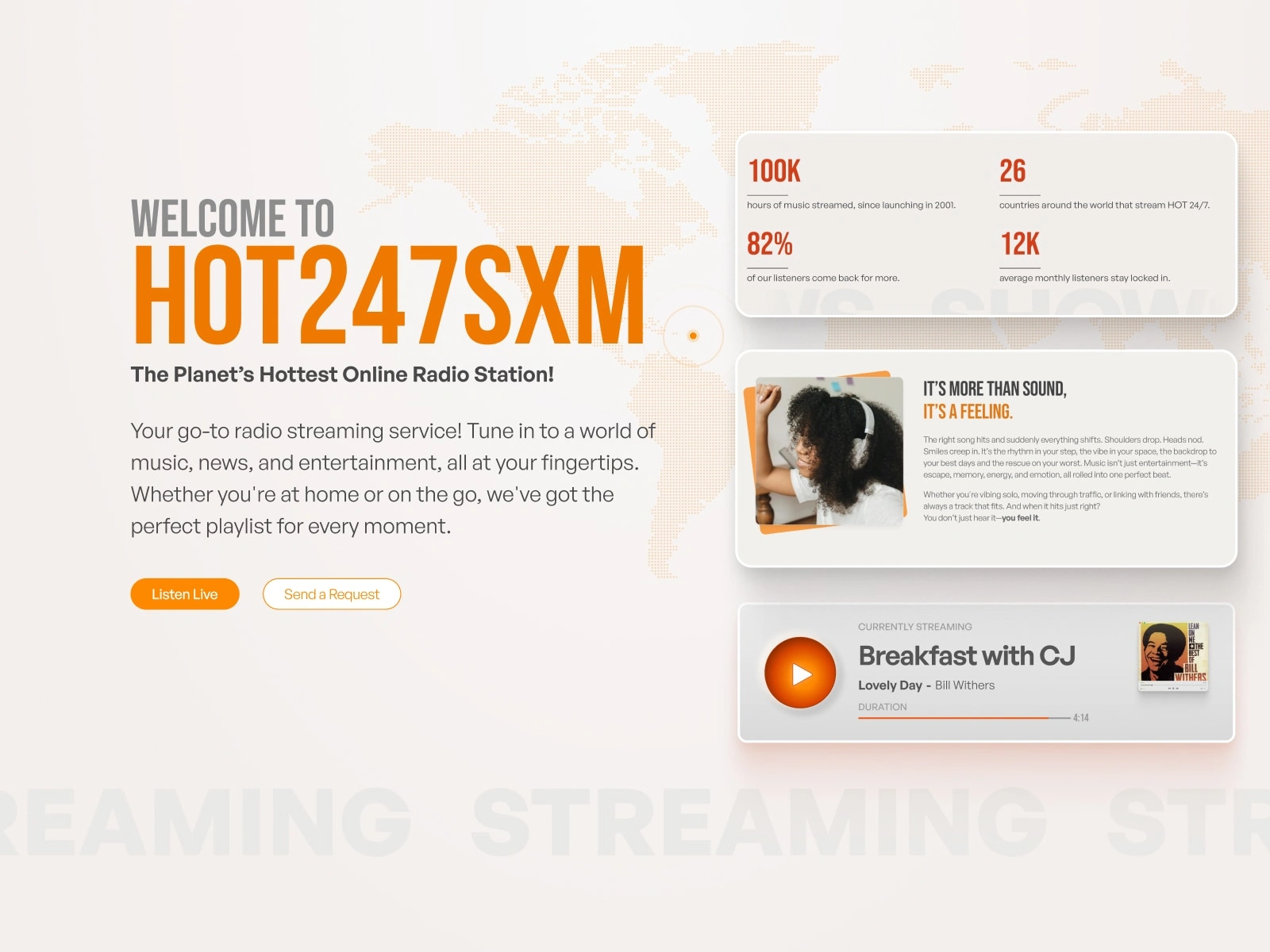 Redesign of Hot247SXM's, an online radio station station, website. The project goal was to create a fast, mobile-first website that could stream live music, and reflect the bold, energetic identity behind the station’s brand.