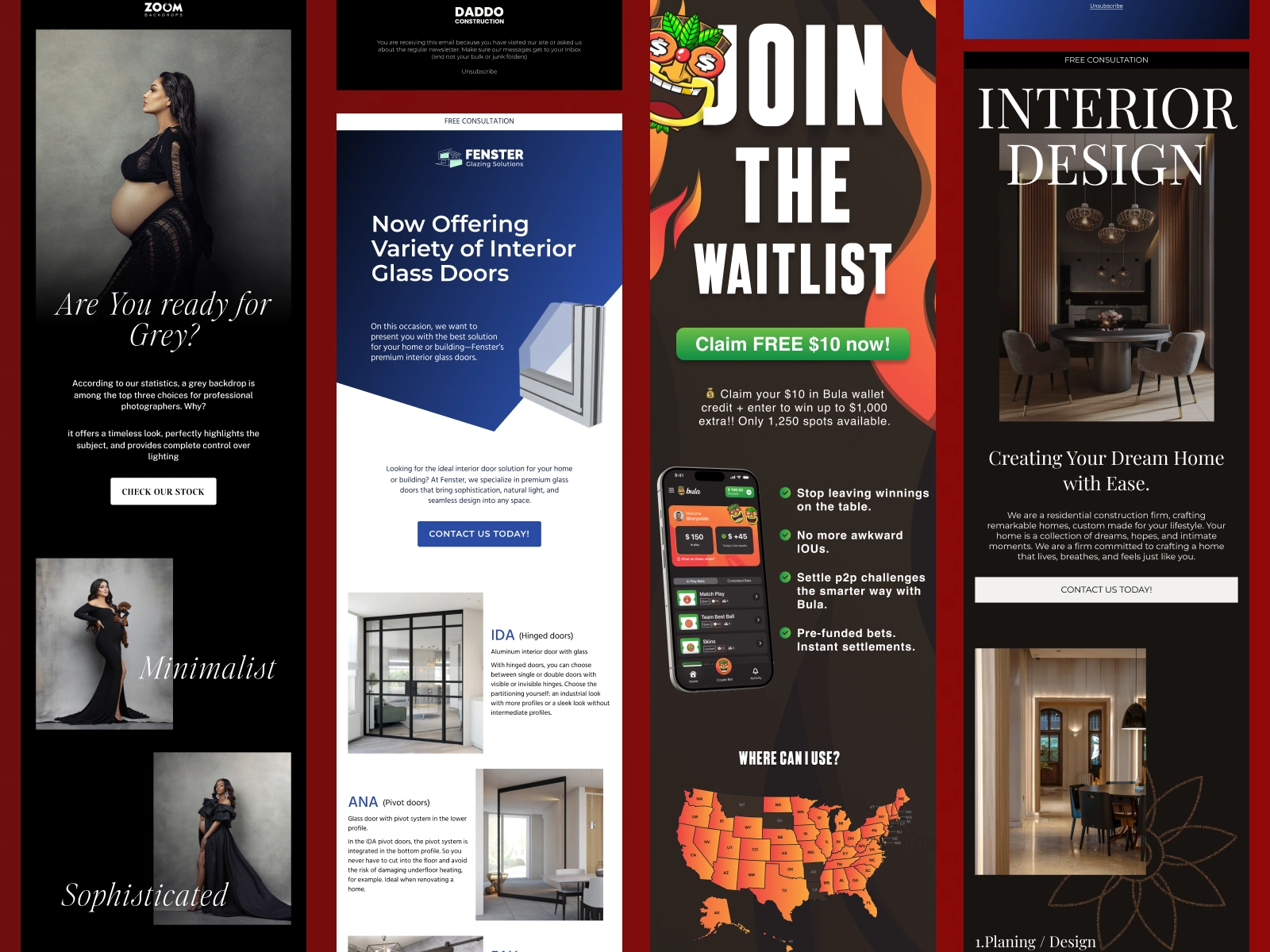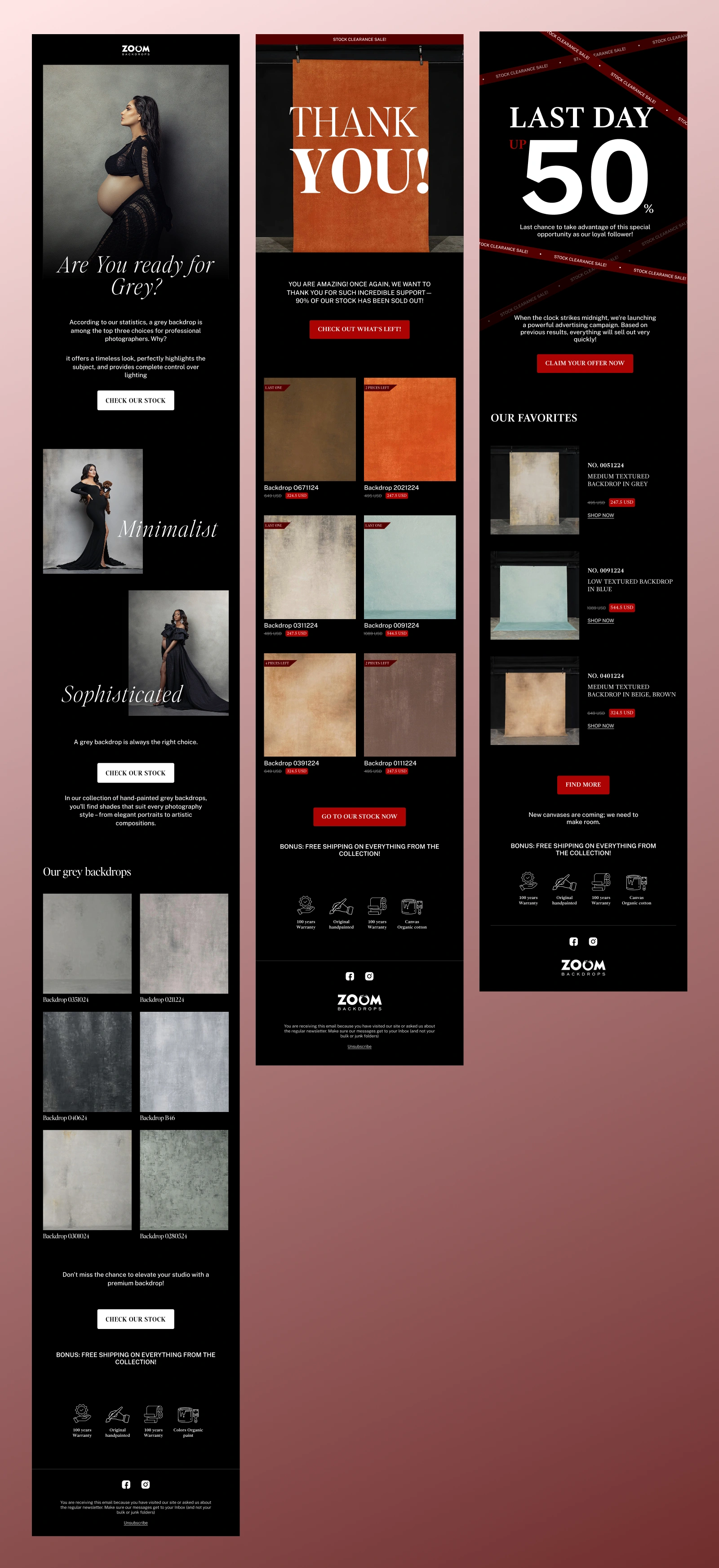 These emails were created with the goal of increasing sales and are optimized for Klaviyo, Mailchimp, and similar platforms. In this case study, I’ve included some of my previous work. In most projects, I design the full email flow—typically 5–7 emails. I’ve worked on campaigns for various industries, mainly e-commerce, but also service-based businesses.