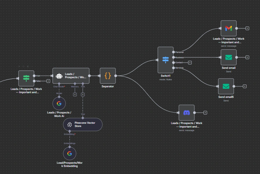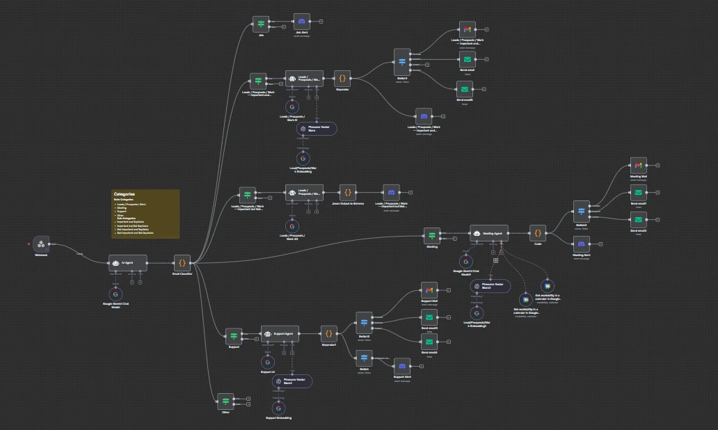 This workflow is a multi-layered AI email responder built to eliminate missed opportunities and automate communication without losing human context. It reads each incoming email, classifies it into precise categories and subcategories, and triggers specialized agents for accurate replies, alerts, or meeting scheduling. Using RAG-based company knowledge, the system ensures every reply aligns with internal values, policies, and tone while escalating critical messages instantly.