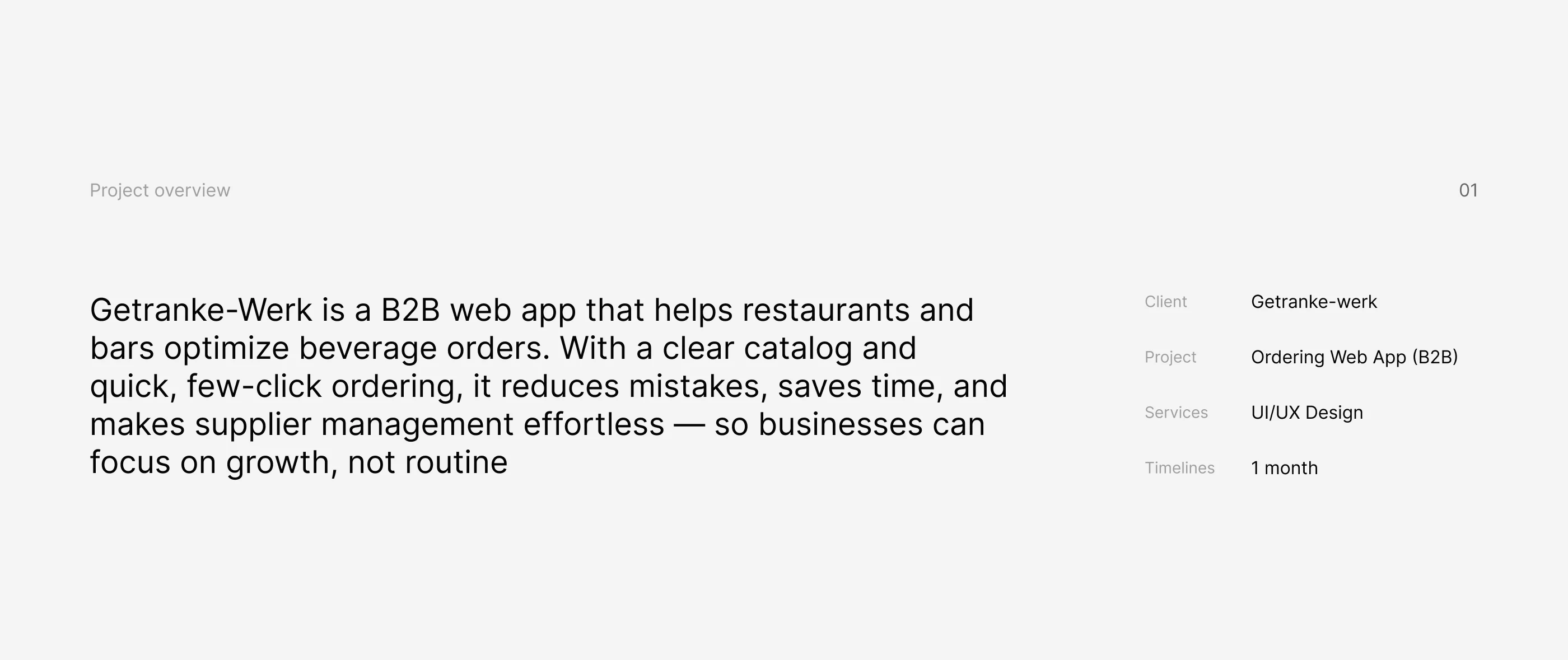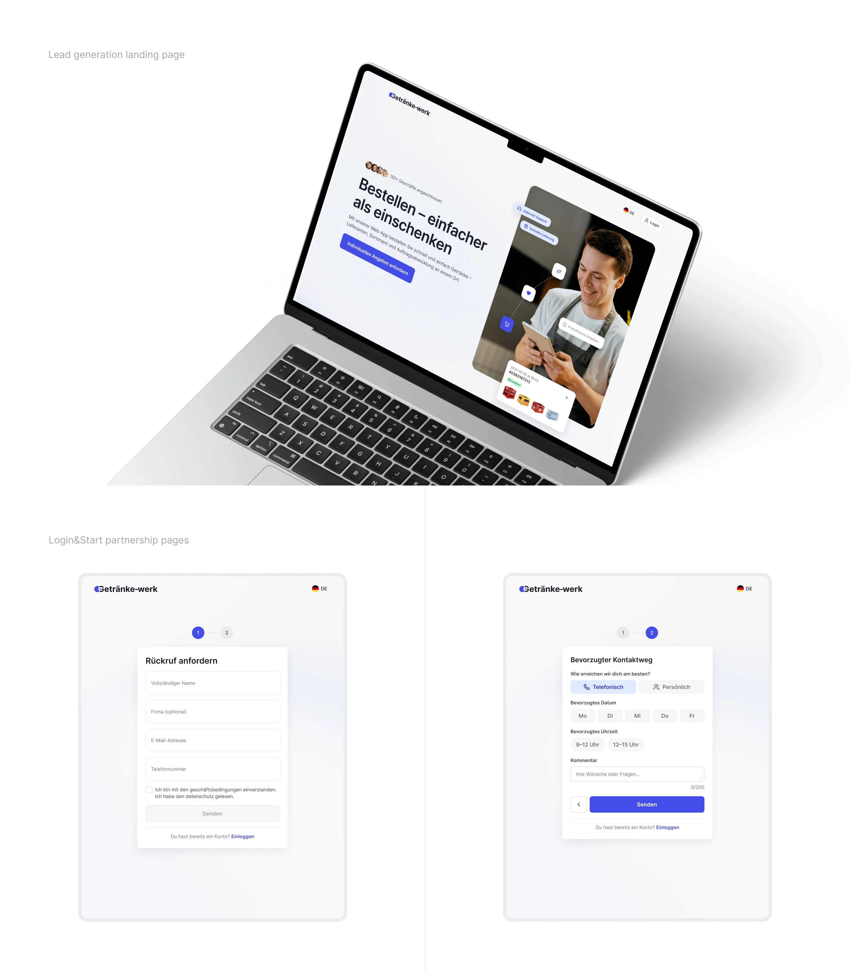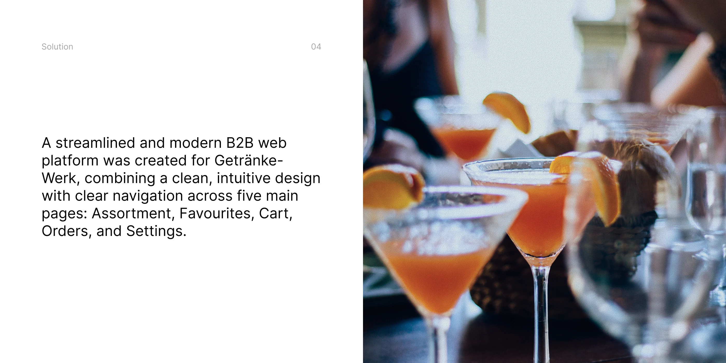 A streamlined and modern B2B web platform was created for Getränke-Werk, combining a clean, intuitive design with clear navigation across five main pages.