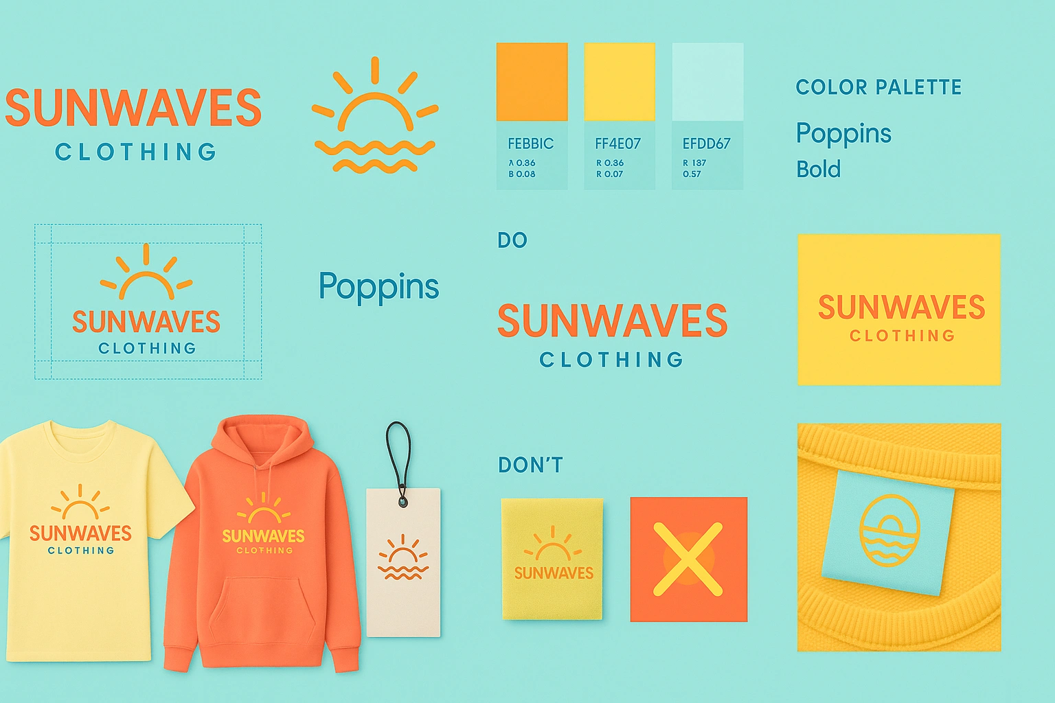 Created a vibrant identity for Sunwaves Clothing with bold colors, playful logo, and versatile mockups, establishing a fresh and upbeat brand presence.