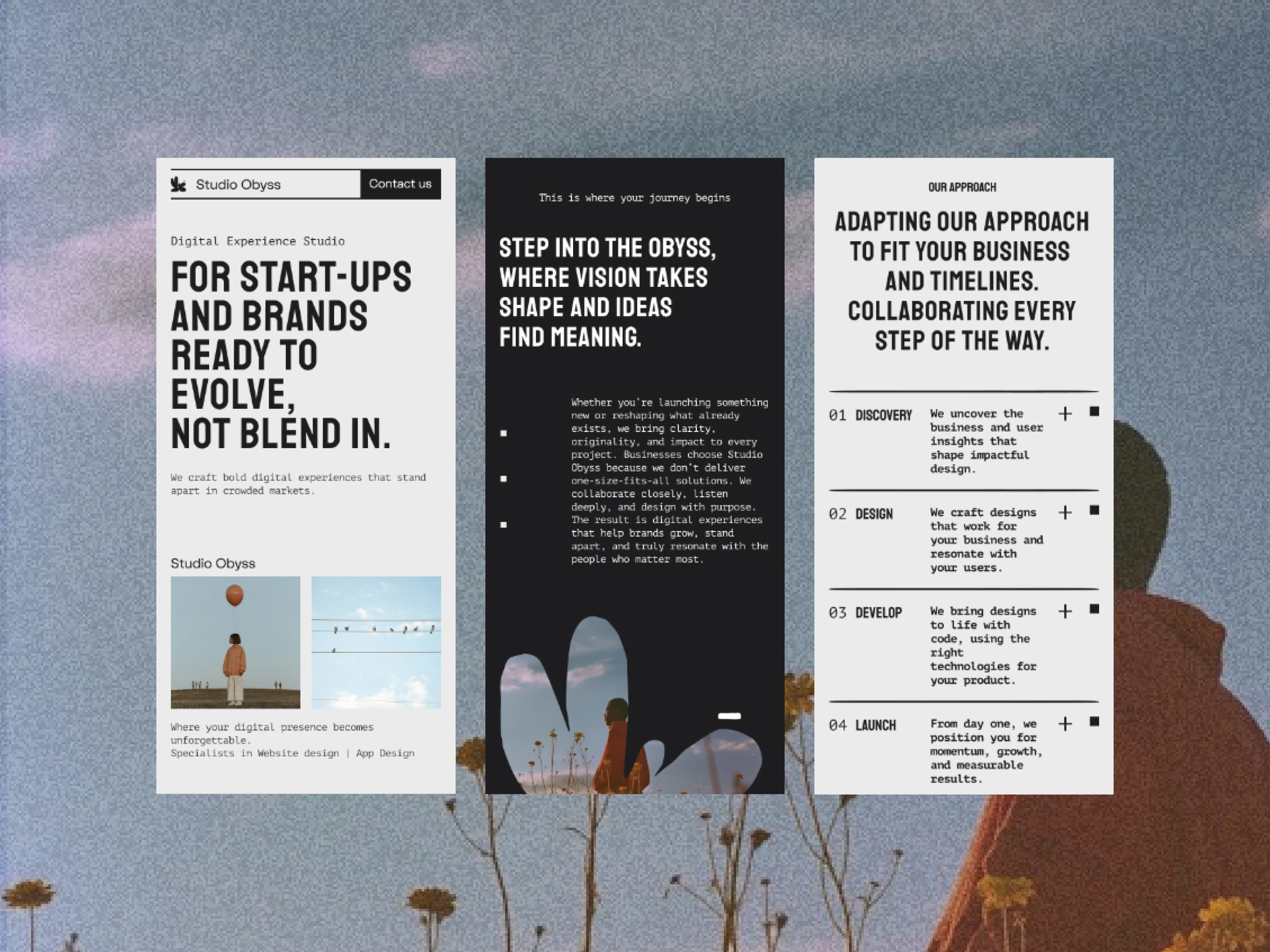 Studio Obyss was founded to create digital experiences and brand identities with depth, clarity, and intention. The studio focuses on thoughtful design grounded in strategy and emotional resonance, favouring originality over trends. Its process is collaborative and exploratory, built on curiosity and a commitment to meaningful work.