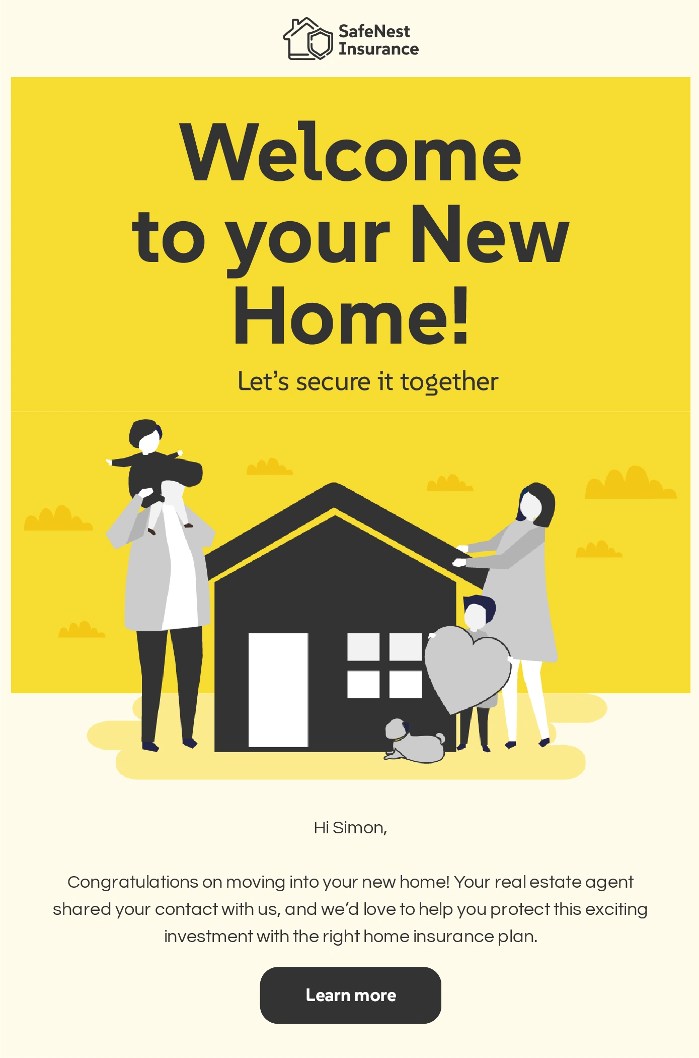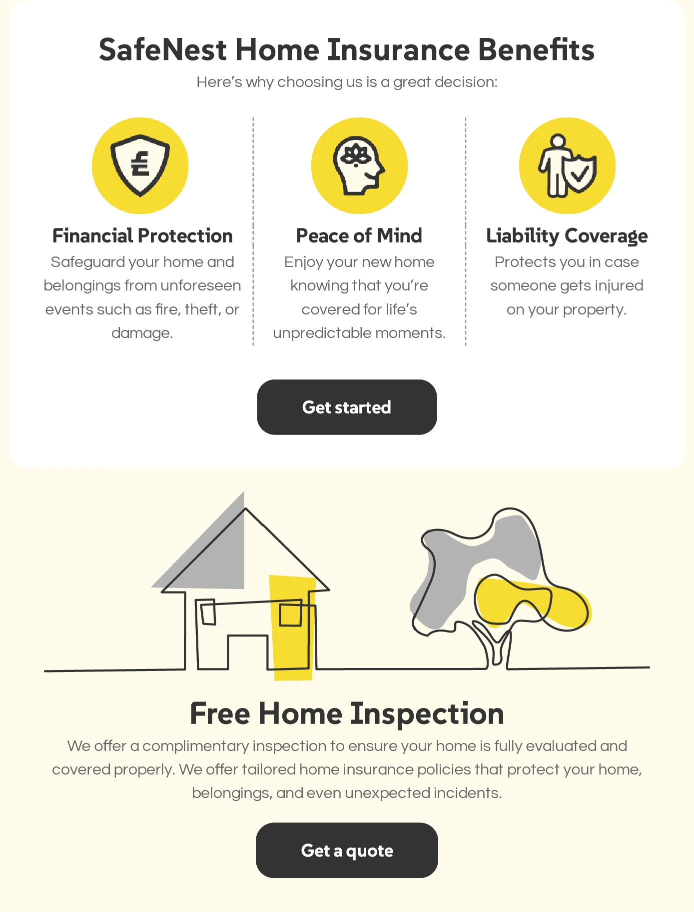 This home insurance email design combines a sleek and modern aesthetic with the use of yellow and dark grey for a striking contrast. The yellow adds a welcoming, optimistic feel, ideal for building trust, while the dark grey provides a sense of sophistication and stability. A prominent dark grey call-to-action button ensures clarity and stands out, guiding users to take action.