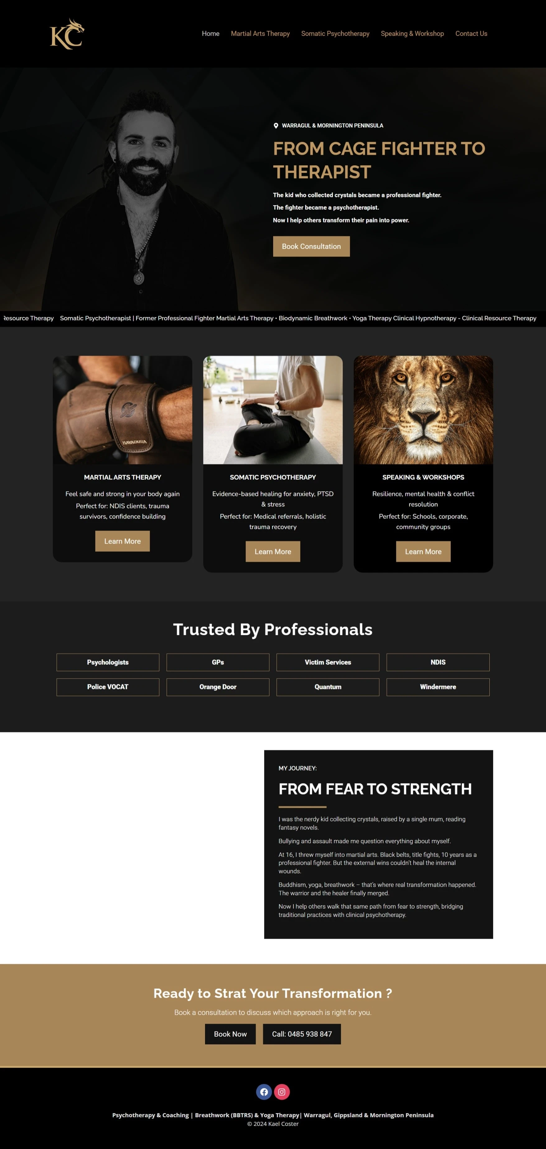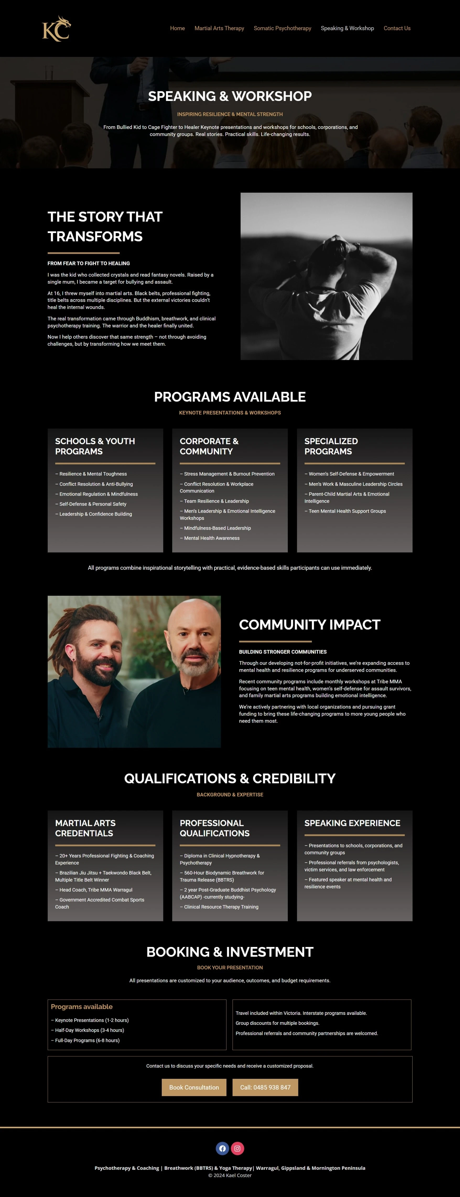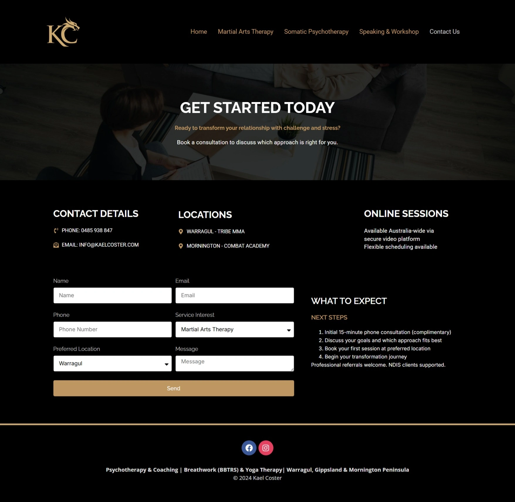 Kael Coster is a personal‑development and wellness brand offering services centered around yoga therapy, breathwork, hypnotherapy/psychotherapy, martial arts, and holistic wellness coaching. Their offerings are designed for individuals seeking physical, mental, and spiritual well‑being through conscious movement, therapy, and self‑empowerment tools.