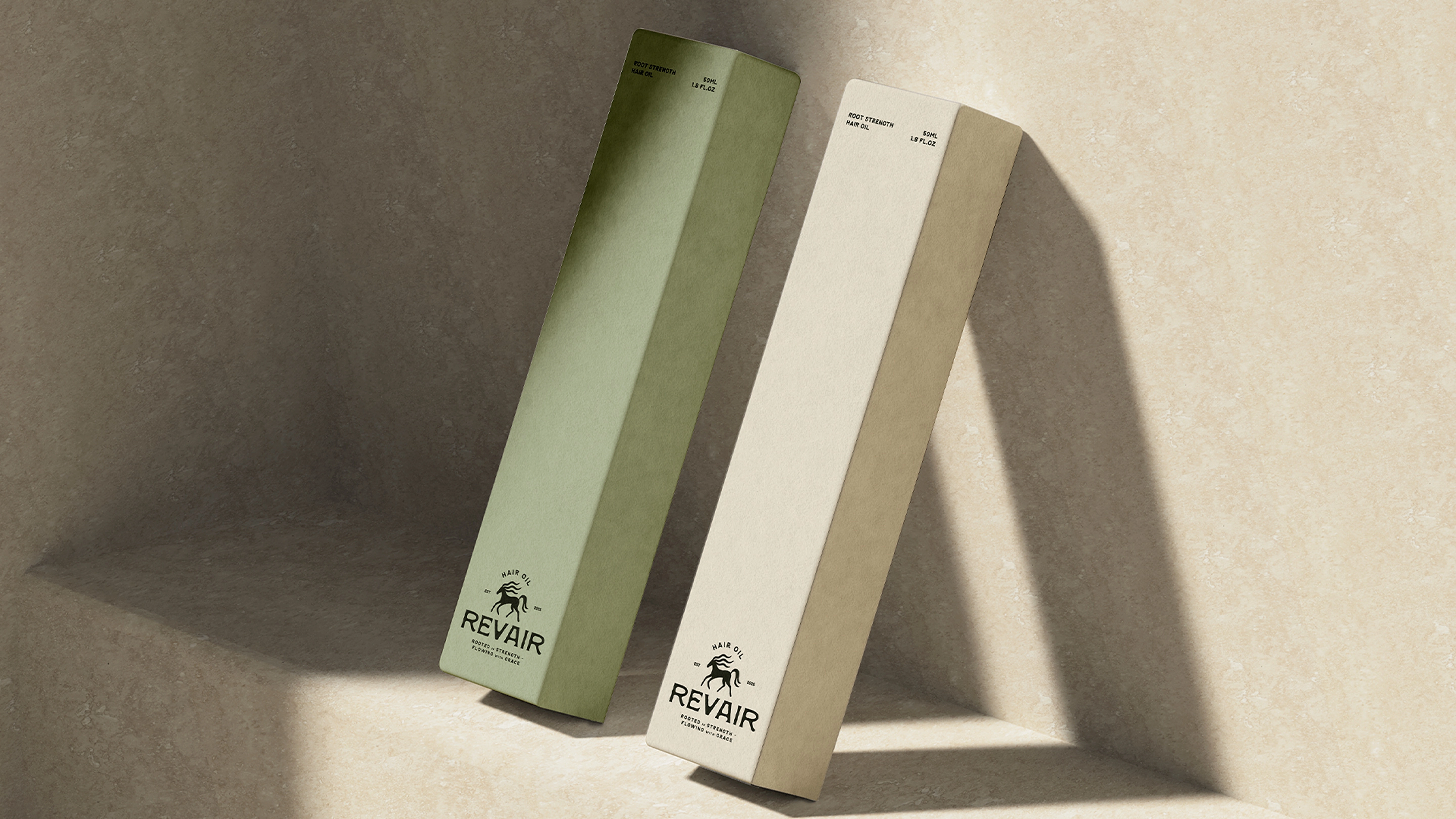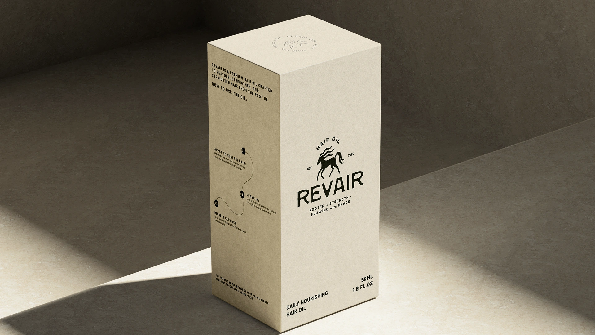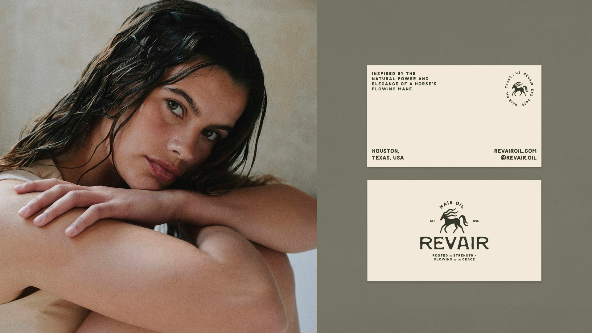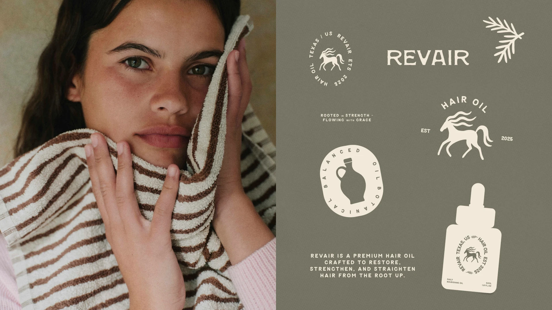 Revair is a conceptual brand identity for a hair oil brand focused on strength, growth, and grounded beauty.