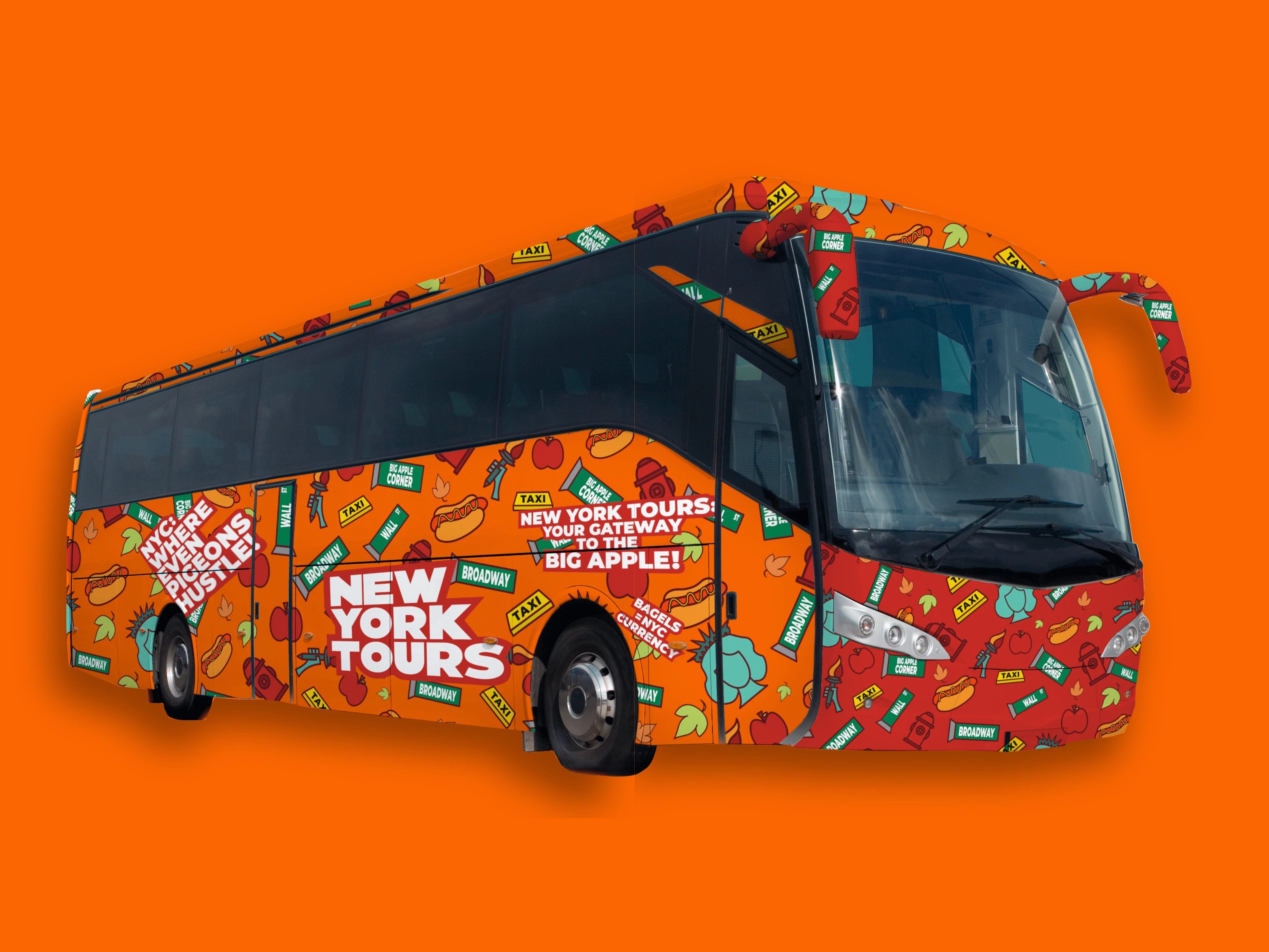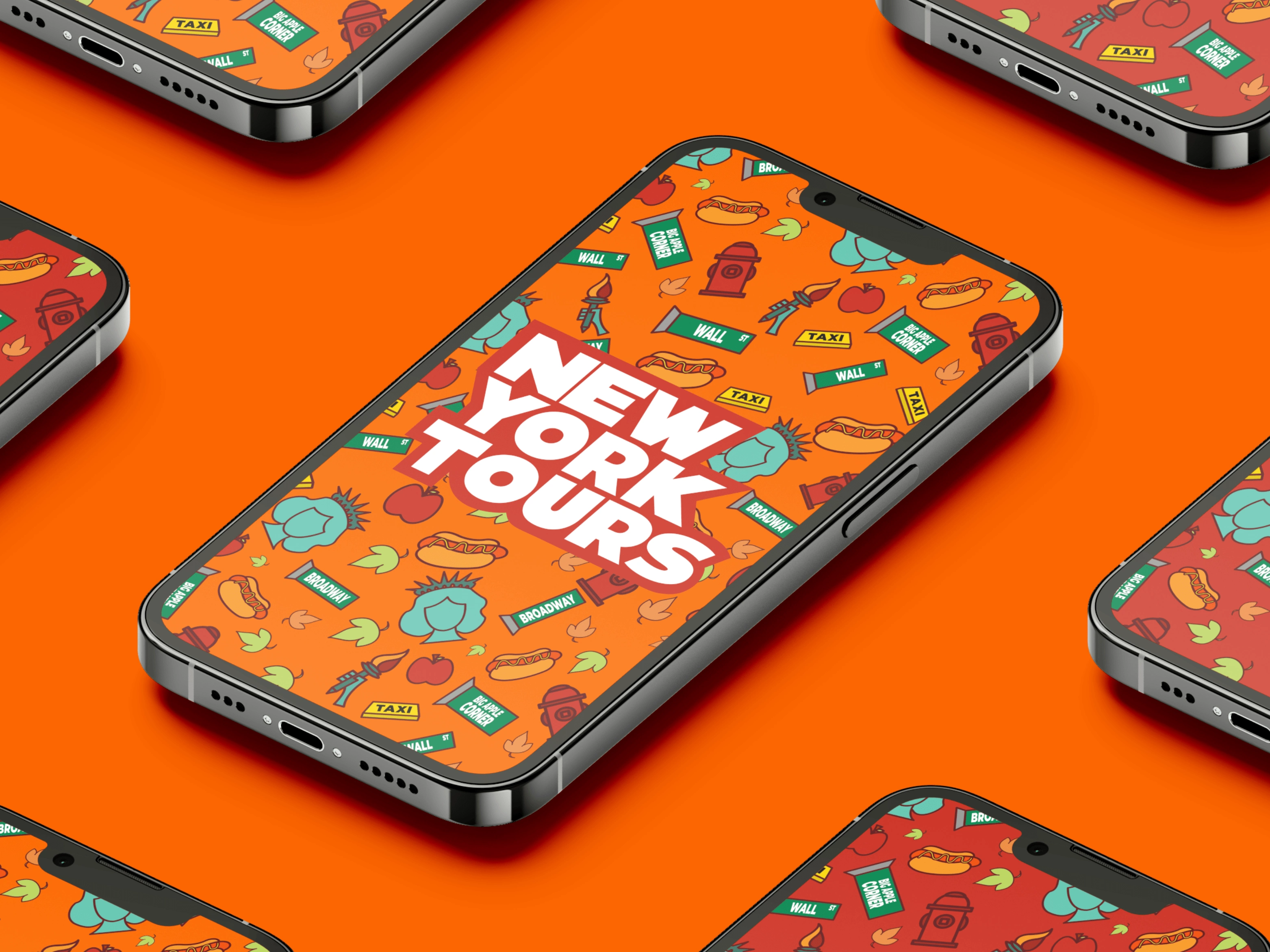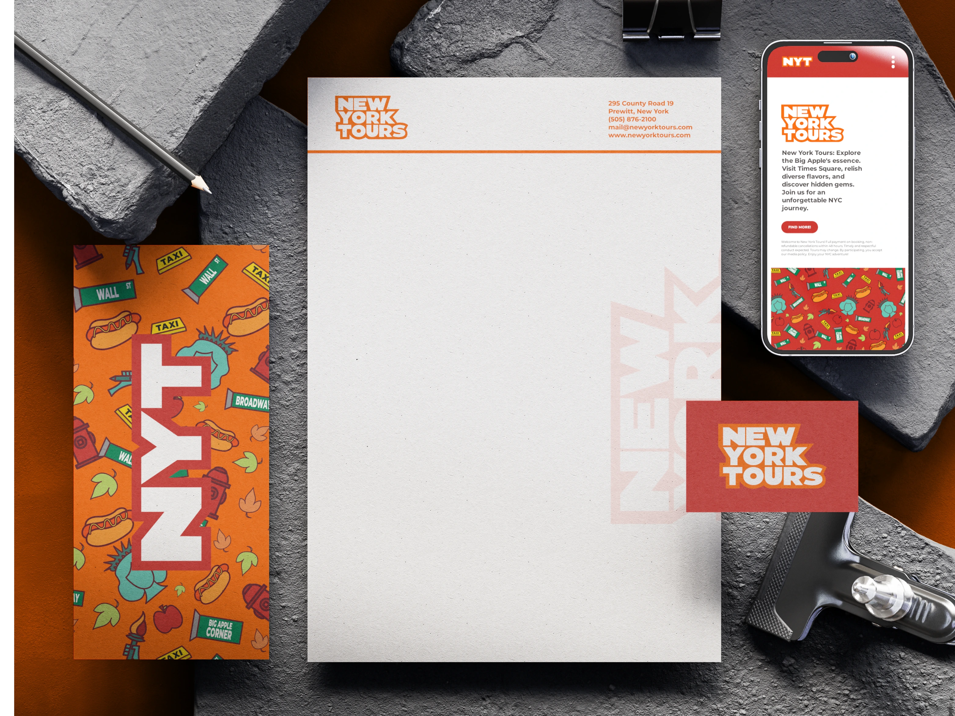 A minimalist logo and brand identity were created for New York Tours, featuring playful city elements and witty copy.