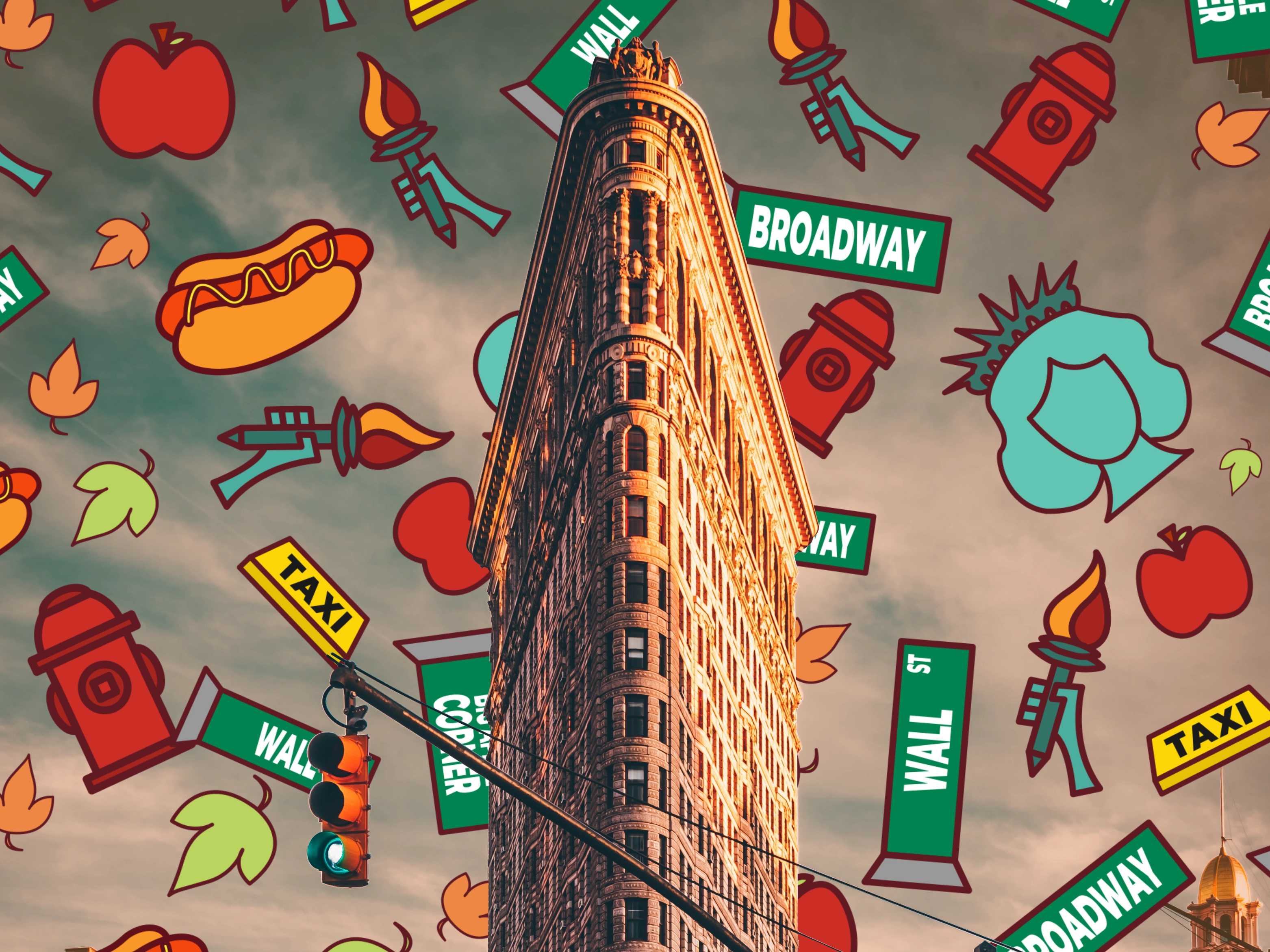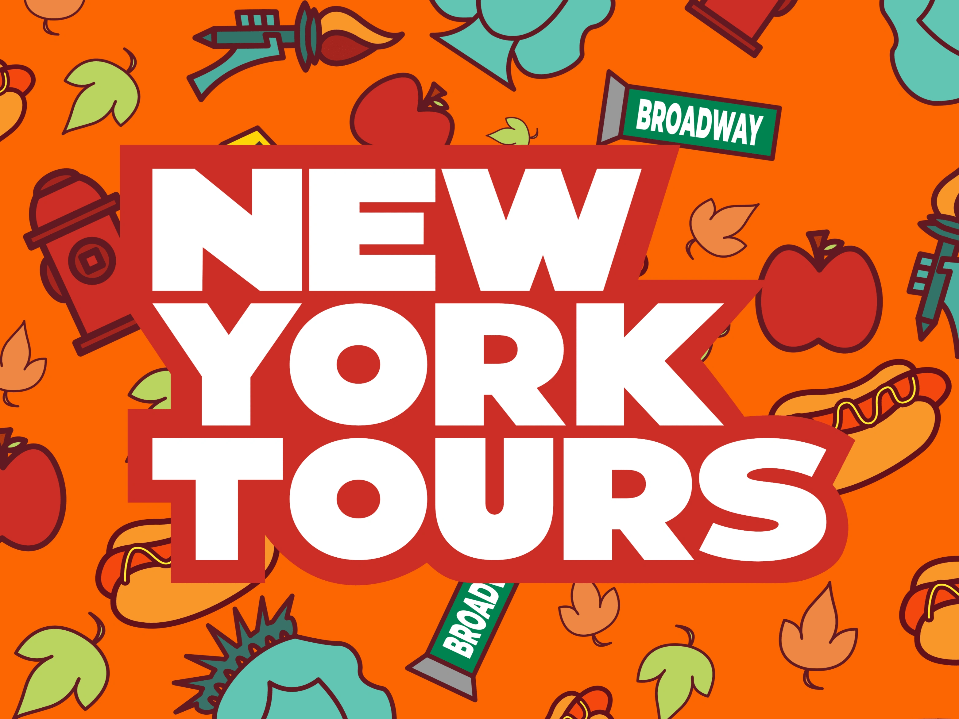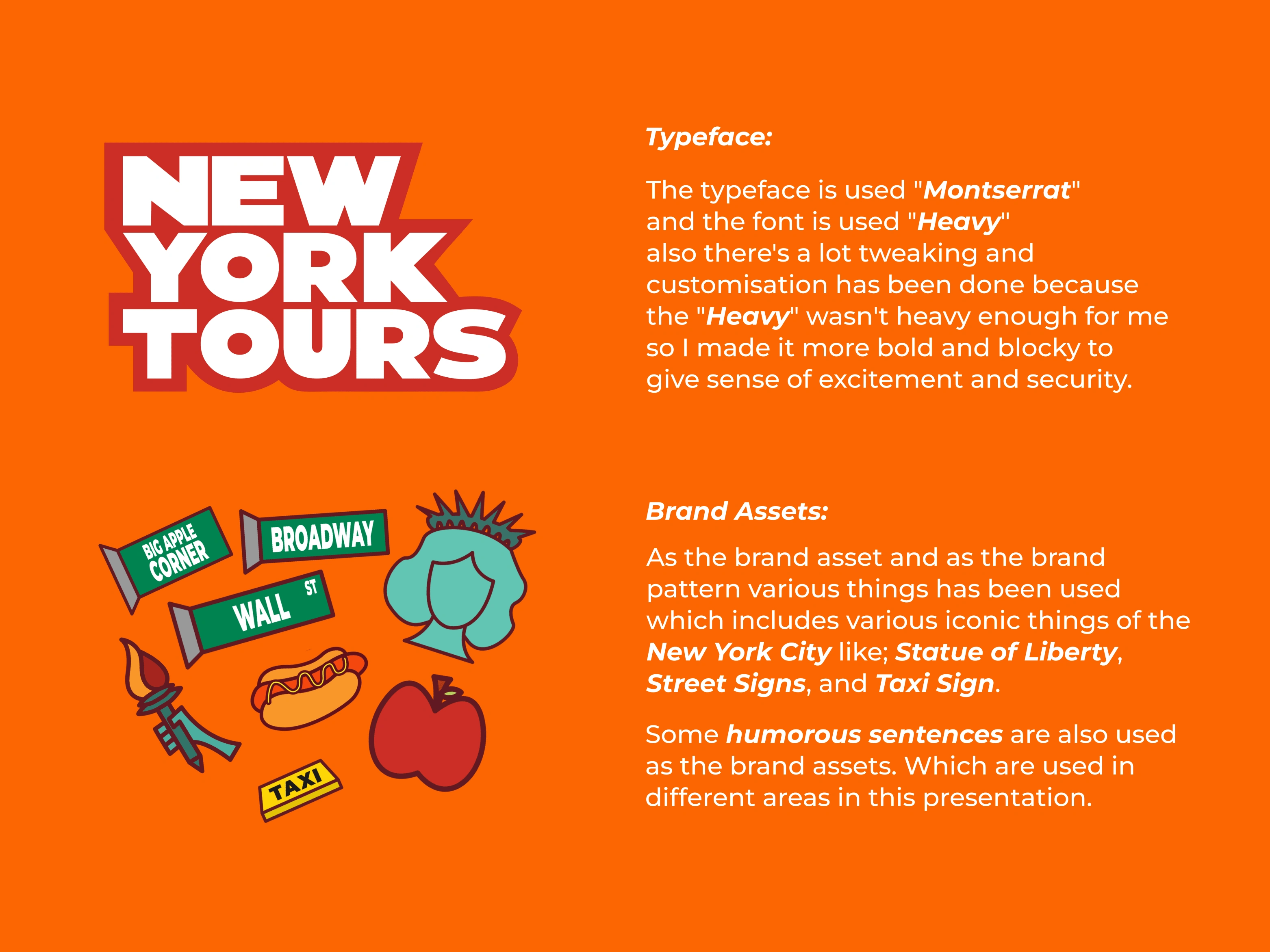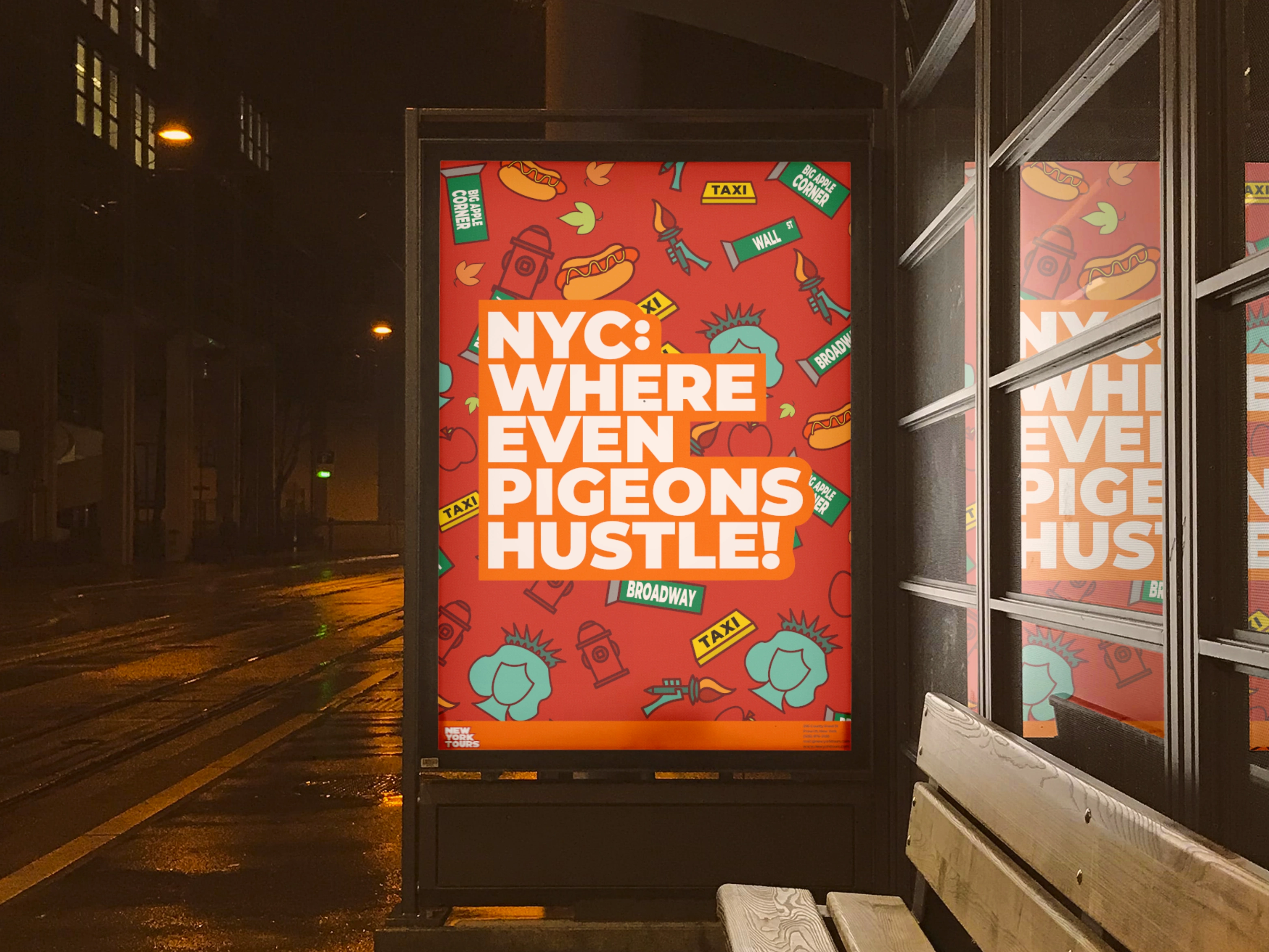 A minimalist logo and brand identity were created for New York Tours, featuring playful city elements and witty copy.