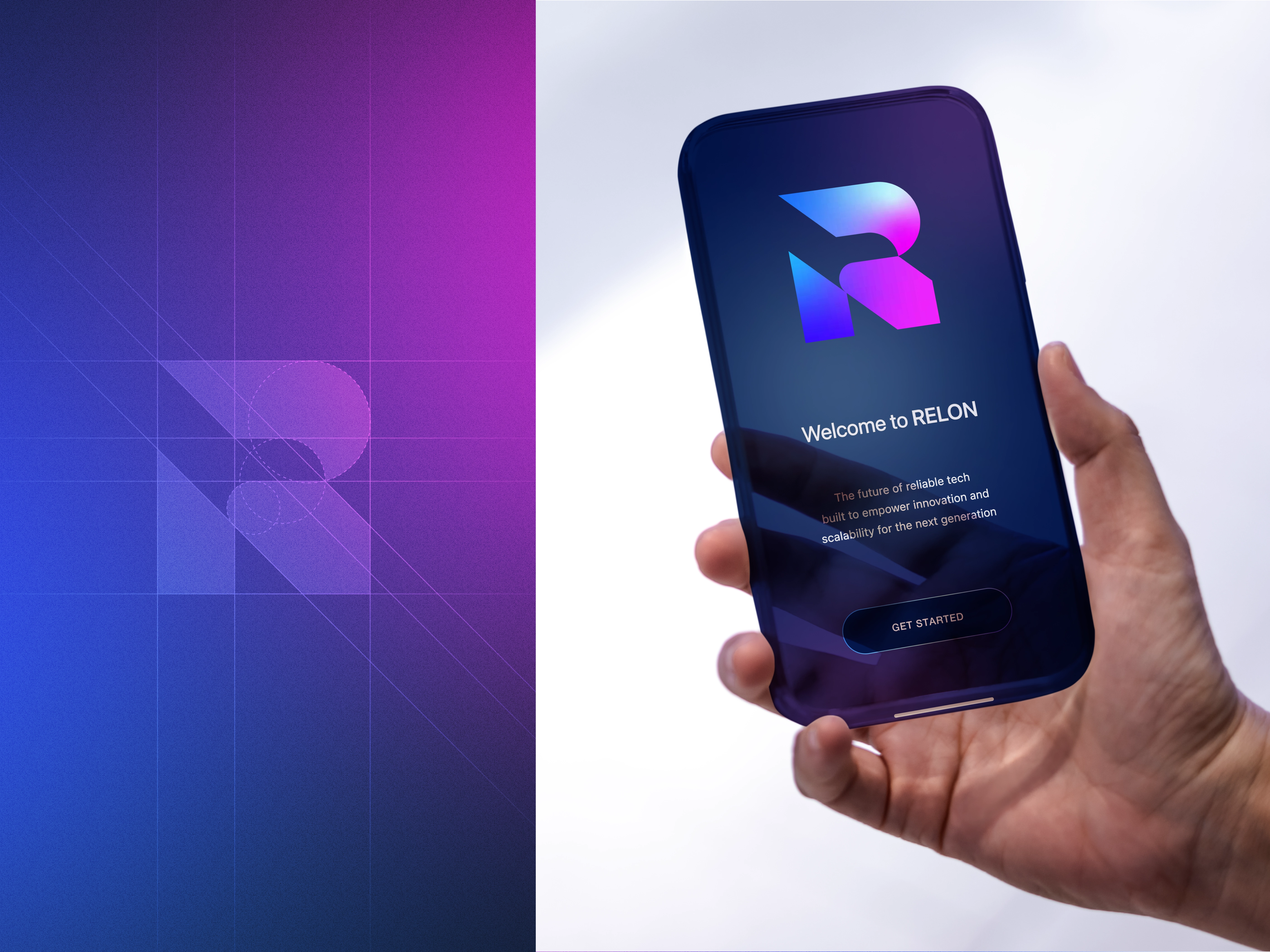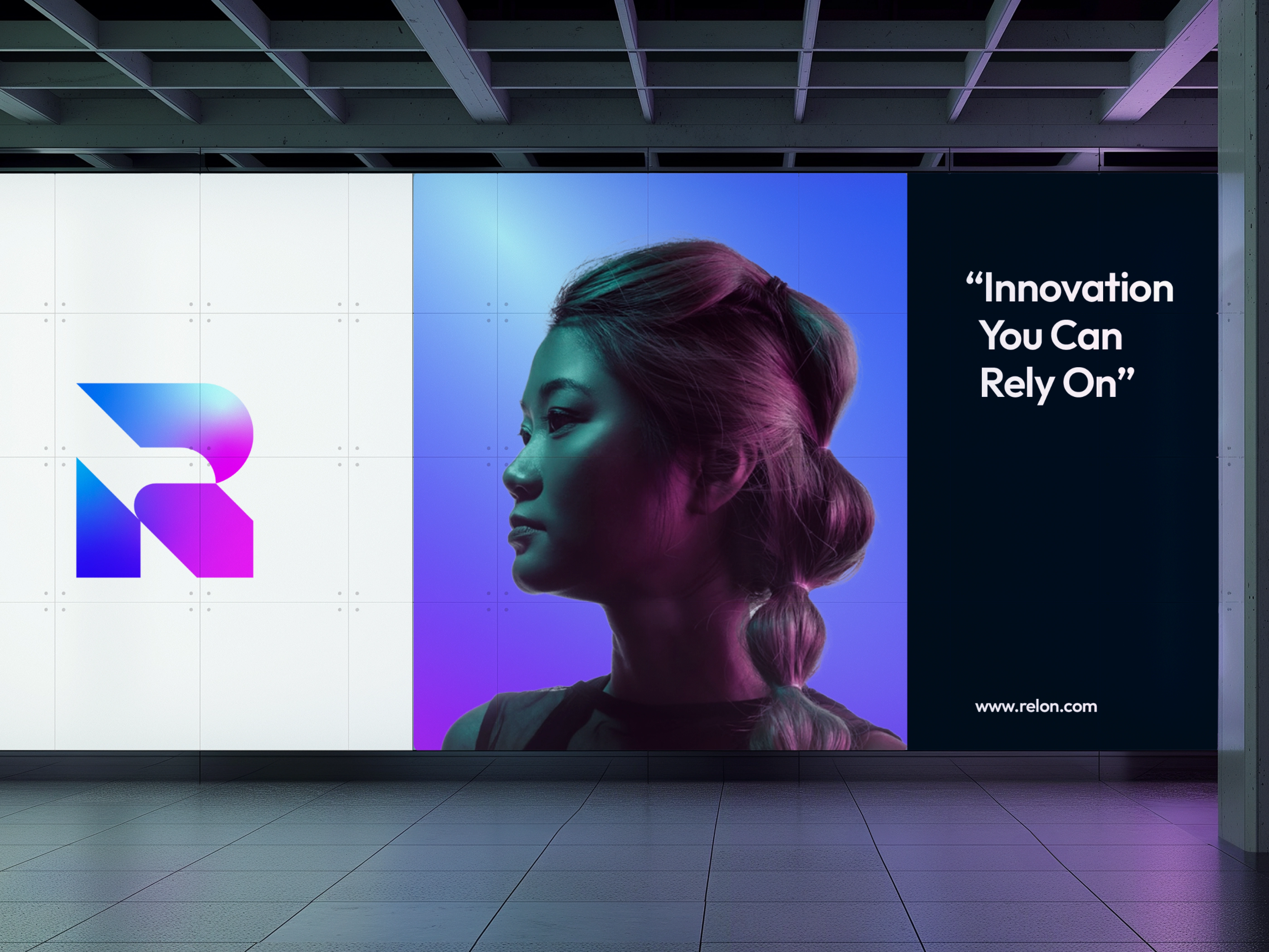 Introducing Relon, a bold and futuristic tech brand built on the core values of reliability, scalability, and innovation. The visual identity combines a vibrant gradient of blue, purple, and pink with a clean lowercase sans-serif wordmark, creating a balance between trust and modern energy. The abstract “R” symbol represents motion, connectivity, and progress reflecting Relon’s mission to power the next generation of technology.