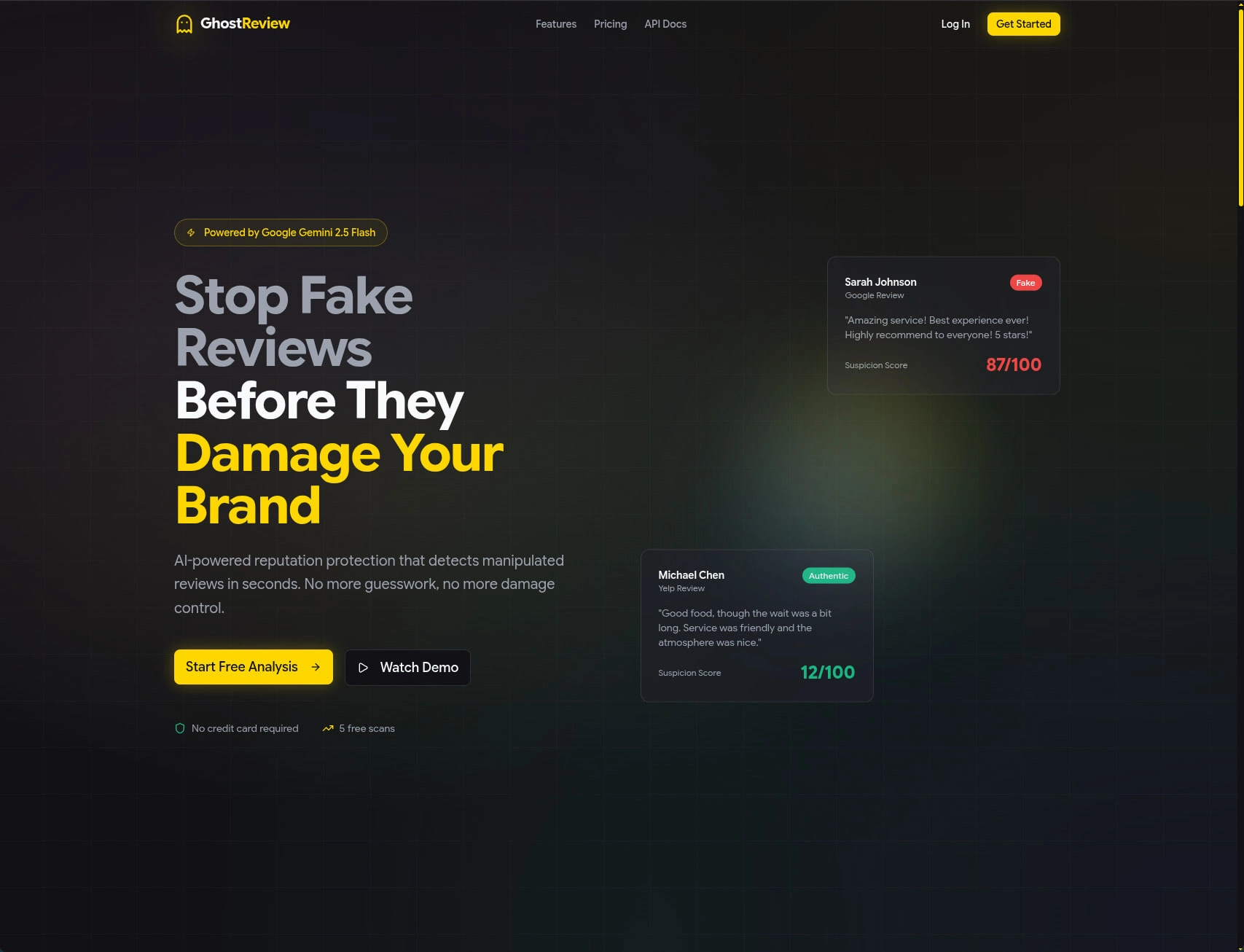 Real-time fake-review detection across Google, Yelp, TripAdvisor. AI scoring, alerts, and AI-generated dispute response templates for SMBs and agencies.