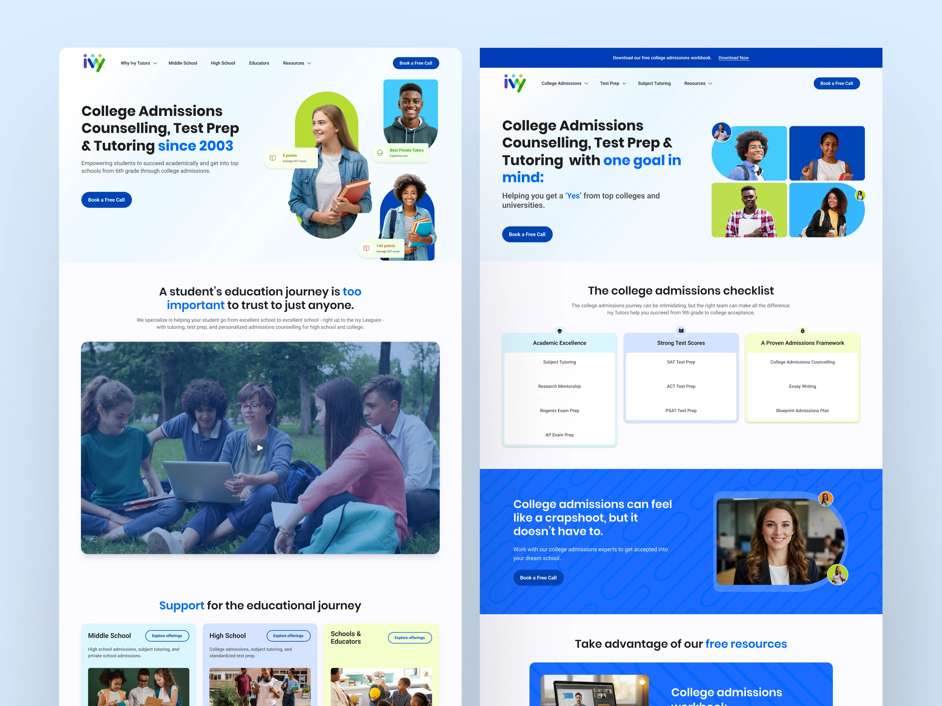 Hero Section: Clear value proposition, engaging student imagery, and a strong CTA (“Book a Free Call”) to drive conversions.
