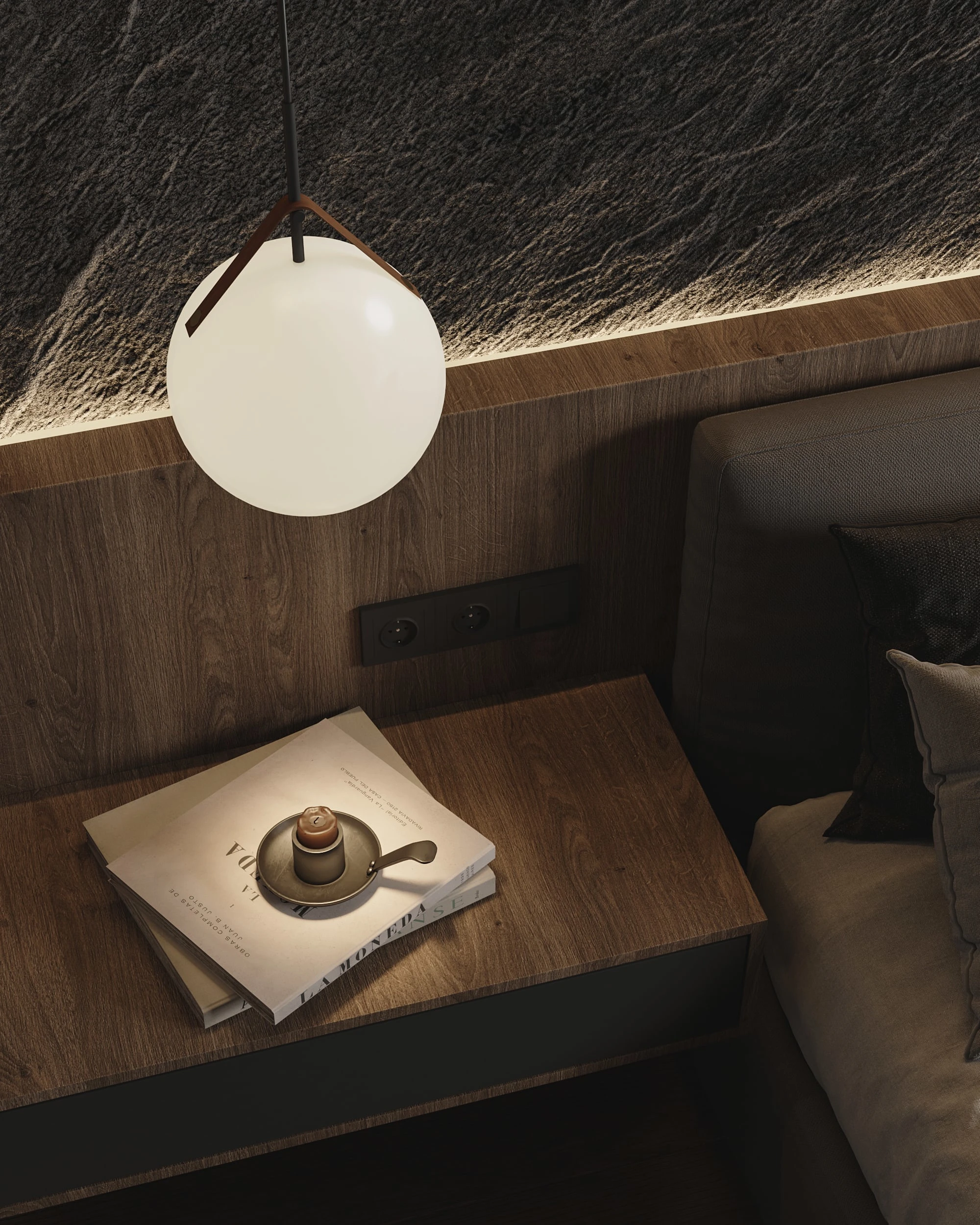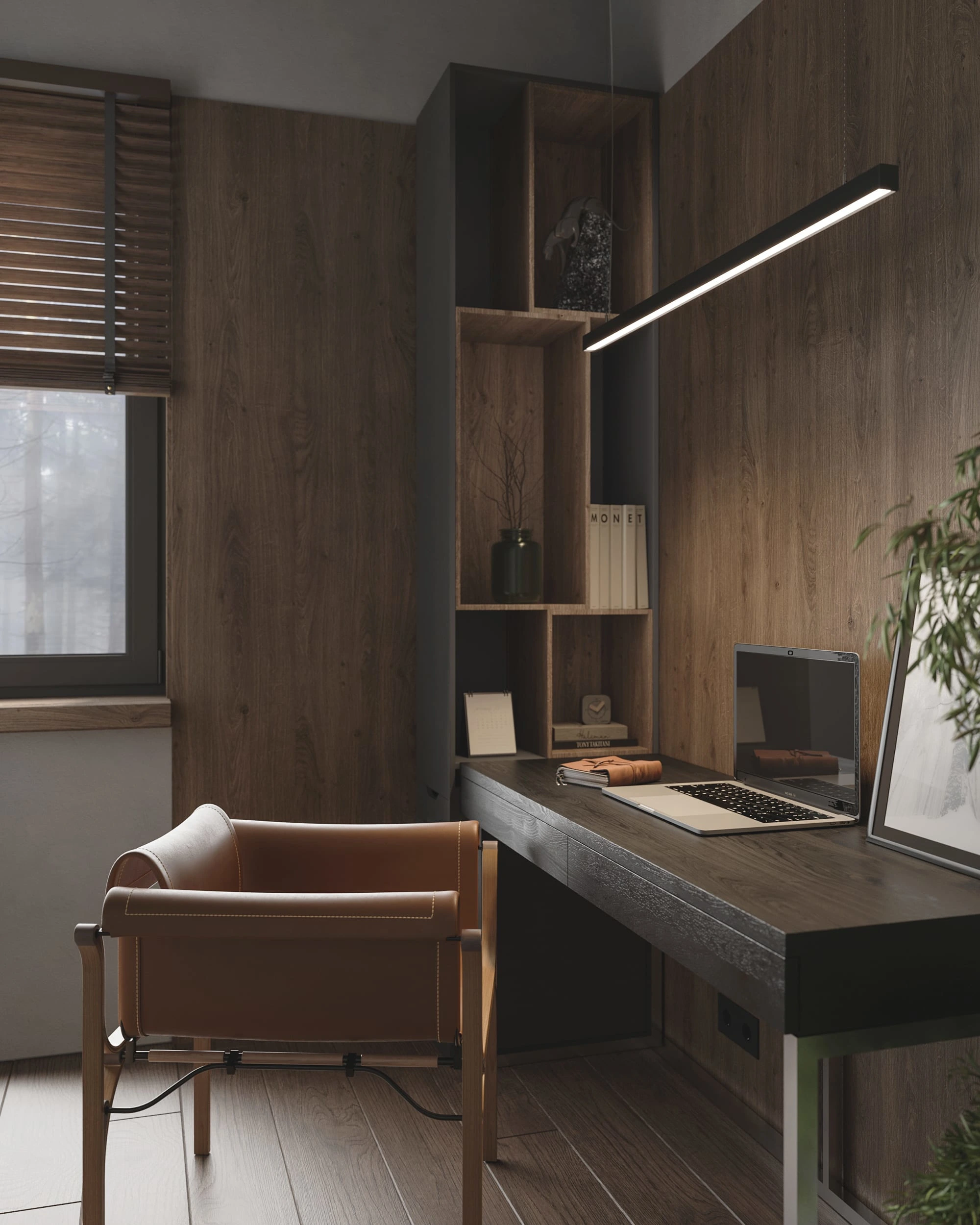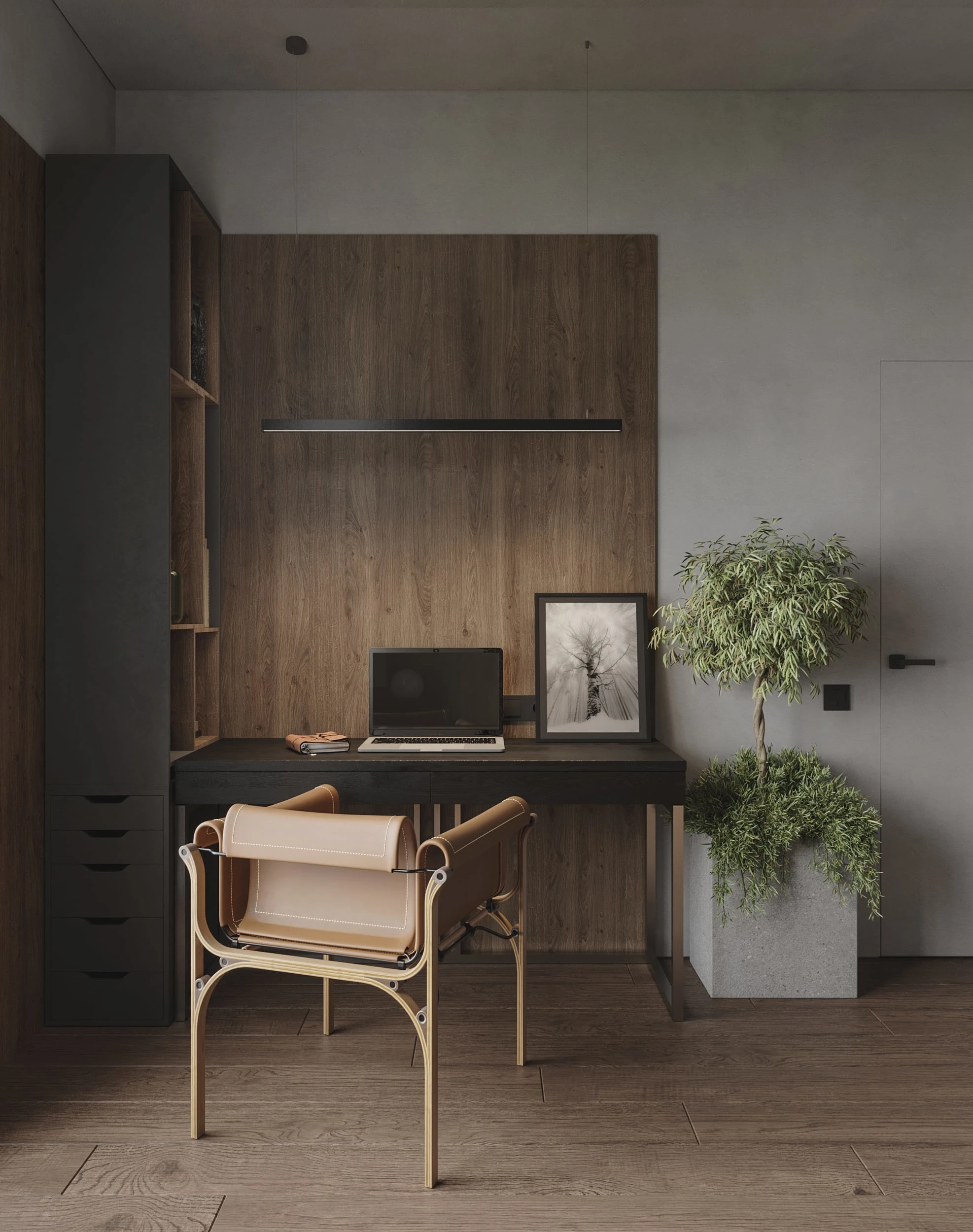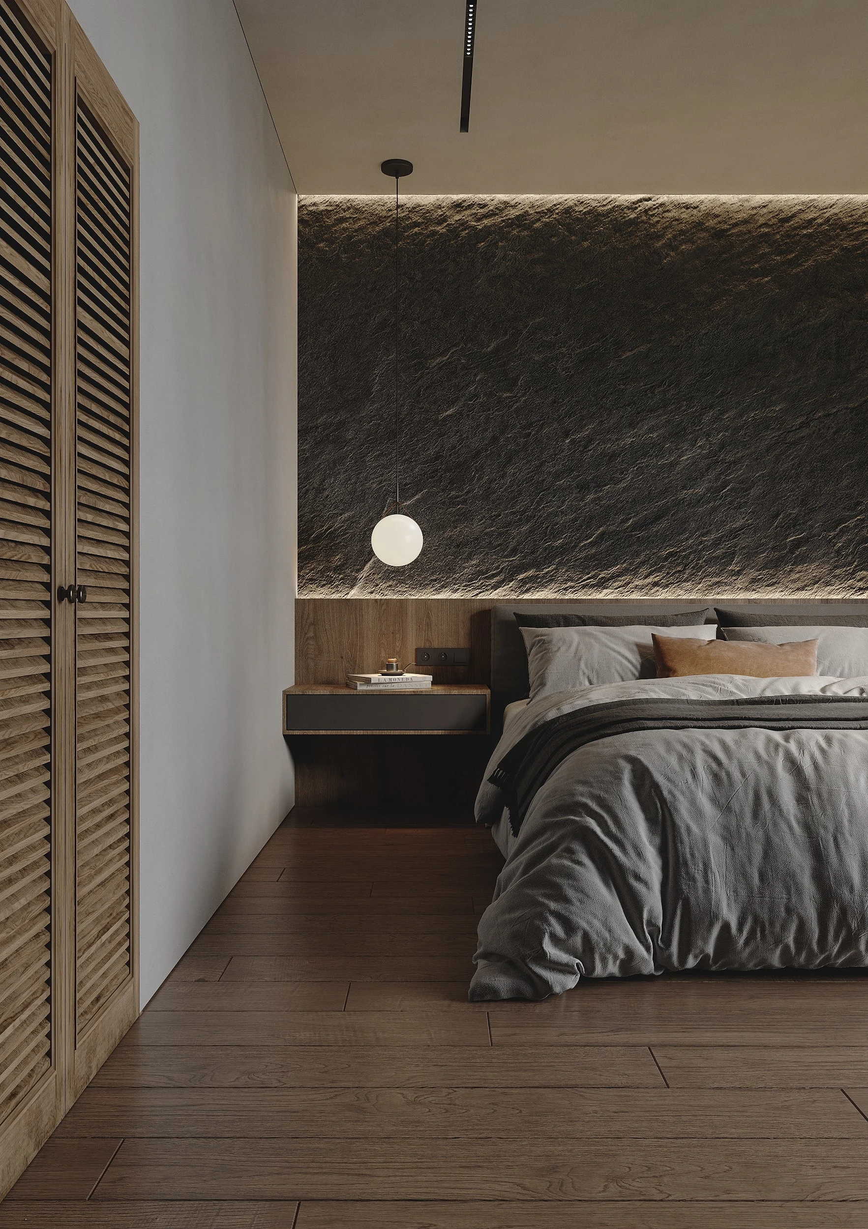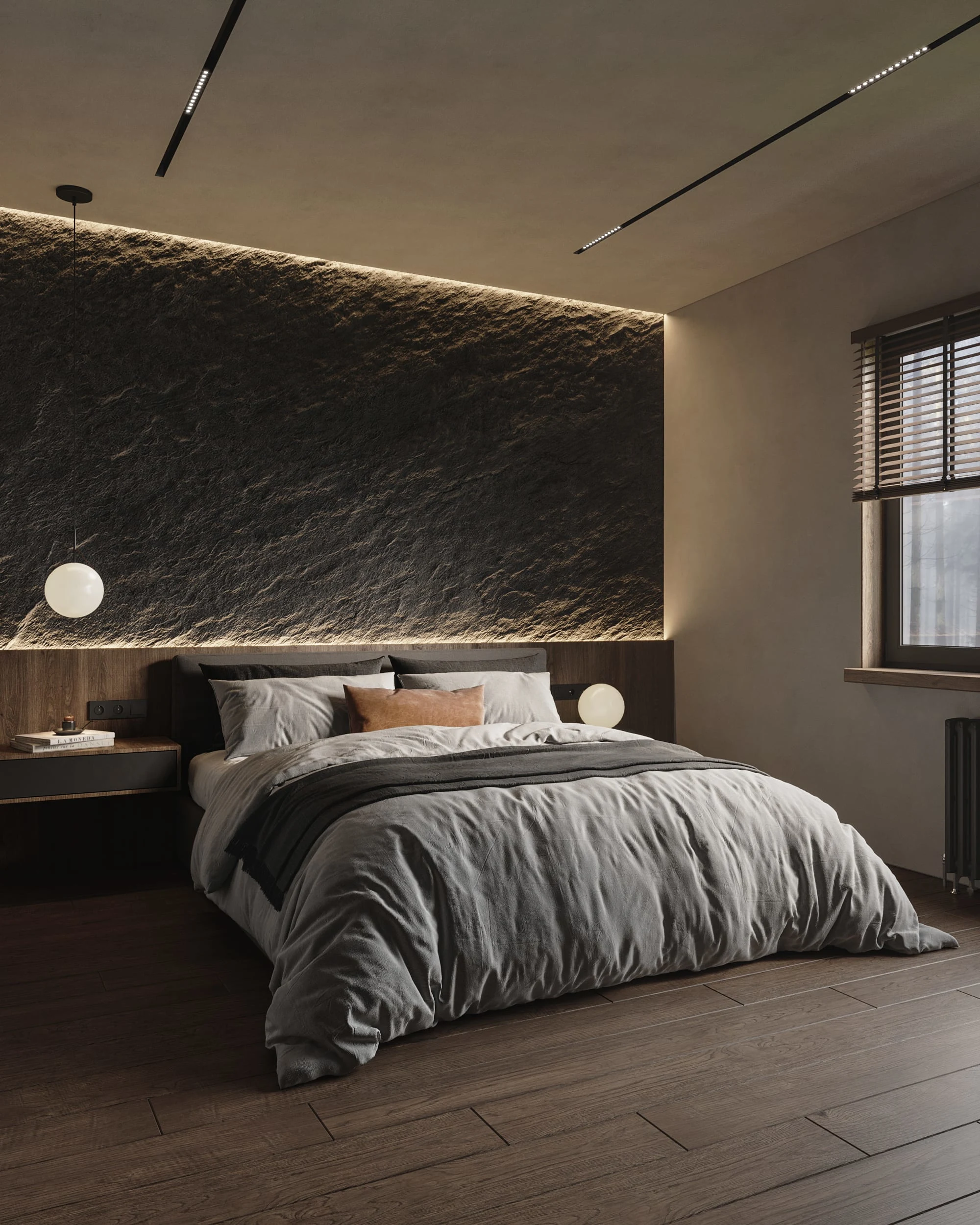 Master-bedroom with walk-in closet in the house with area 120 sq.m. The workplace is highlighted in space using materials and light.