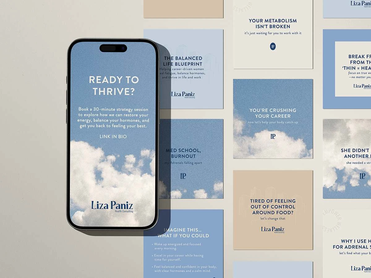 Designed Liza Paniz Health Consultation: Brand strategy, social media, tone. Peaceful city vibe for burnt-out career women seeking balance & energy.