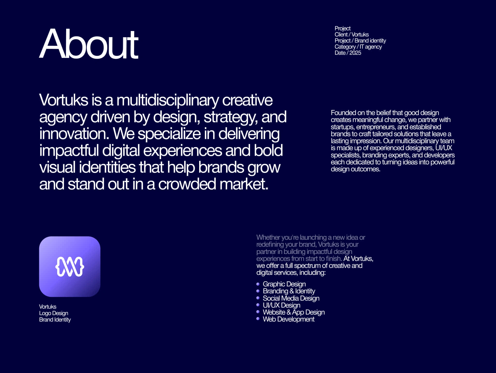Developed a full brand identity system for Vortuks Agency, including logo design, color palette, typography, and brand guidelines.