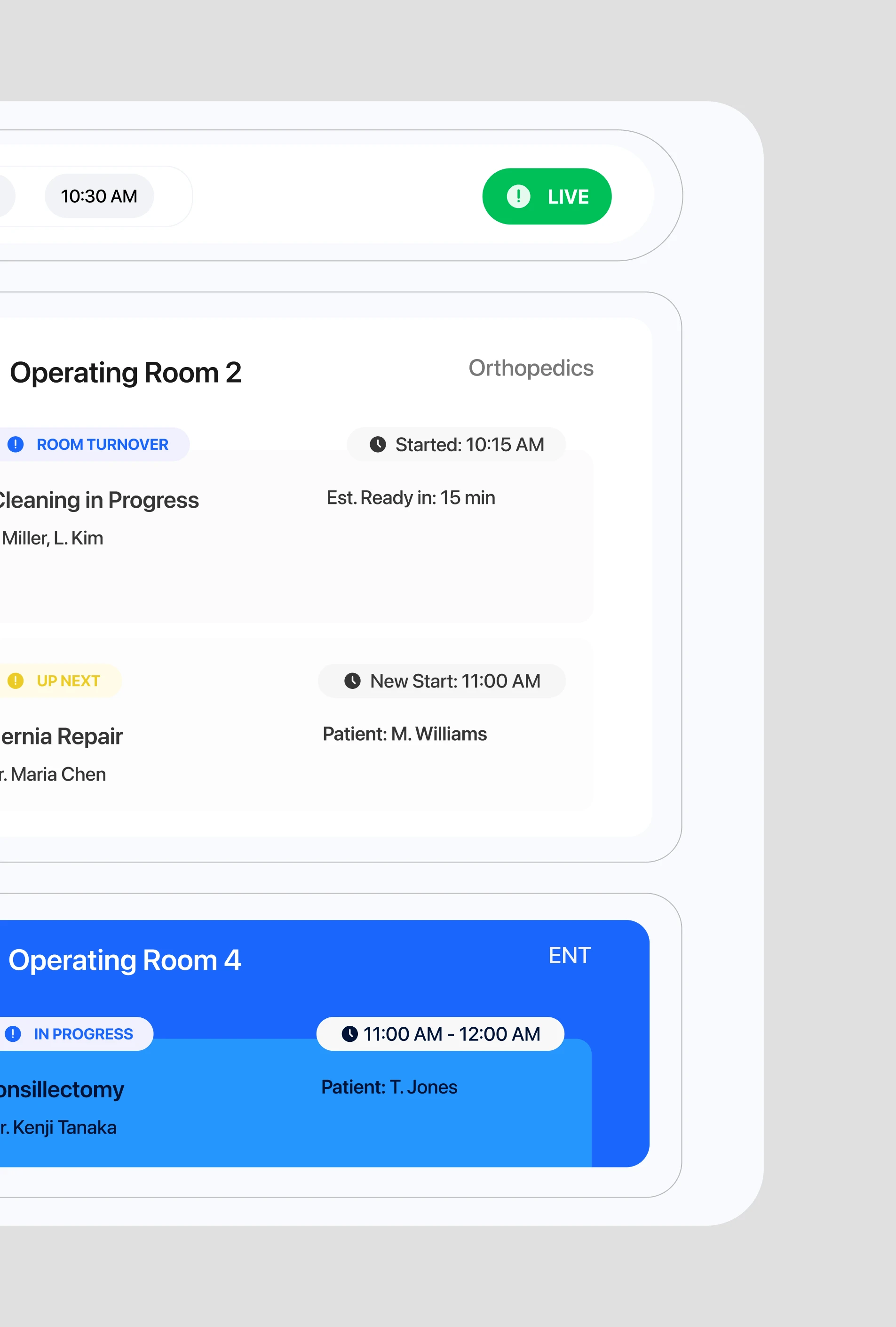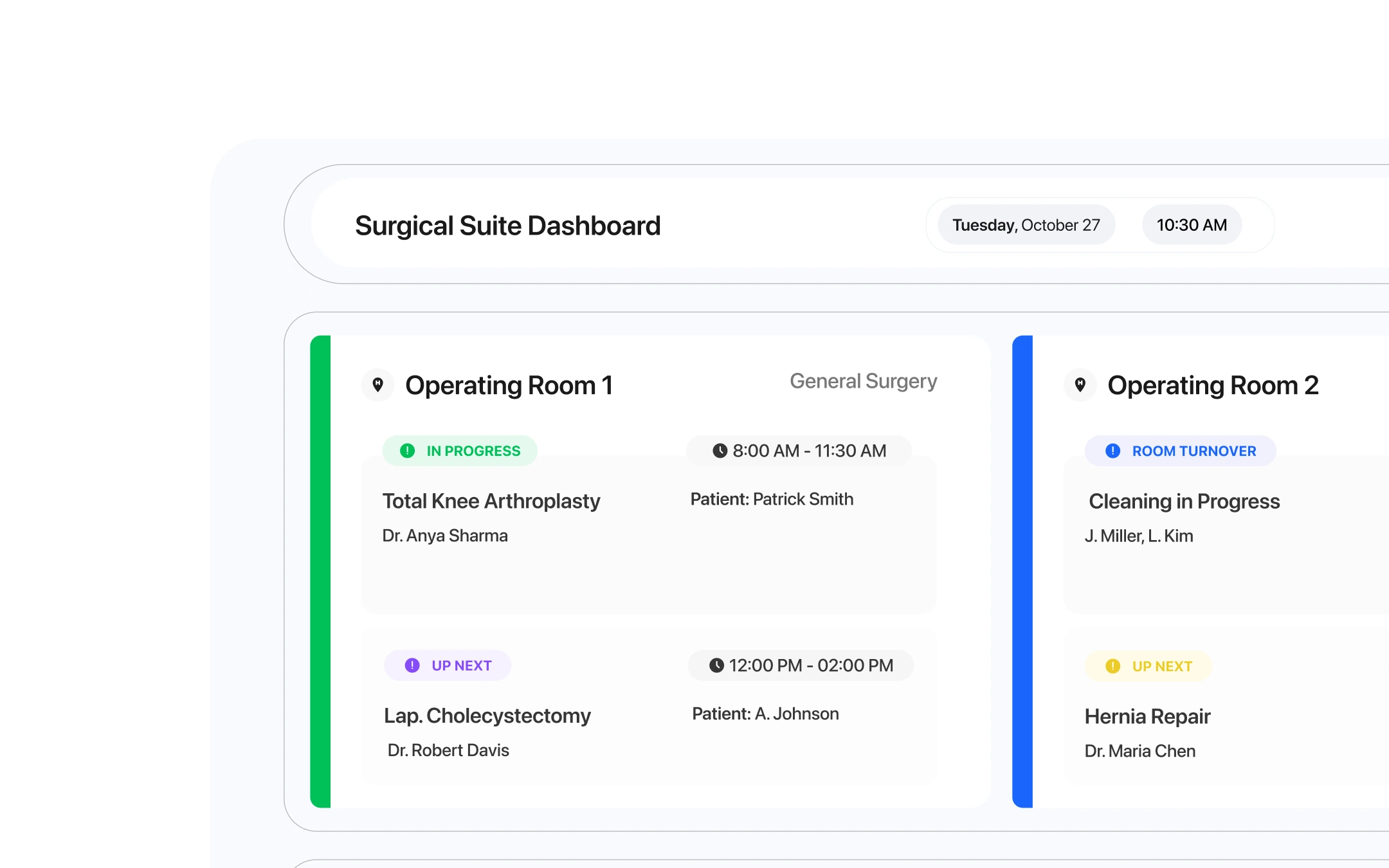 This project is a complete redesign of a hospital's surgical scheduling board, transforming it from a static, often outdated list into a real-time, at-a-glance "mission control" center. The goal was to create a single source of truth for the entire surgical team, improving communication, maximizing operating room (OR) utilization, and enhancing patient safety through radical clarity.