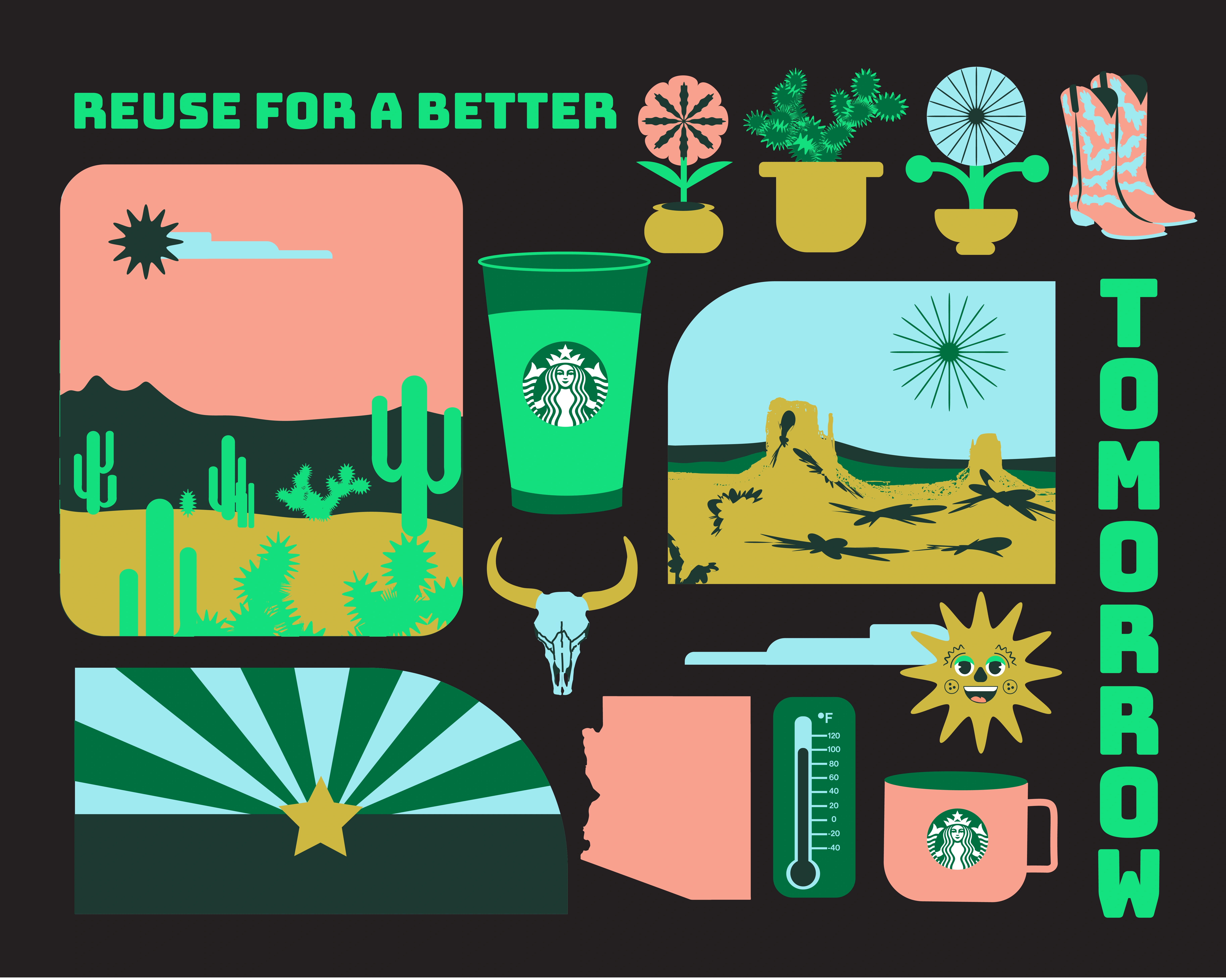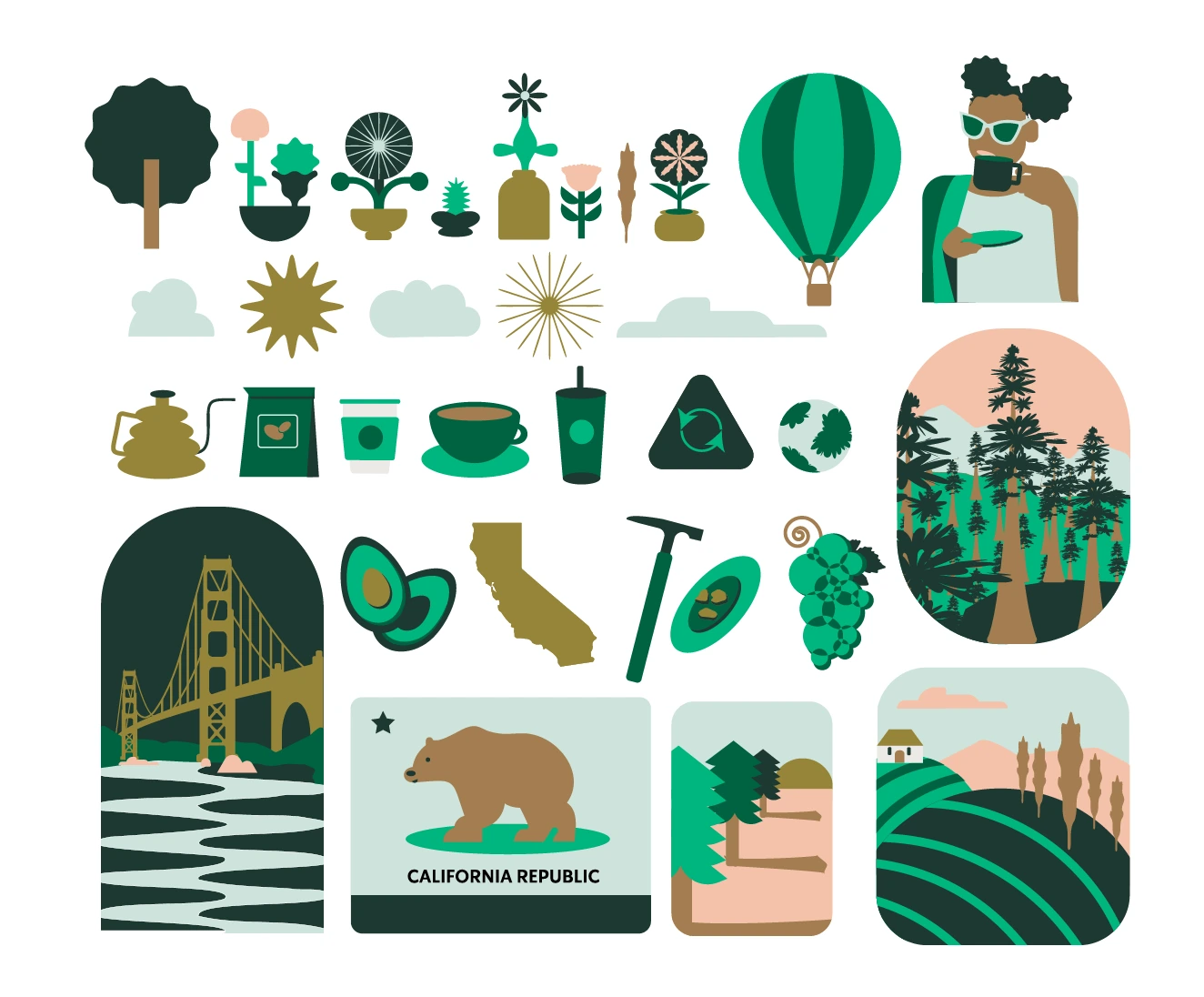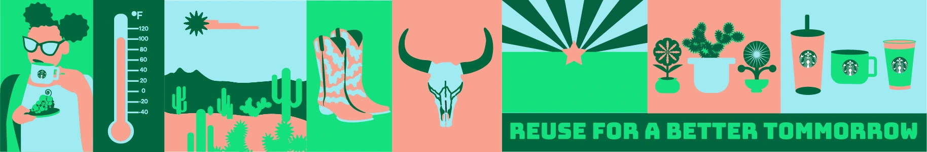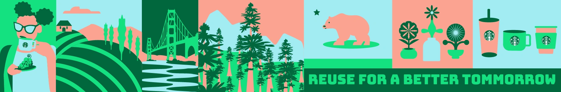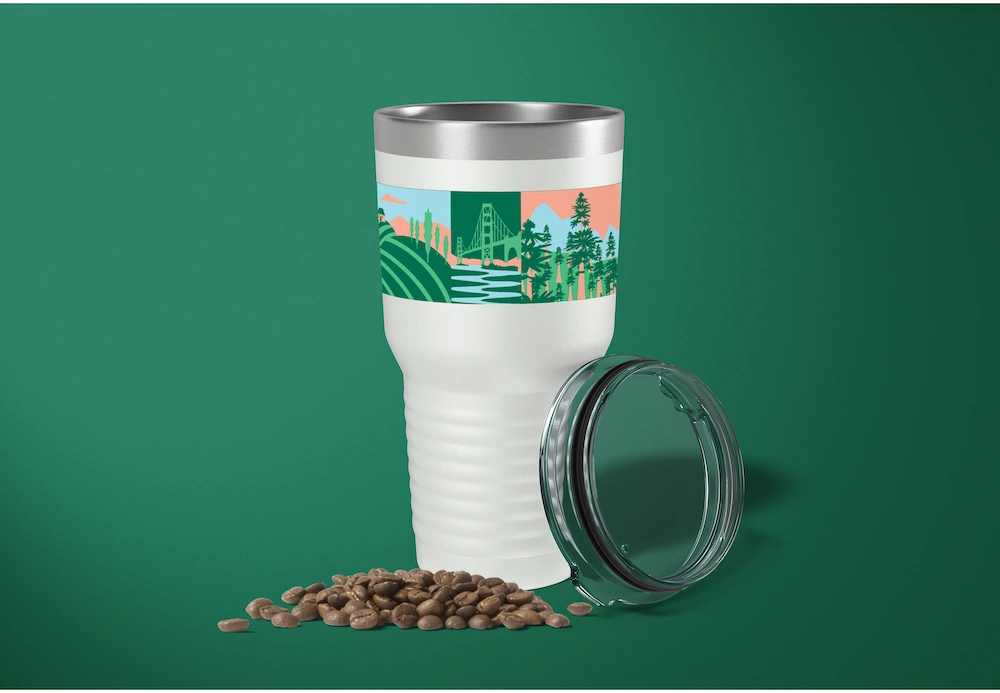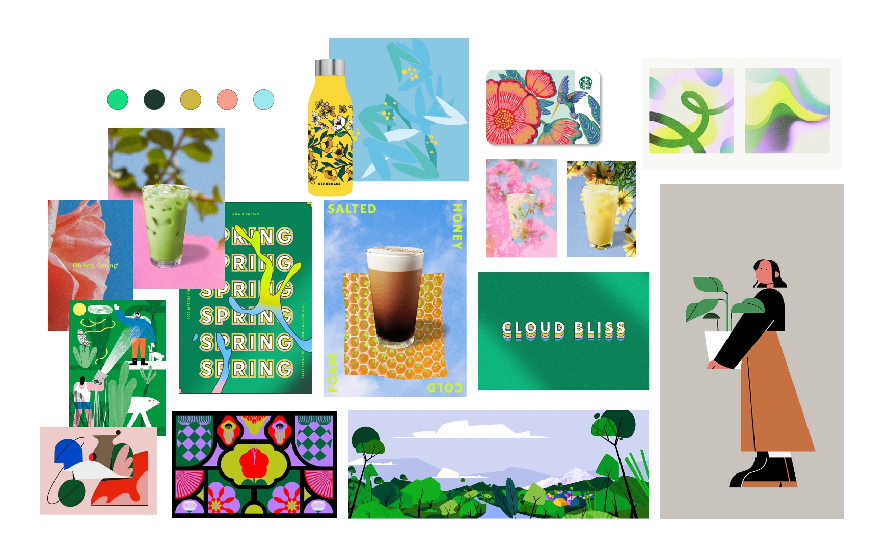 The tone is playful, youthful, eco-friendly, and organic. Design inspiration comes from 2D flat illustrations featuring a minimal color palette, organic and abstract shapes, and textural elements. The imagery aligns with previous Starbucks campaigns, including gift cards with flowers that naturally blend shades of blue and green. Product photography of the drinks reinforces this color palette, with blues and greens echoing the surrounding environment.