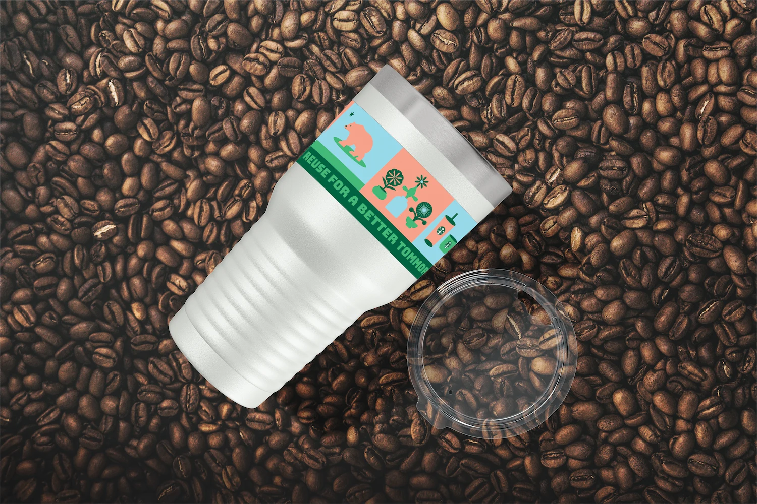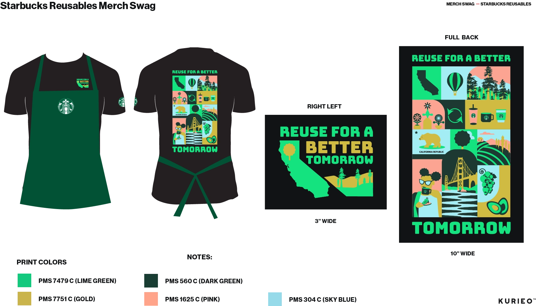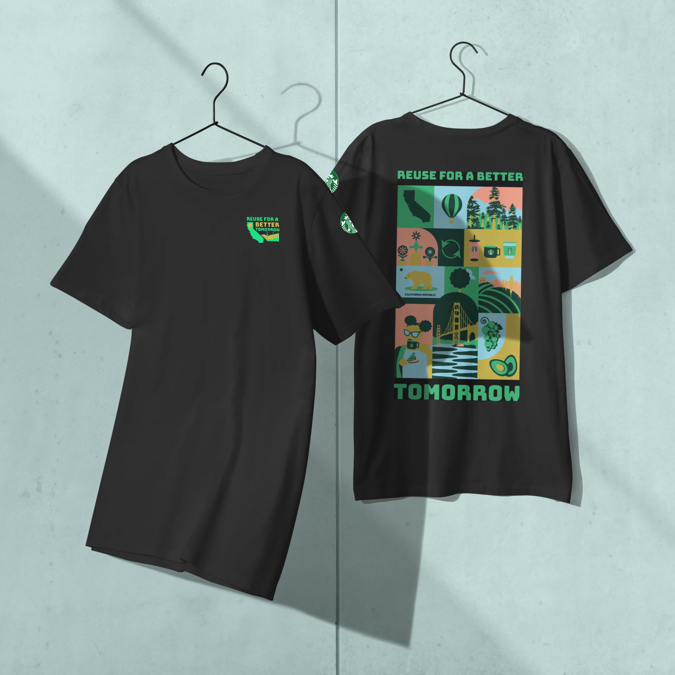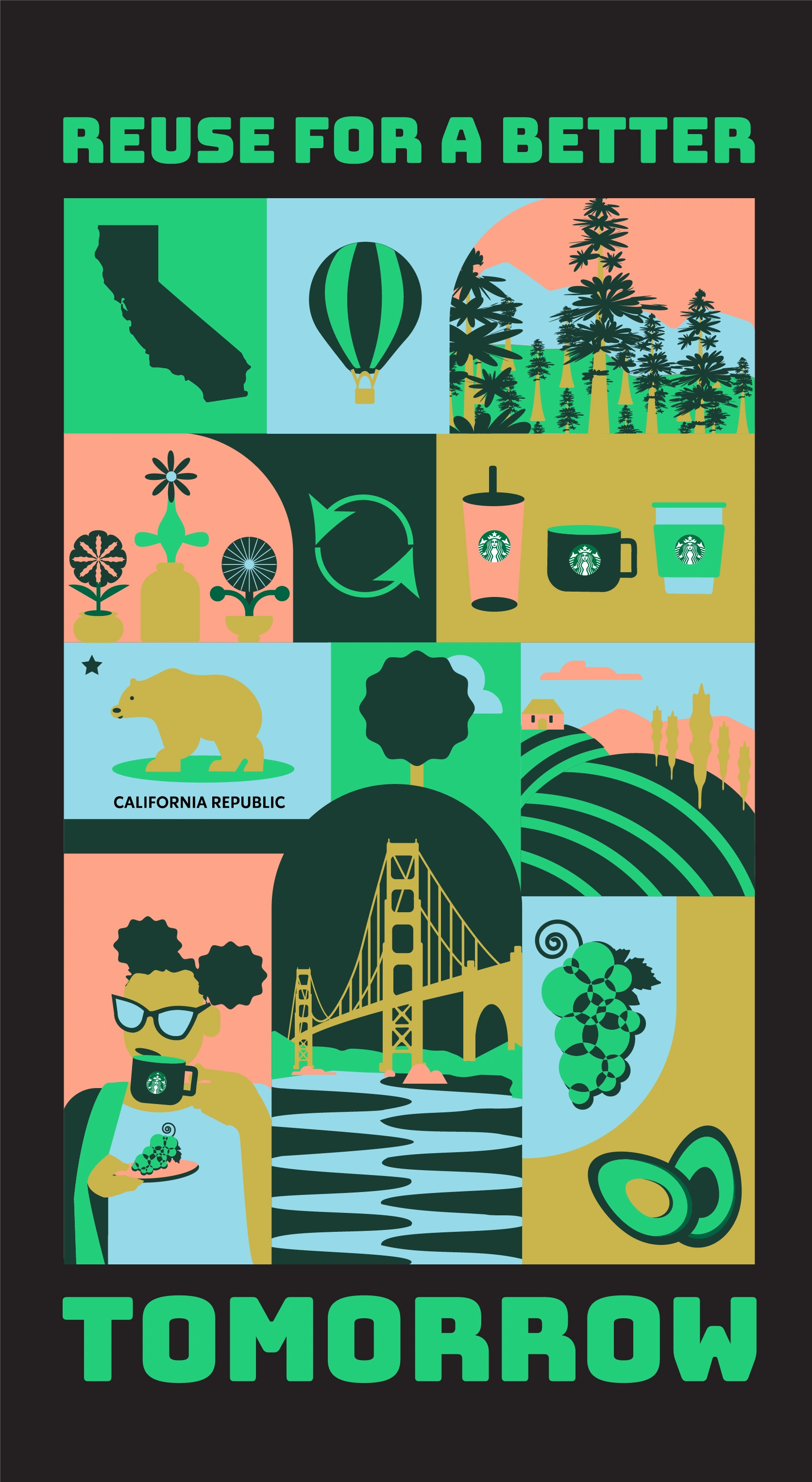 The tone is playful, youthful, eco-friendly, and organic. Design inspiration comes from 2D flat illustrations featuring a minimal color palette, organic and abstract shapes, and textural elements. The imagery aligns with previous Starbucks campaigns, including gift cards with flowers that naturally blend shades of blue and green. Product photography of the drinks reinforces this color palette, with blues and greens echoing the surrounding environment.