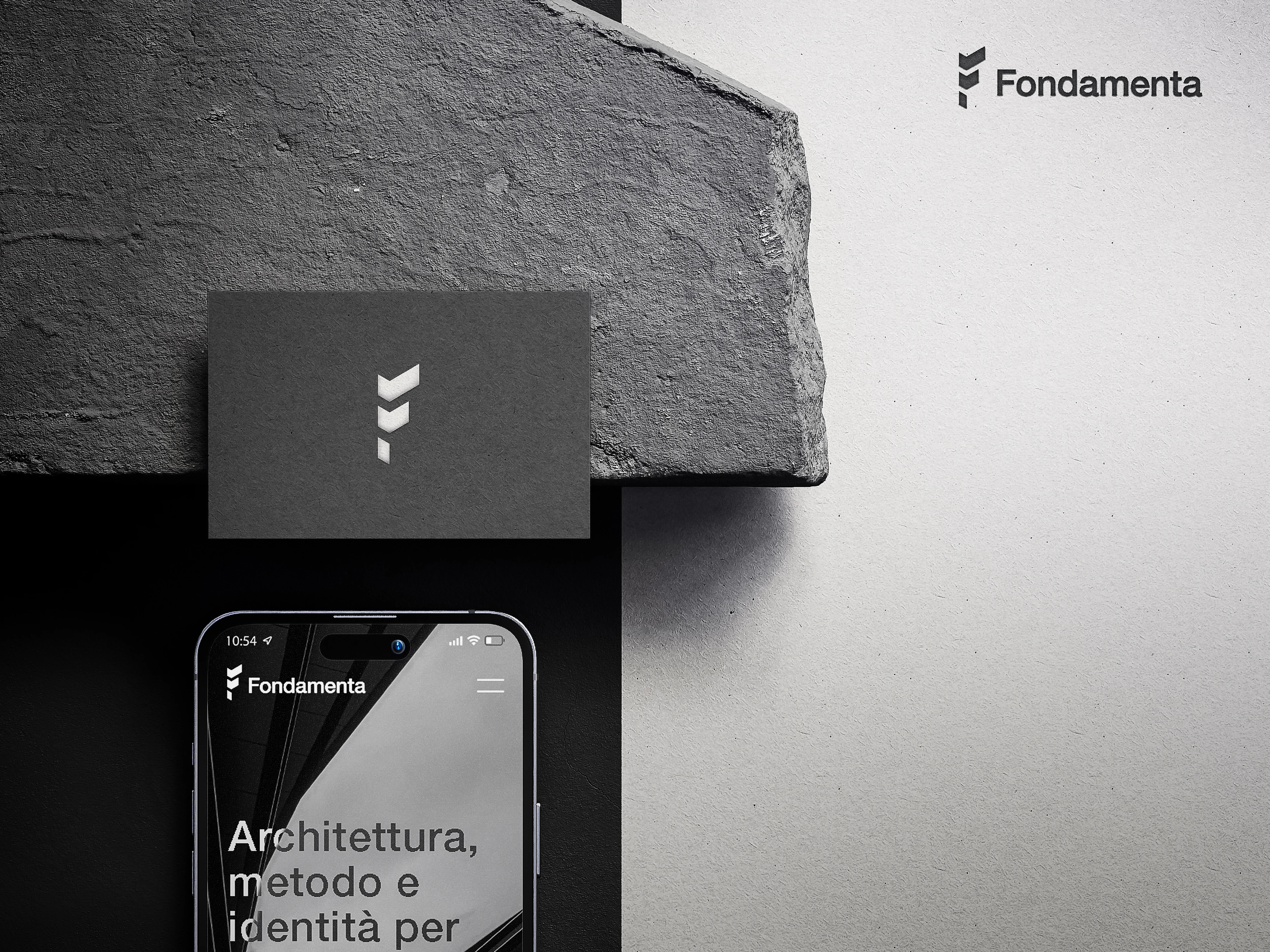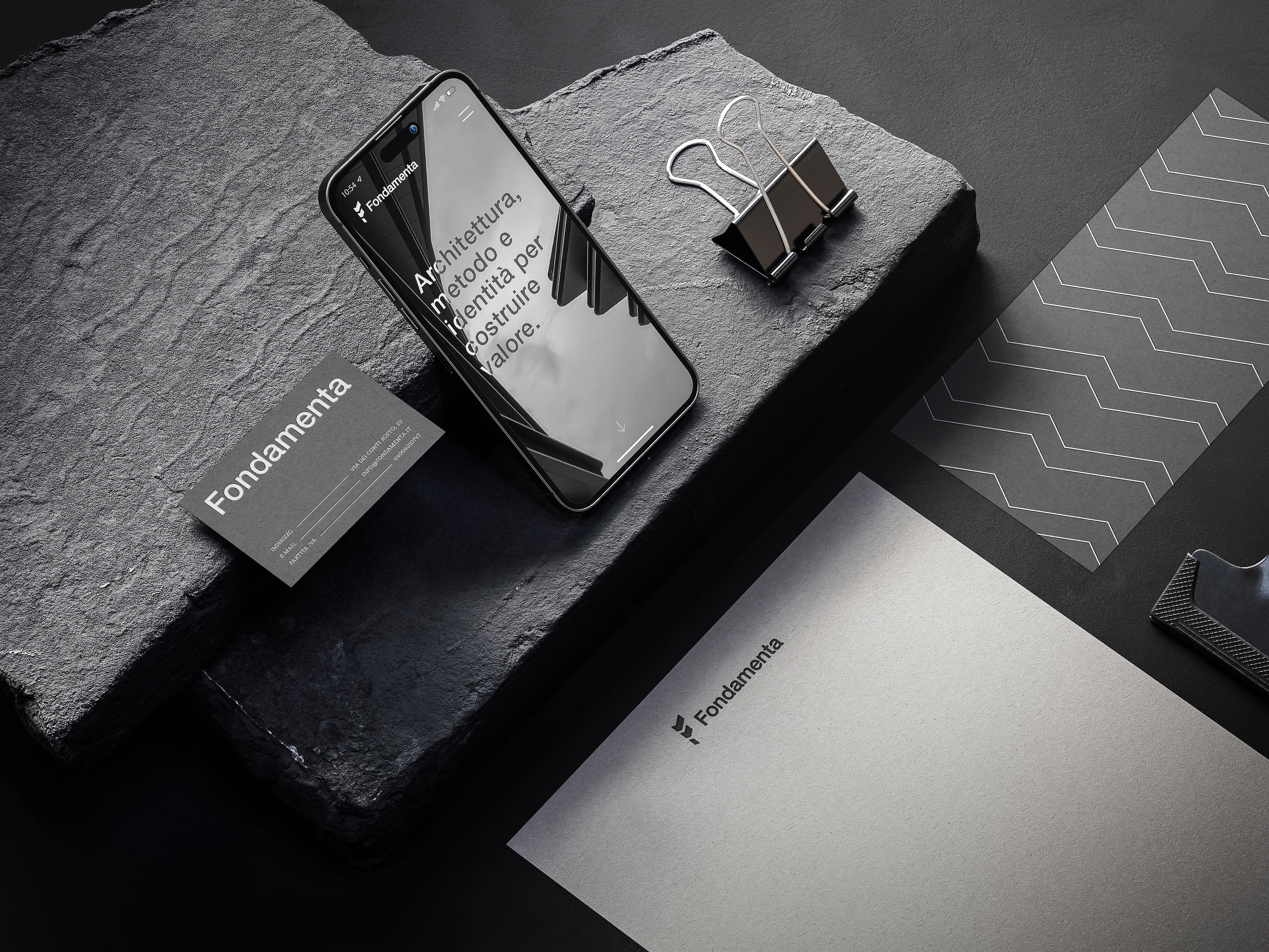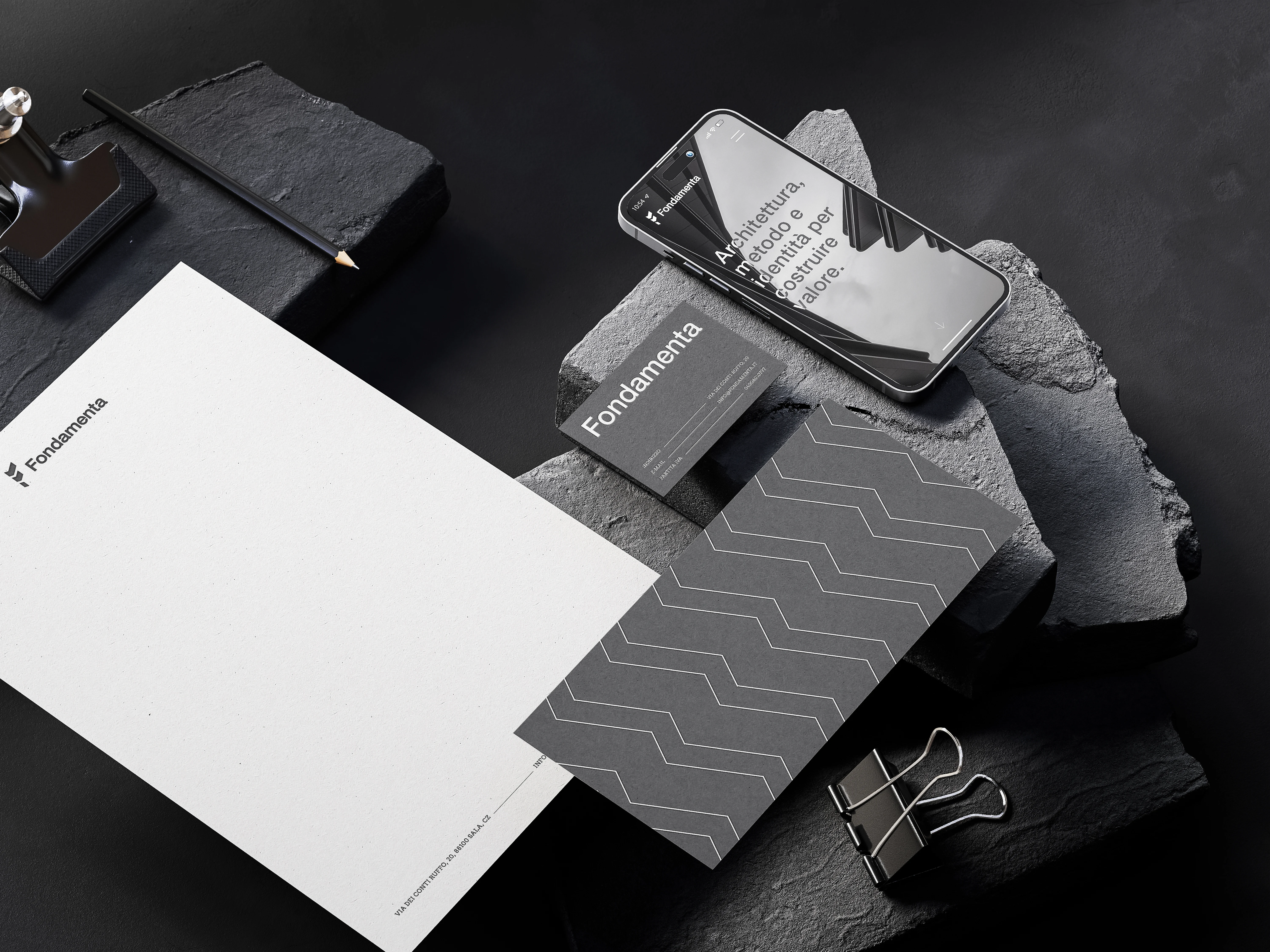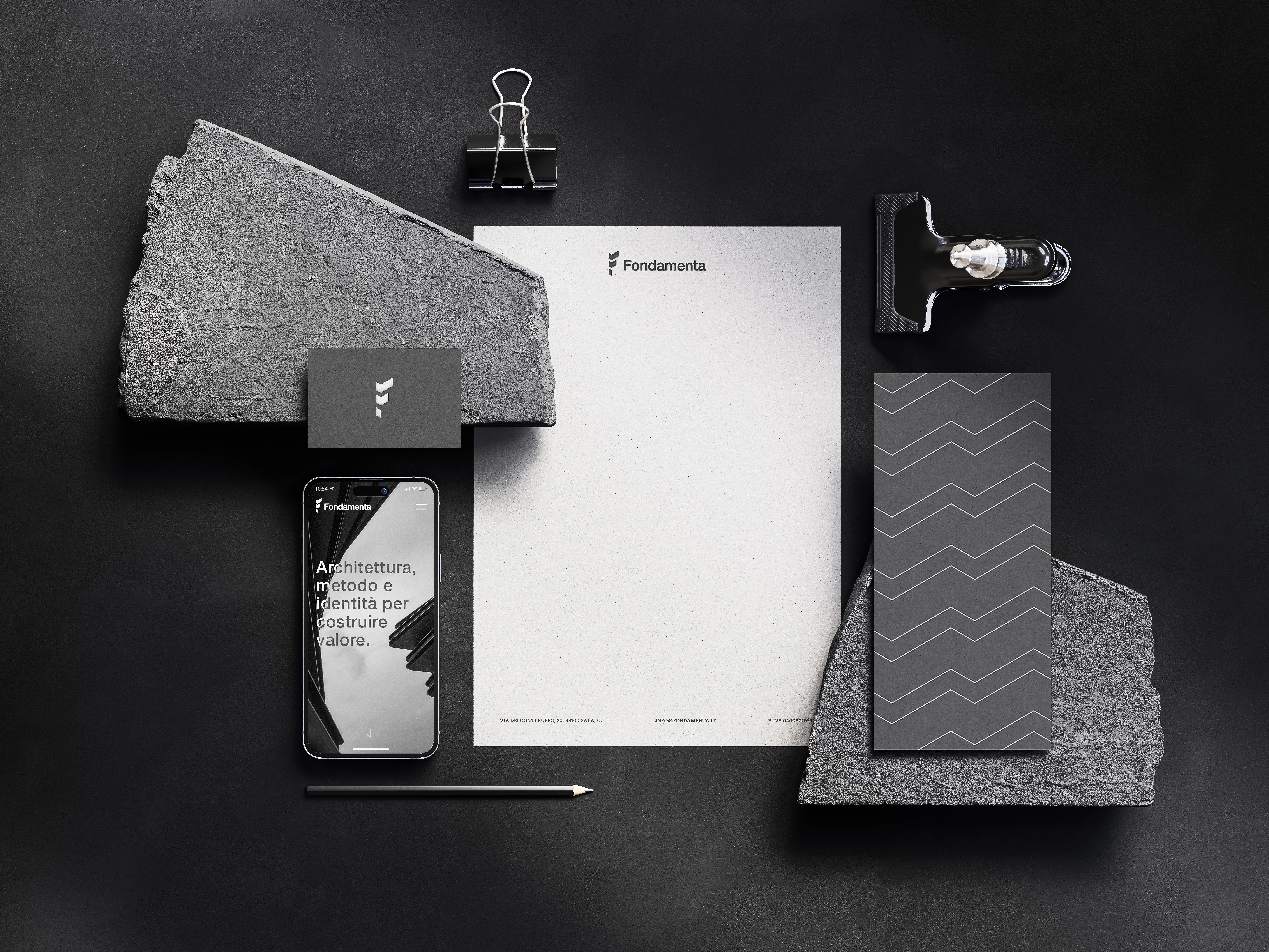 Branding for FONDAMENTA, a construction company from Southern Italy: logo, business cards, stationery, and visual identity reflecting strength and trust.