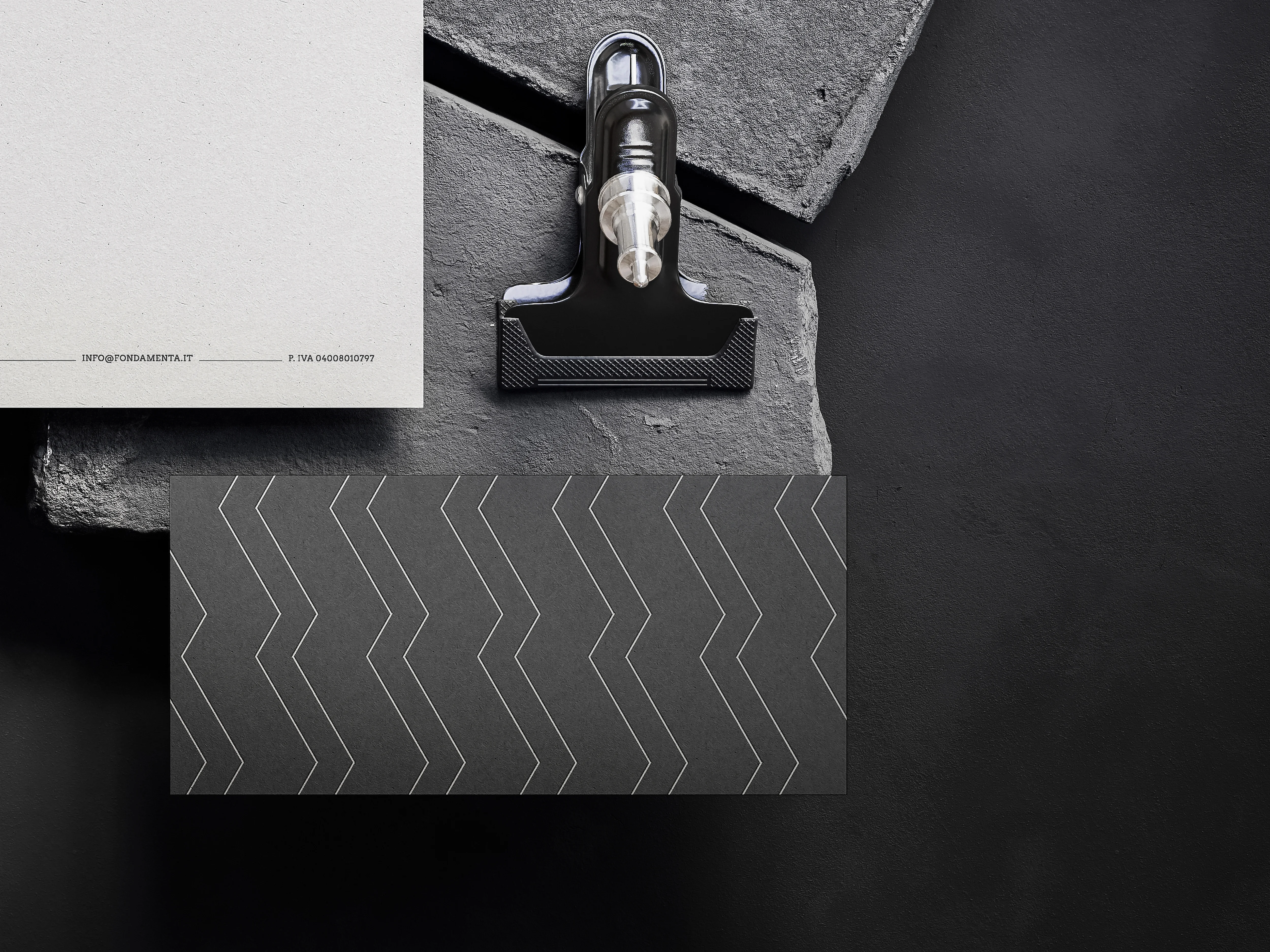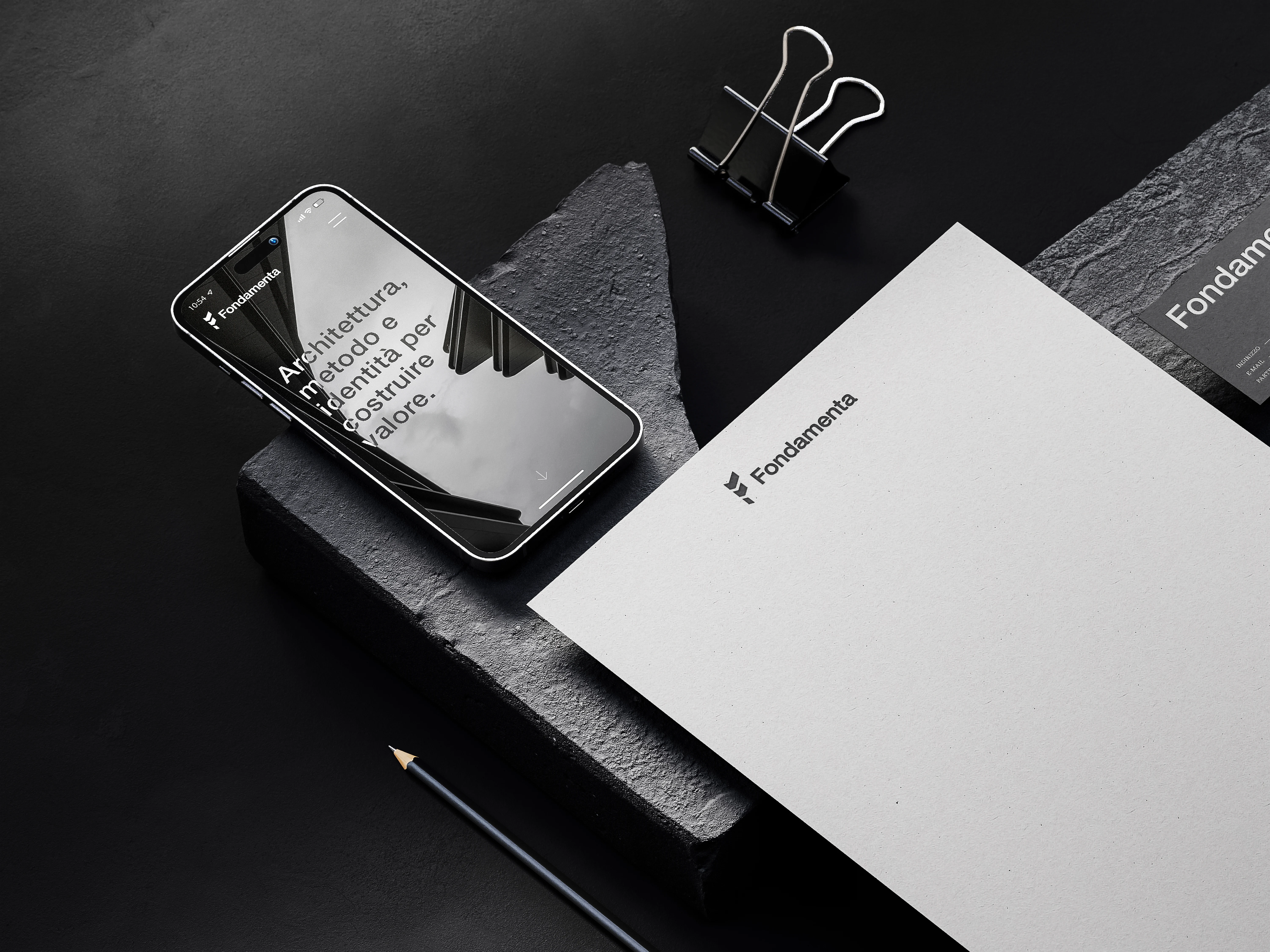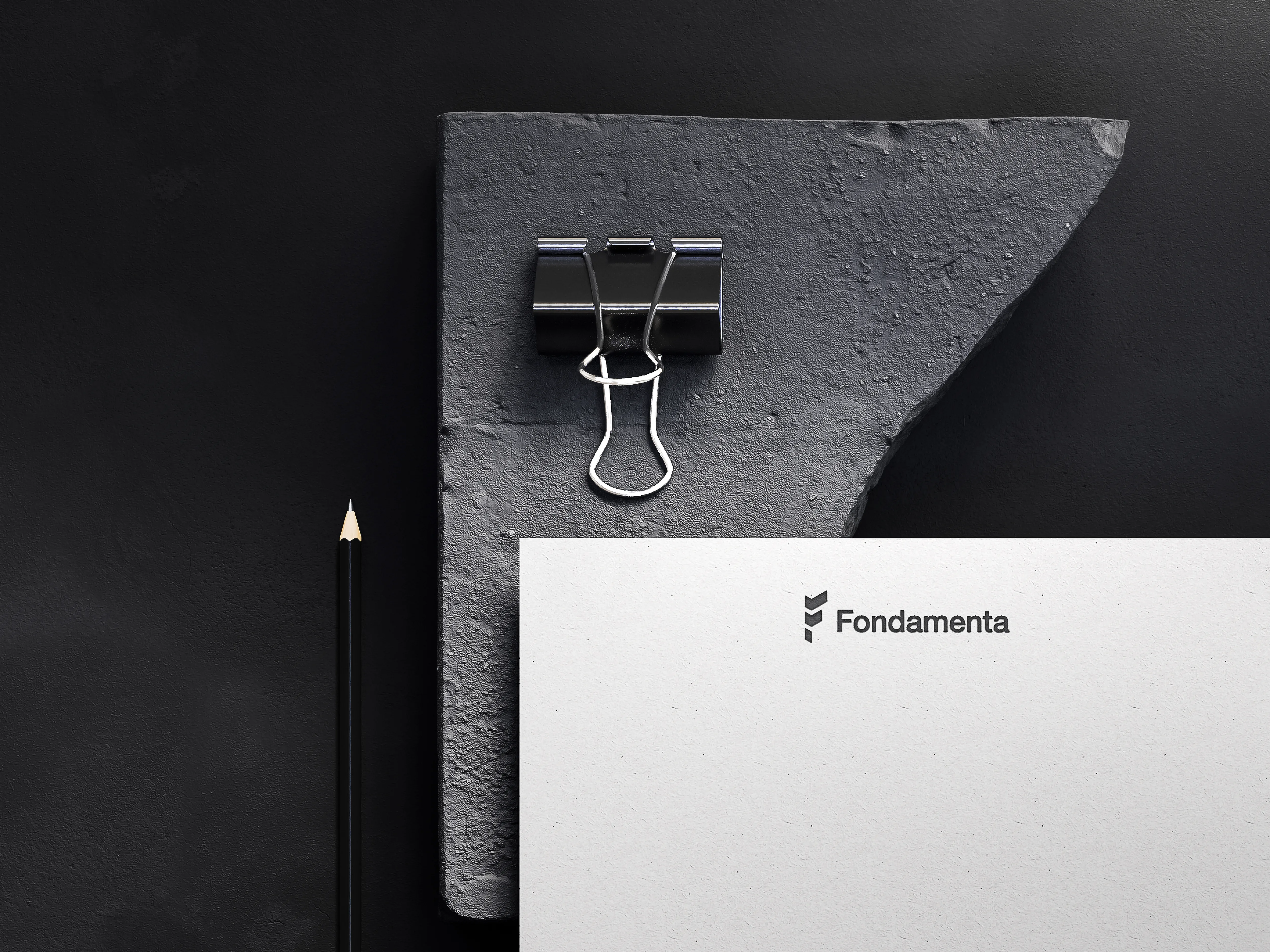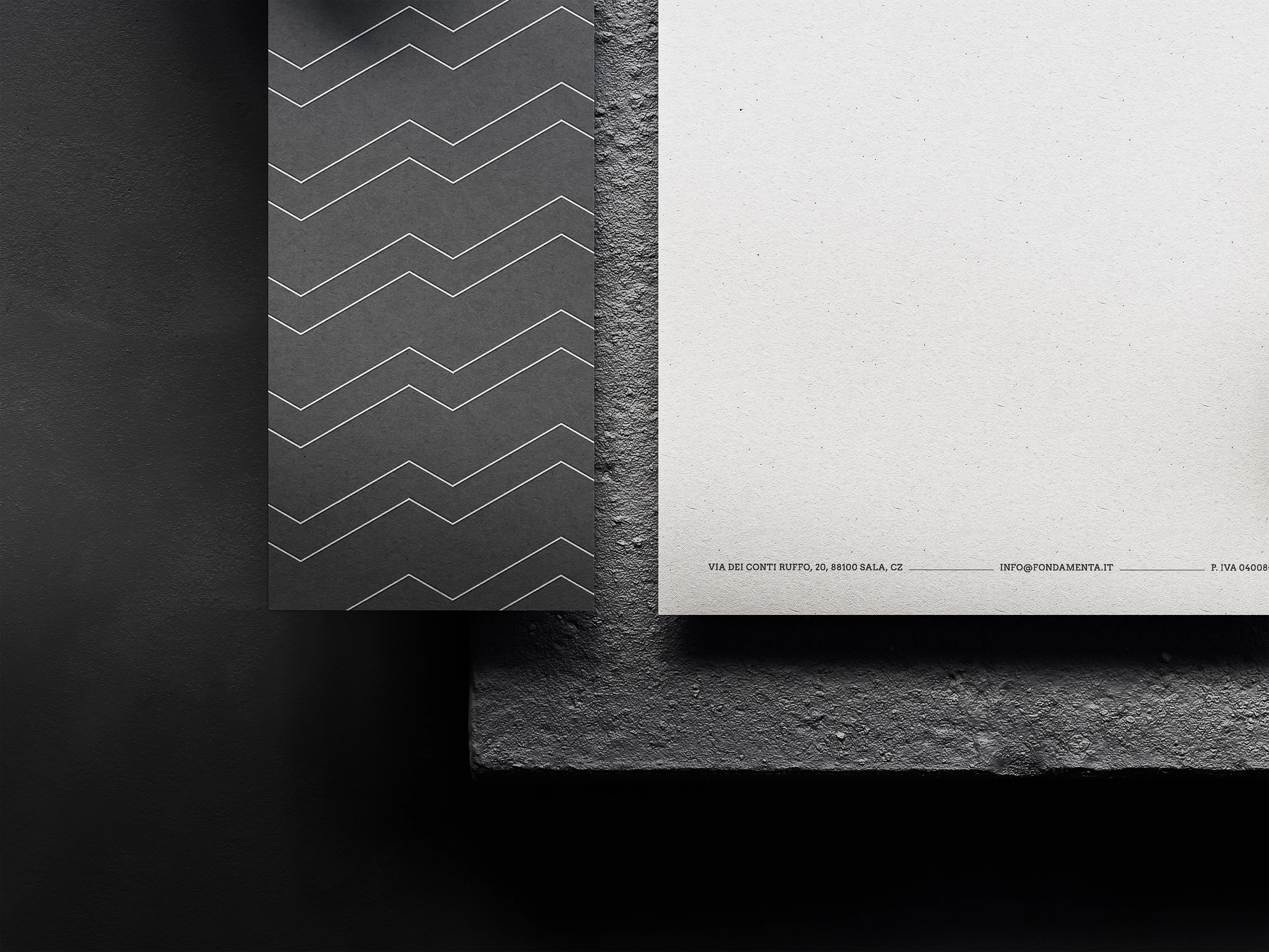 Branding for FONDAMENTA, a construction company from Southern Italy: logo, business cards, stationery, and visual identity reflecting strength and trust.