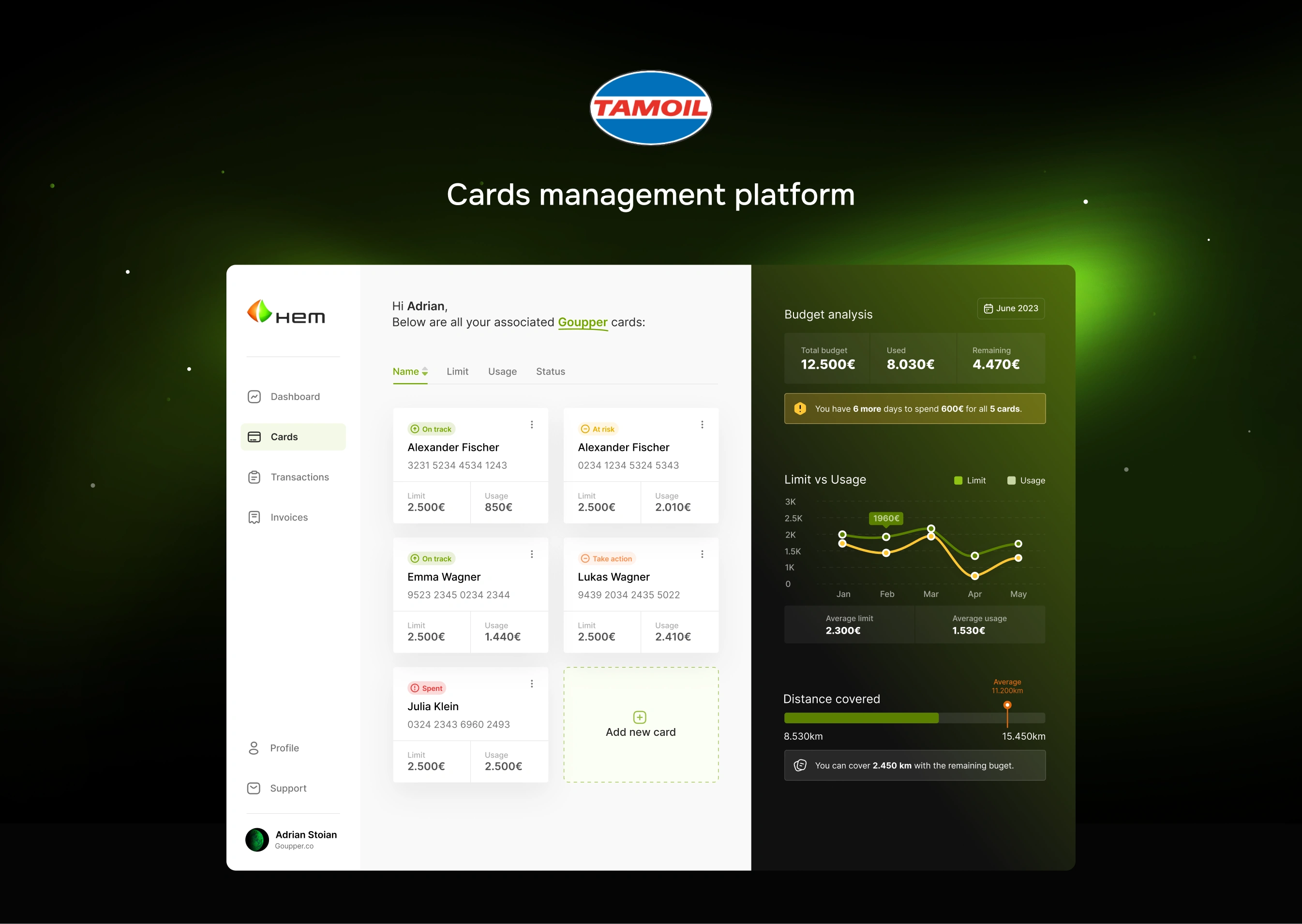 Hired by Tamoil to design ‘HEM My Card’ app for SMEs, enabling fleet budgeting, borrowing, and refueling. Led discovery, design system, UI, and prototype testin