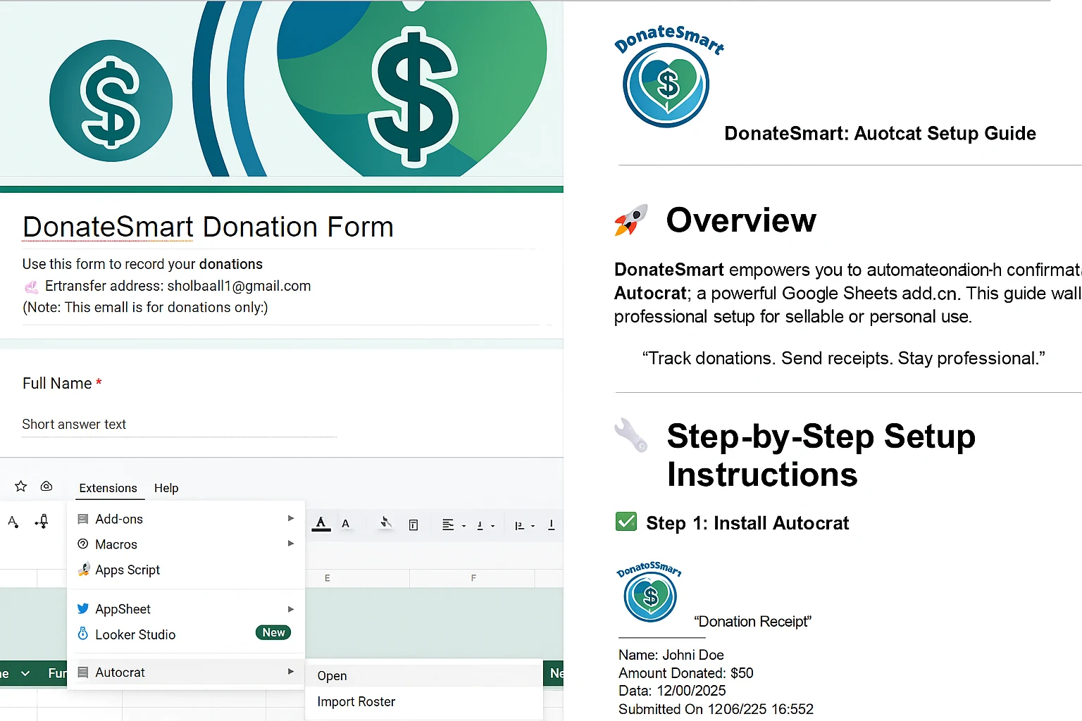 DonateSmart is a Google Sheets + Google Forms-based system that helps organizations track donations and automatically send professional receipts via email using Autocrat integration. It's perfect for charities, non-profits, or small fundraisers that need a clean and reliable workflow without expensive software.