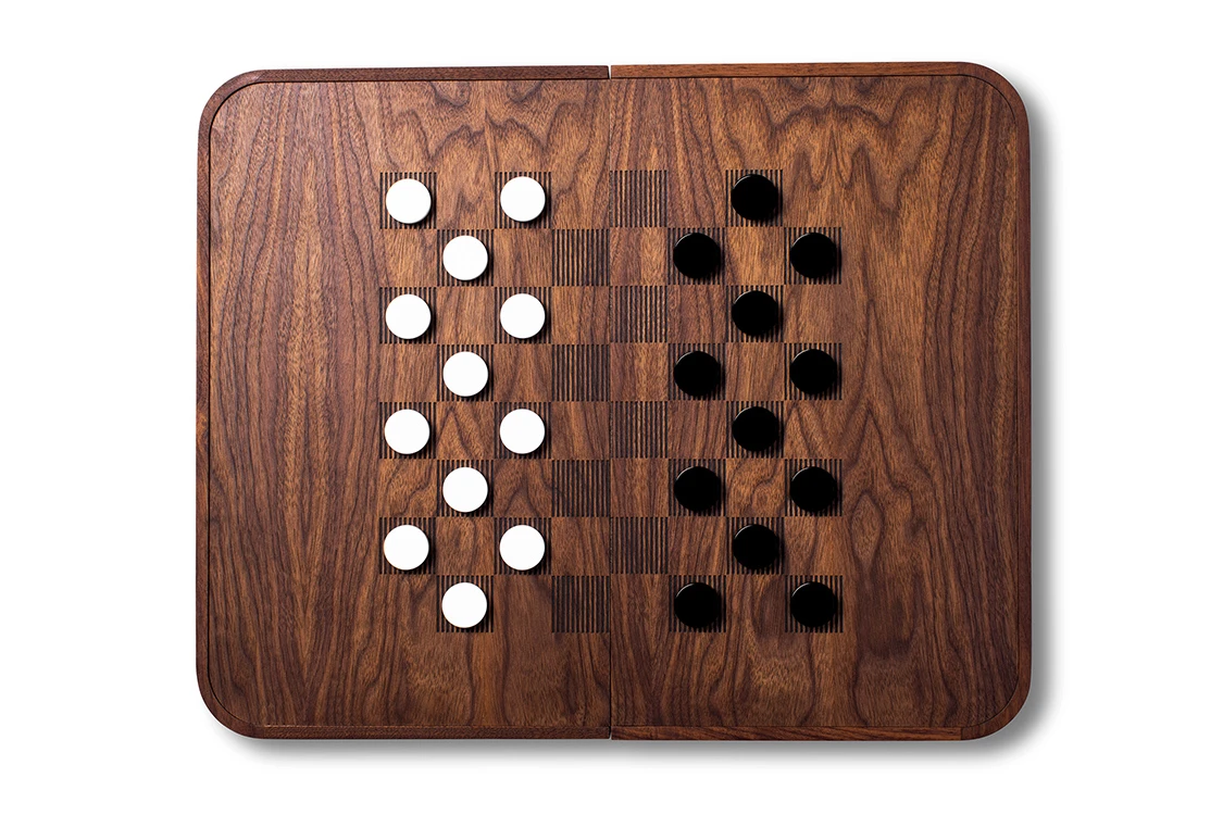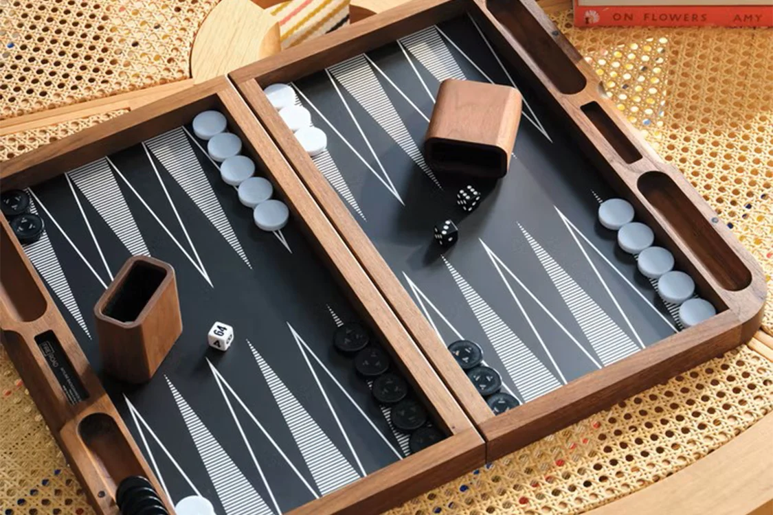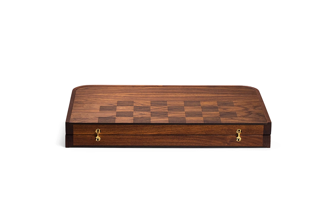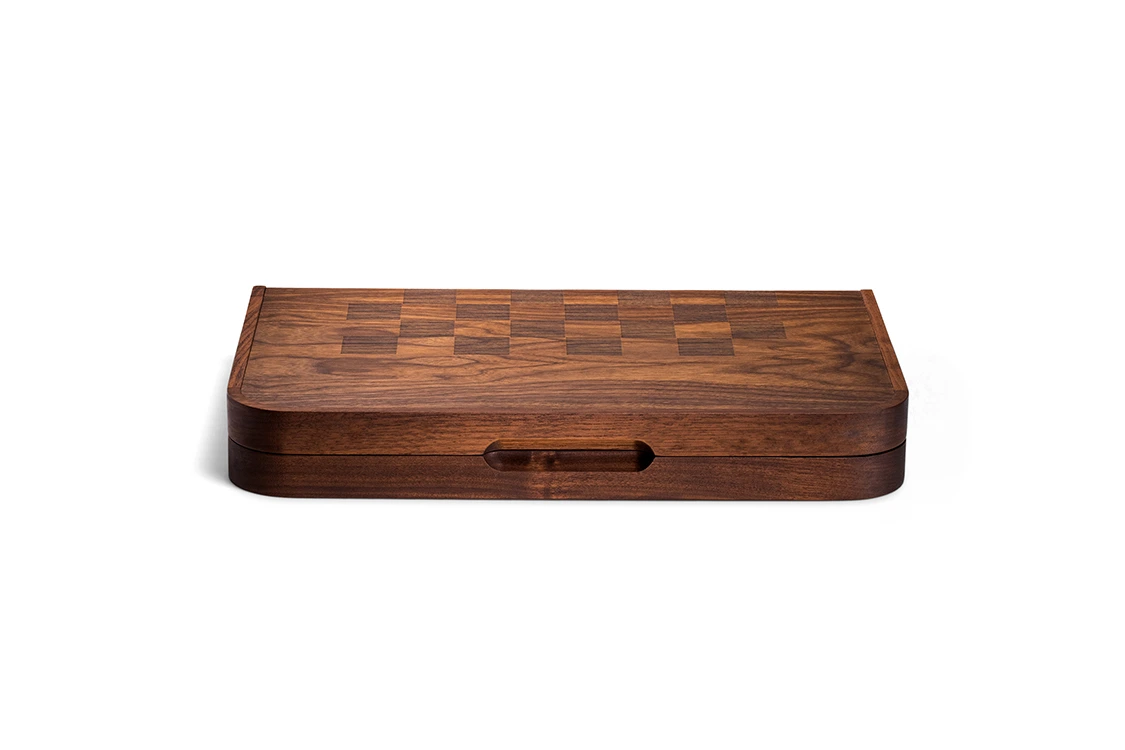This modern backgammon set is designed to evoke the iconic beauty of the San Francisco skyline. Featuring a walnut frame and laser-engraved aluminum playing board, as well as custom walnut dice cups and playing pieces, this luxury backgammon set will make a statement at any game night. Crafted in San Francisco, CA, the Skyline Backgammon Set is an ideal gift for game enthusiasts and collectors alike.