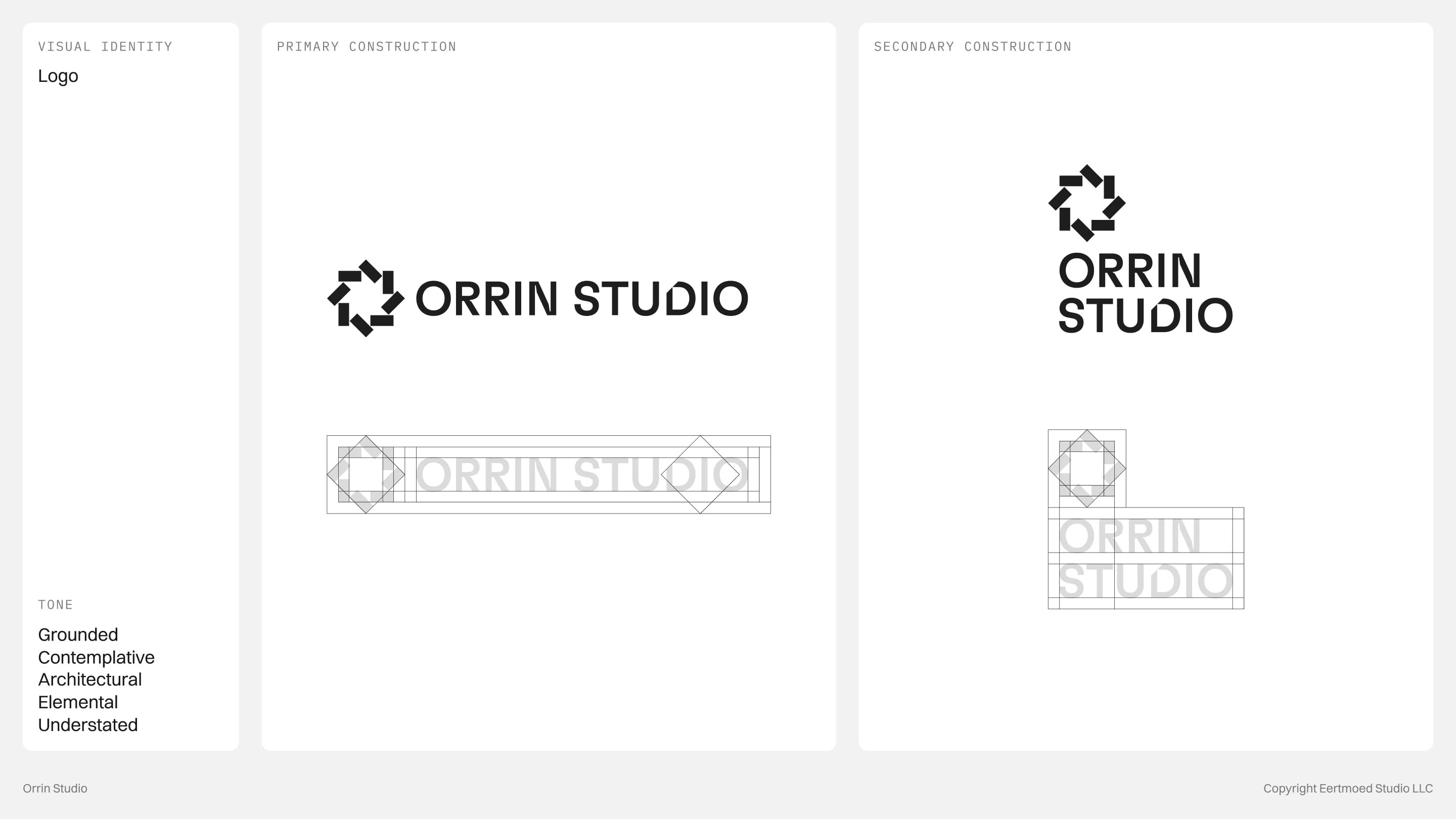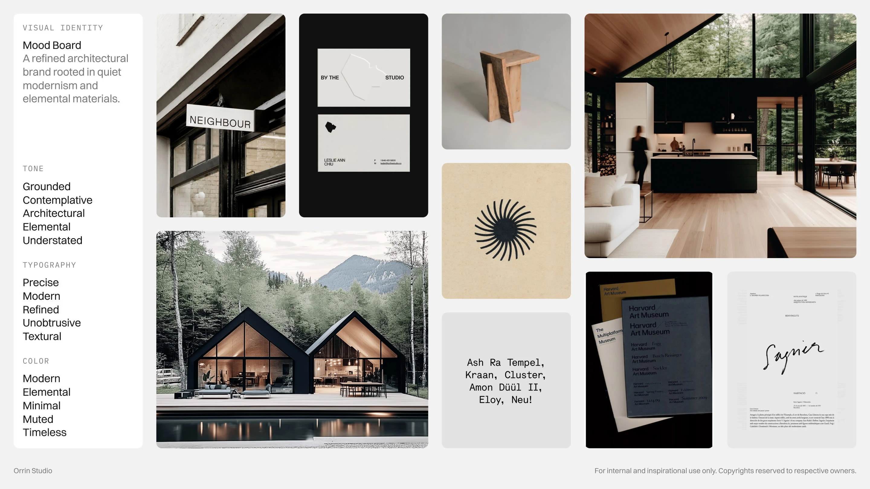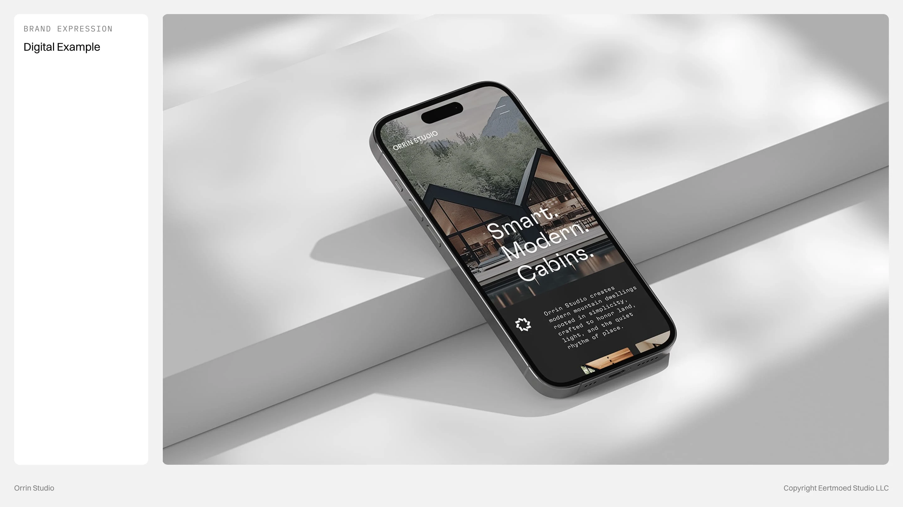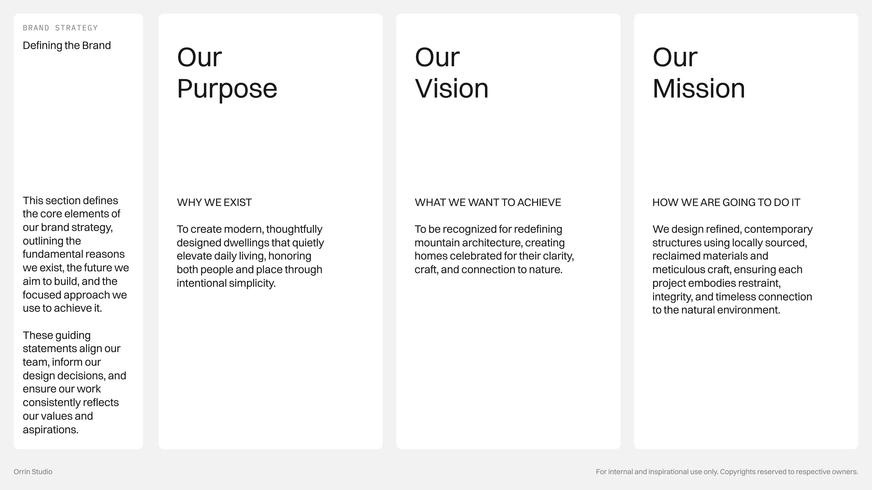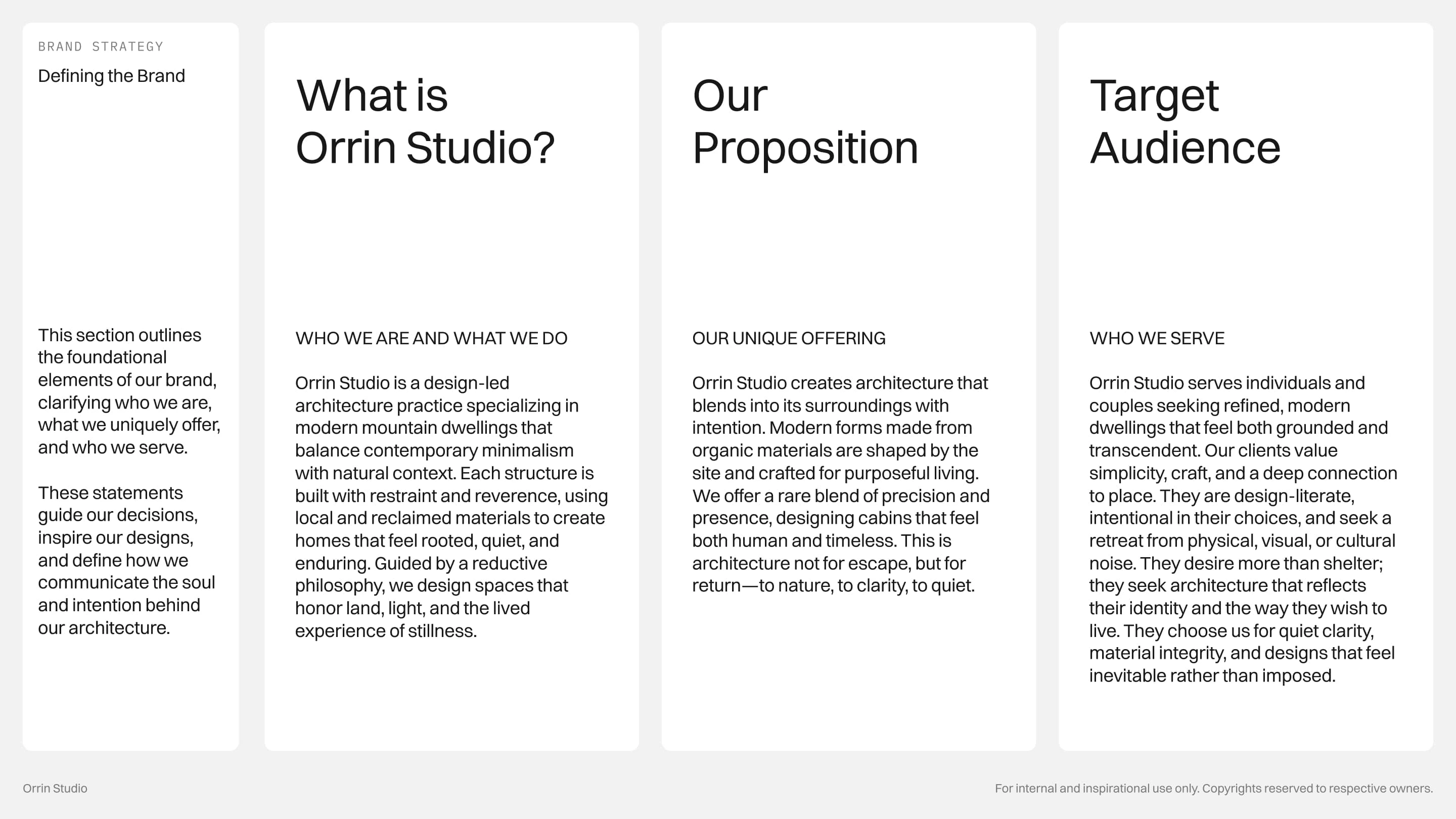 Every detail is intentional, from the modular logo that symbolizes foundation and rhythm to the restrained color palette rooted in stone, slate, and forest. The concept embodies a brand that is timeless, grounded, and quietly confident, reflecting Orrin Studio’s mission to create dwellings that feel inevitable within their surroundings.