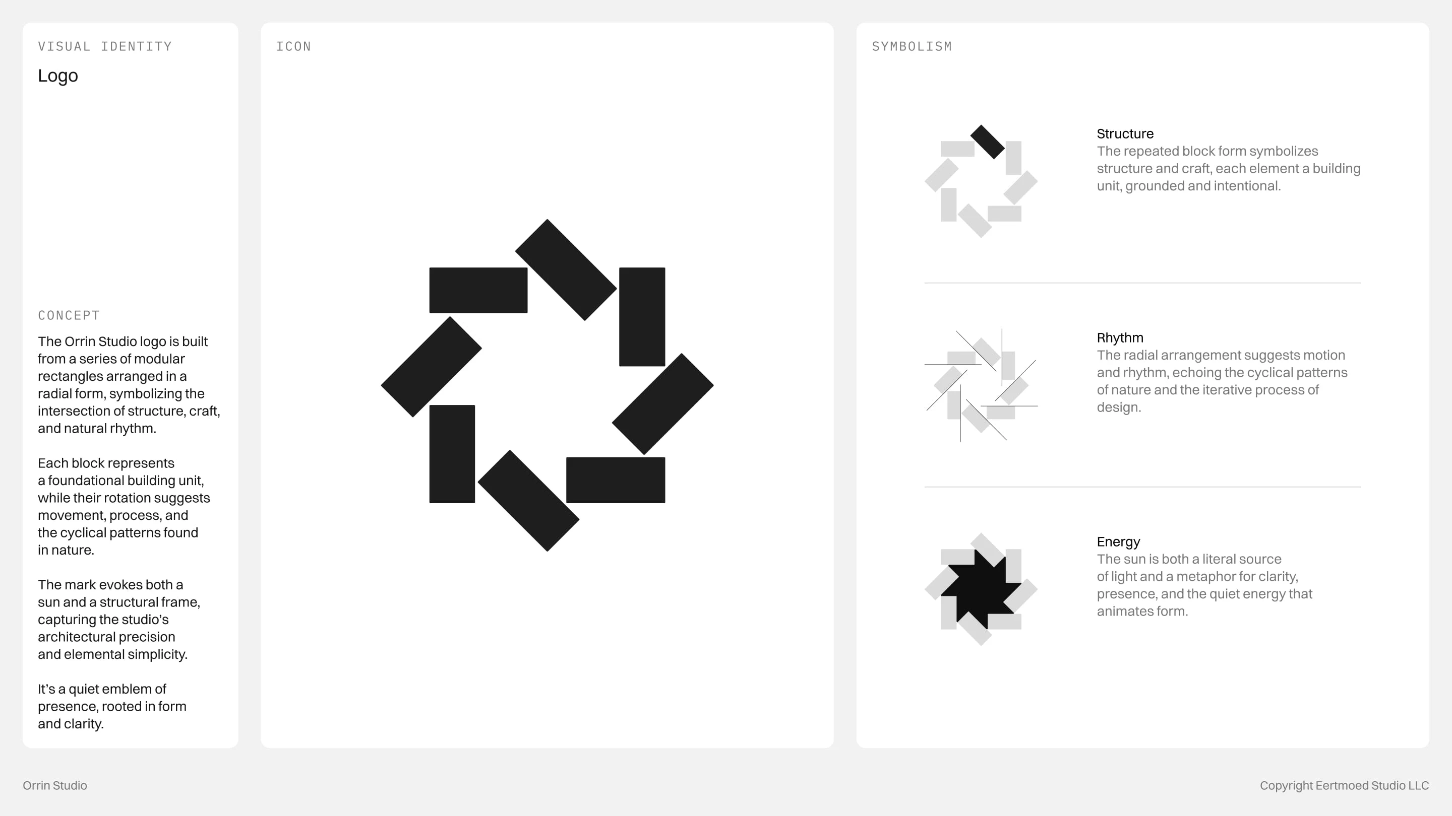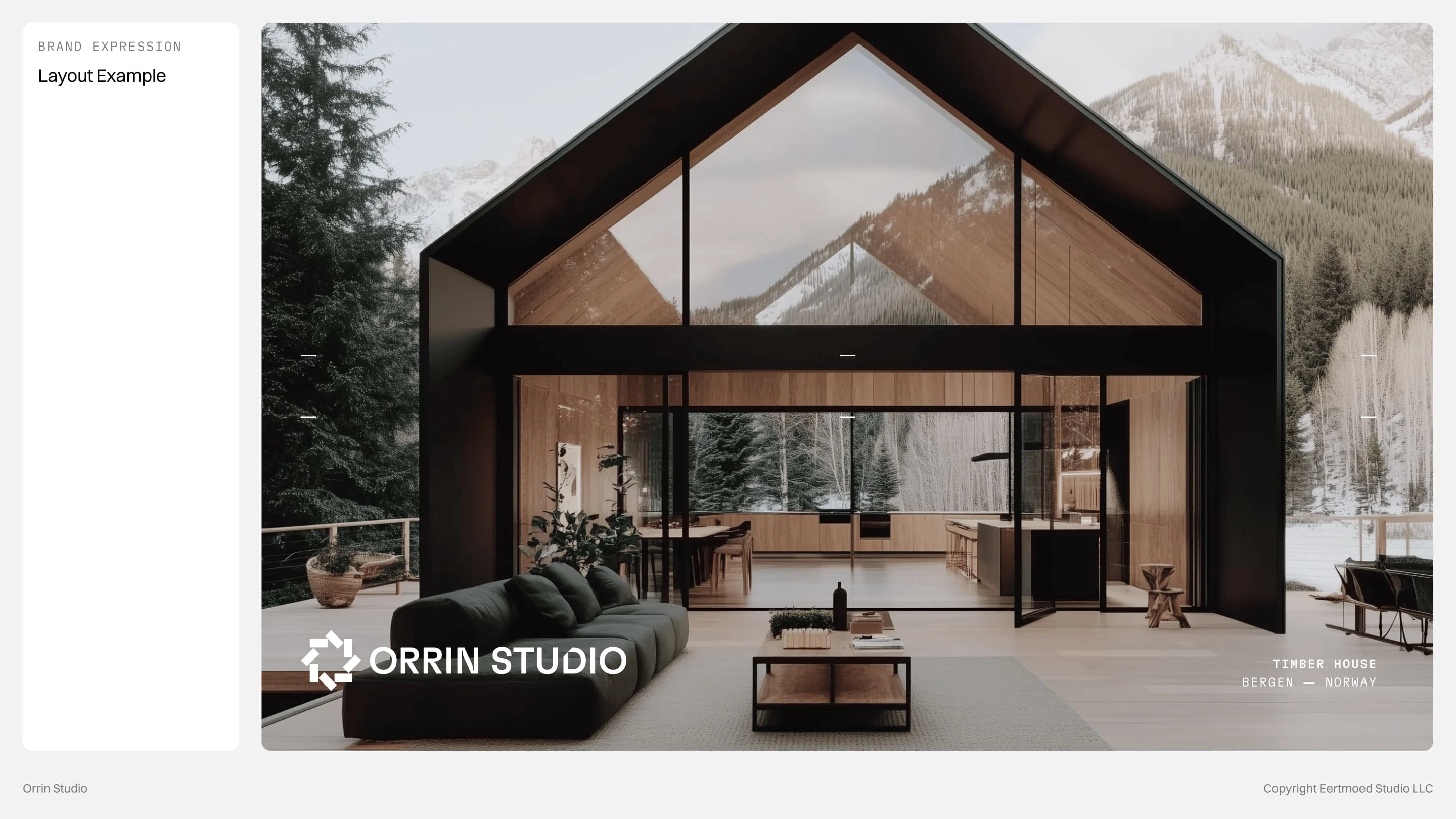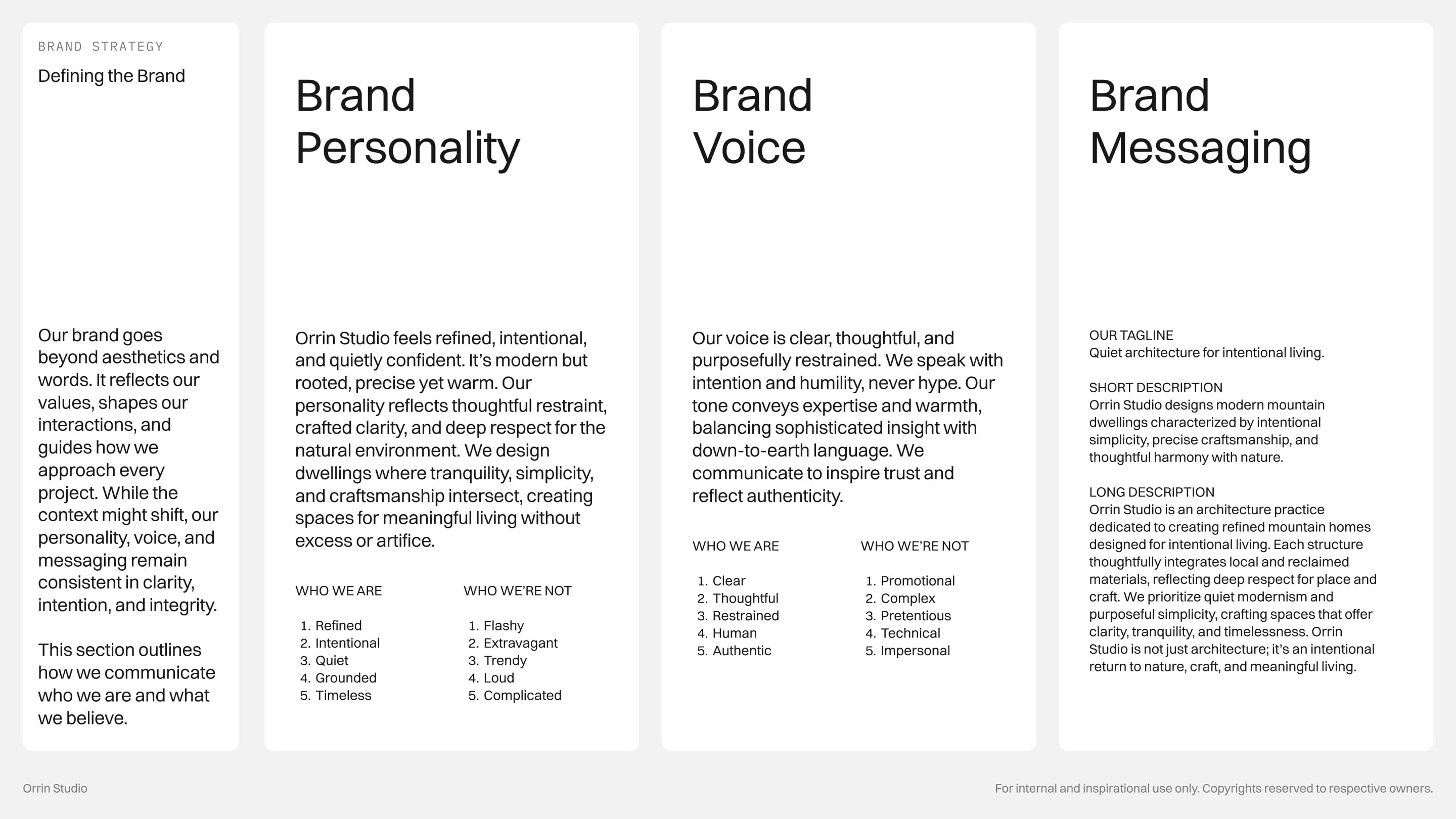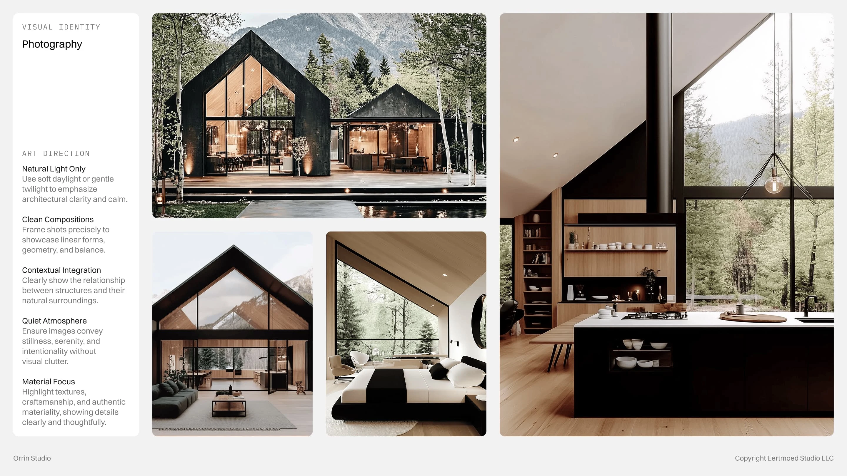 Every detail is intentional, from the modular logo that symbolizes foundation and rhythm to the restrained color palette rooted in stone, slate, and forest. The concept embodies a brand that is timeless, grounded, and quietly confident, reflecting Orrin Studio’s mission to create dwellings that feel inevitable within their surroundings.
