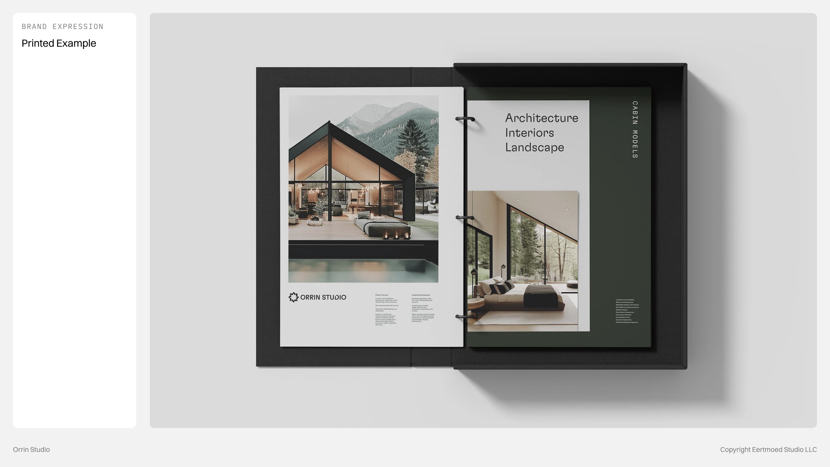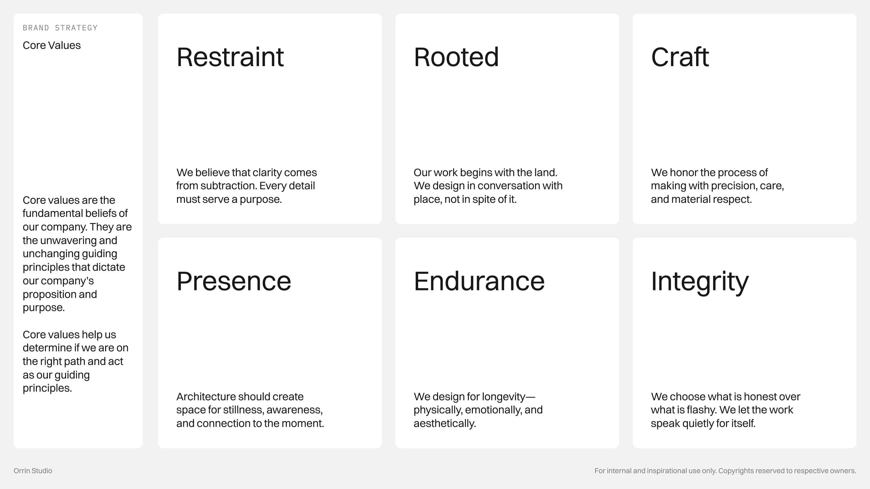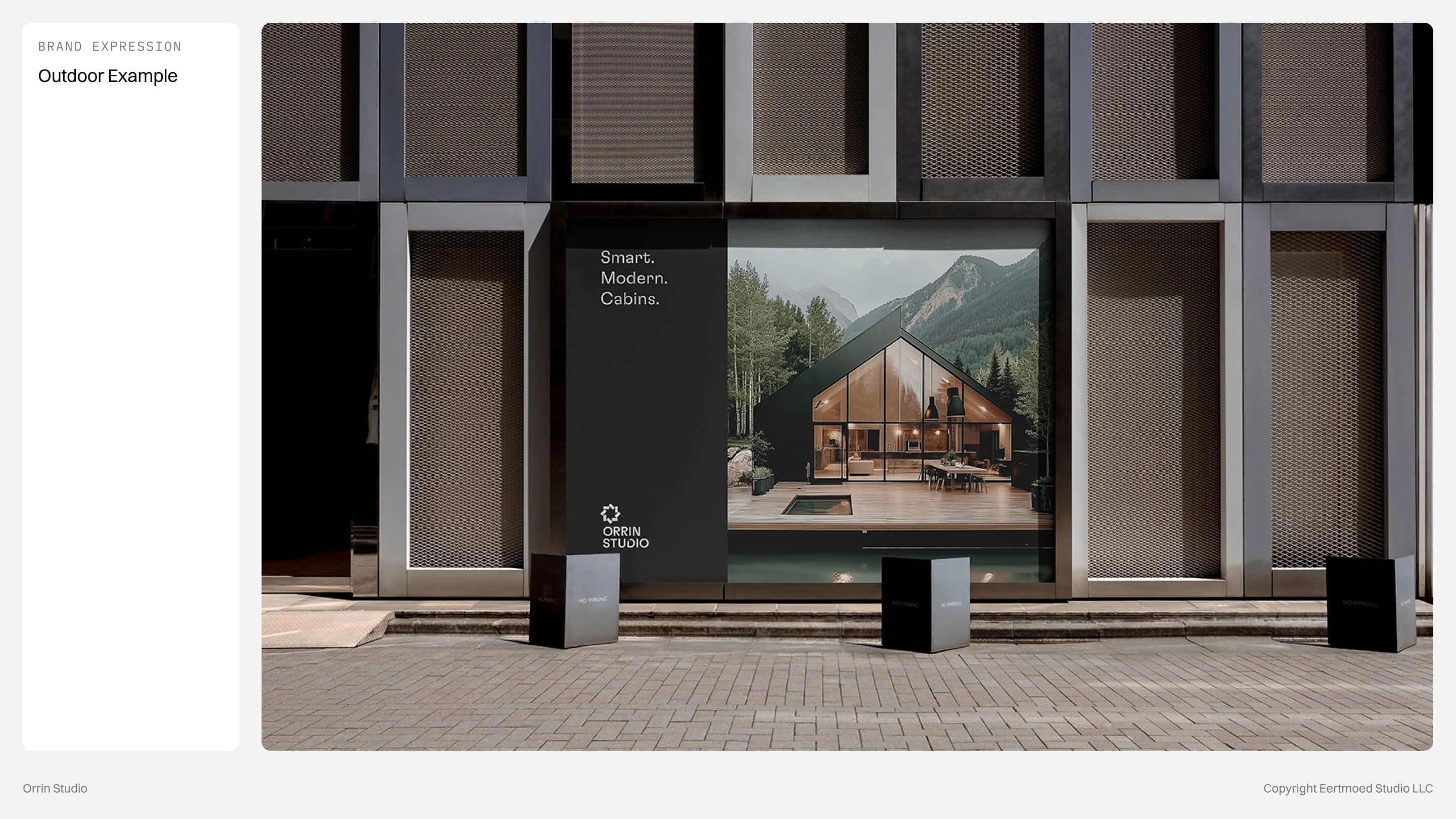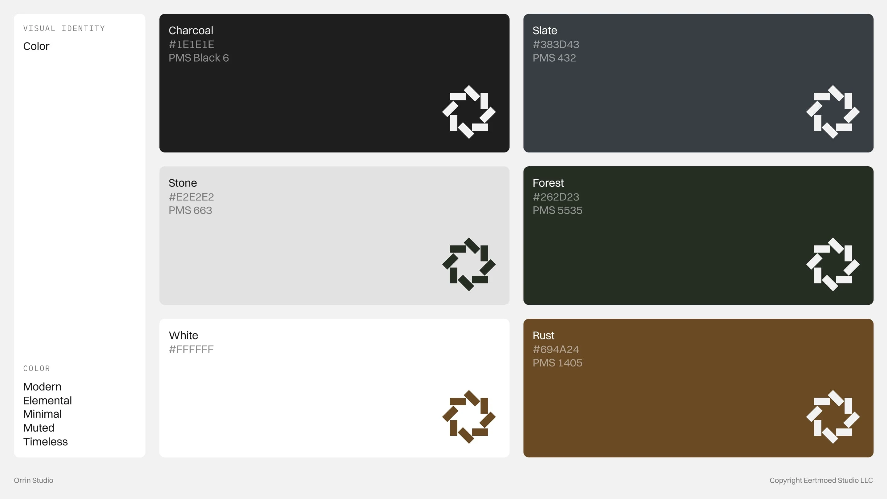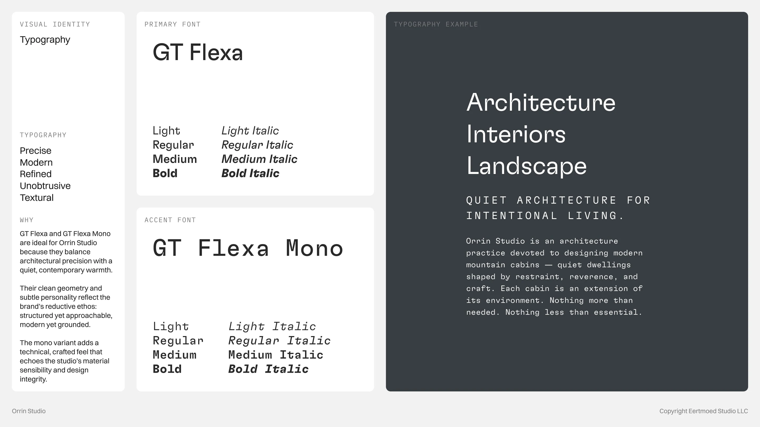 Every detail is intentional, from the modular logo that symbolizes foundation and rhythm to the restrained color palette rooted in stone, slate, and forest. The concept embodies a brand that is timeless, grounded, and quietly confident, reflecting Orrin Studio’s mission to create dwellings that feel inevitable within their surroundings.