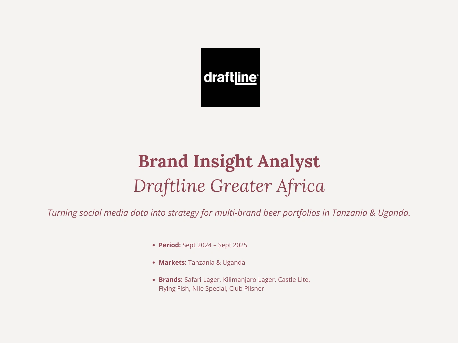 Monthly social performance reports for multiple beer brands in Tanzania, Uganda, and Ghana.