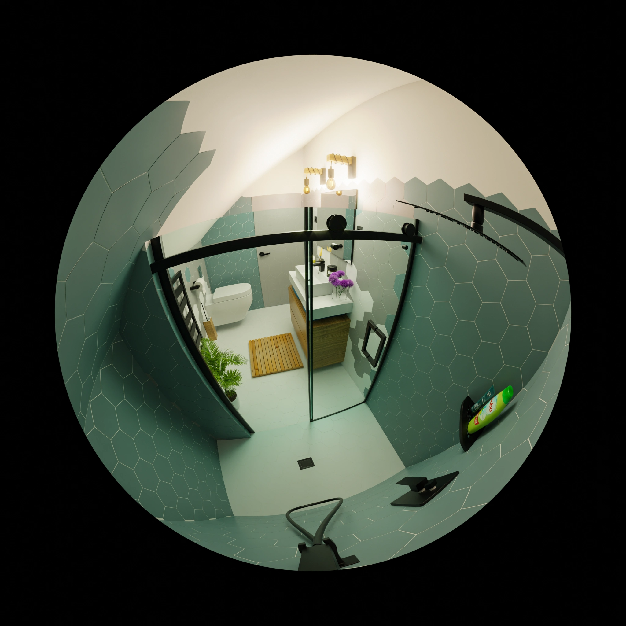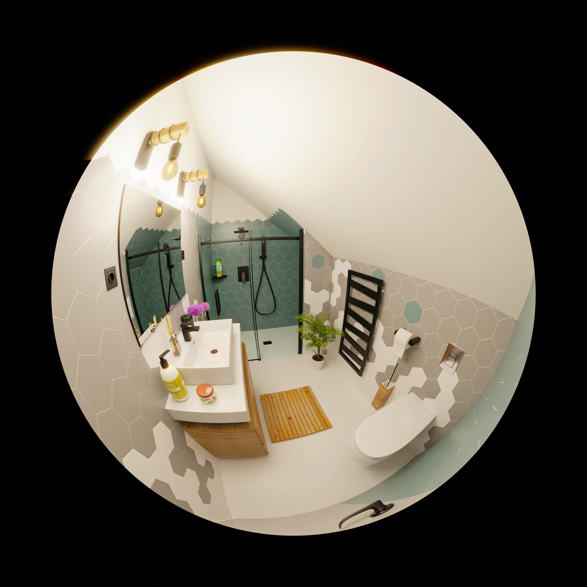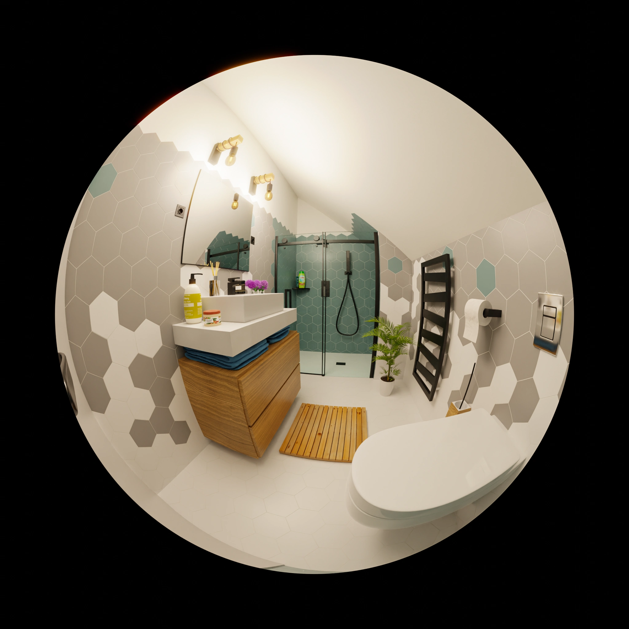 The essence of this ArchViz endeavor was to showcase a modern bathroom that balances sleek design with functional elegance. The project aimed to highlight how contemporary materials and innovative layouts can transform a bathroom into a sophisticated and inviting space. The hexagonal tiles are central to the design, providing a unique texture and visual interest.