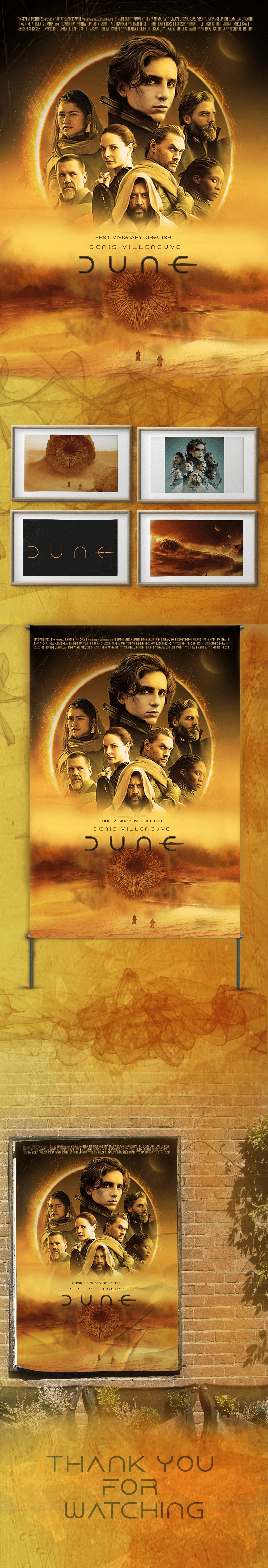 This poster featuring the blend of golden desert tones and intense character portraits, with sandworm below, symbolizing the epic scale and danger of the story.