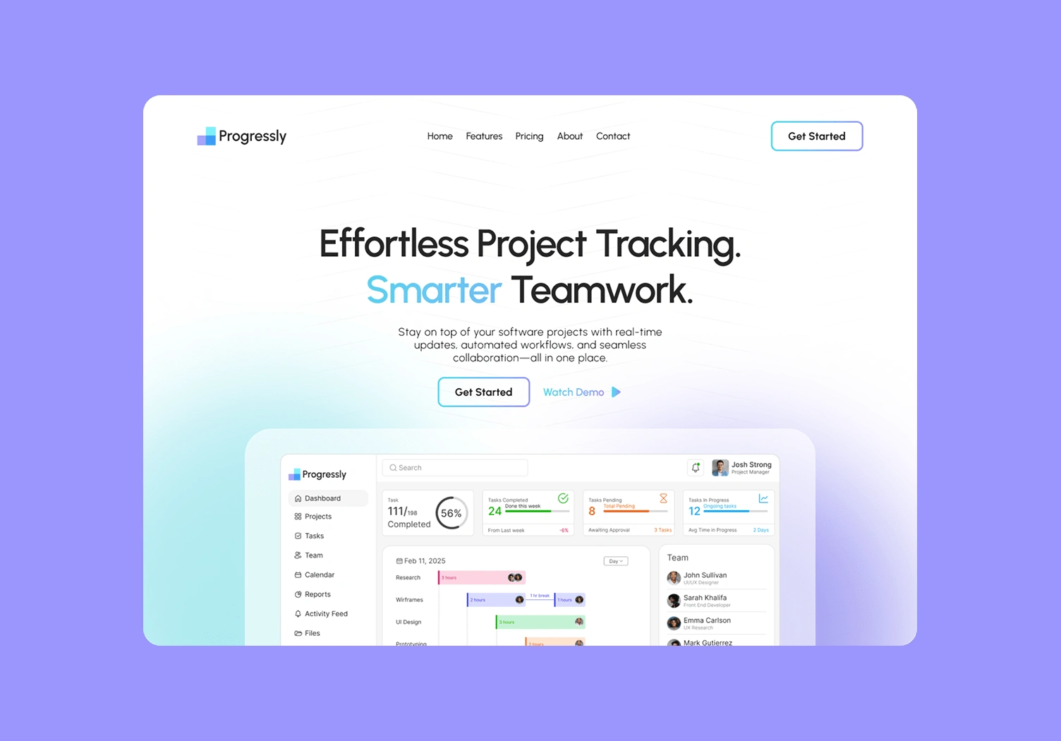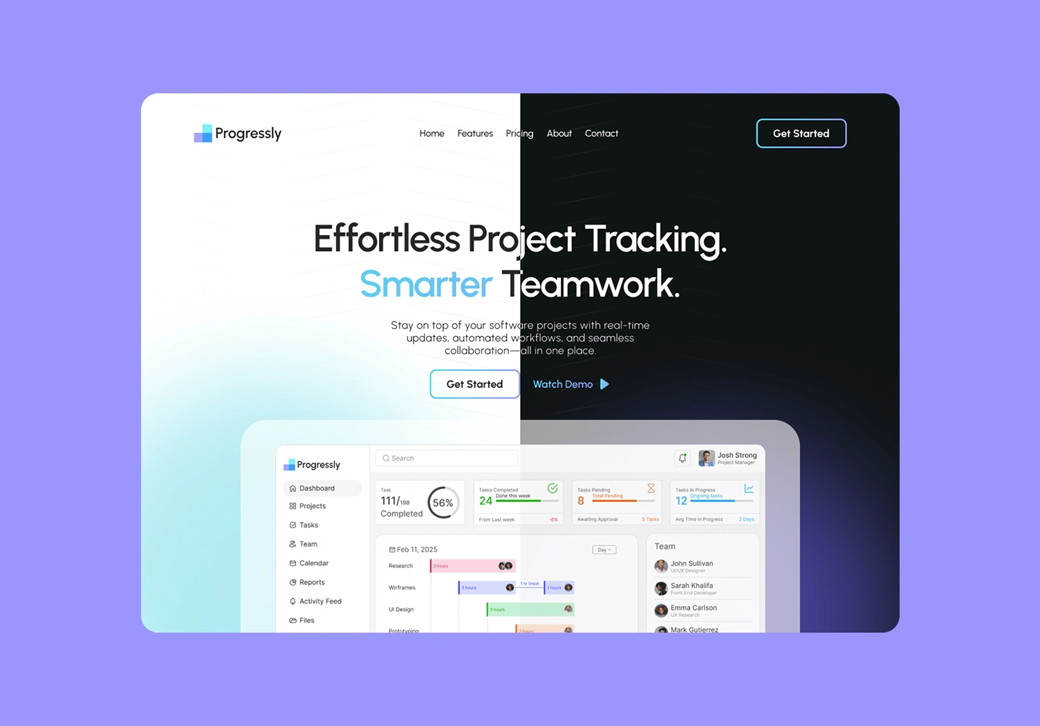 Progressly is a modern project management tool designed for seamless collaboration, real-time updates, and intuitive workflows. This landing page features both a dark and light UI version to enhance accessibility and user preference..