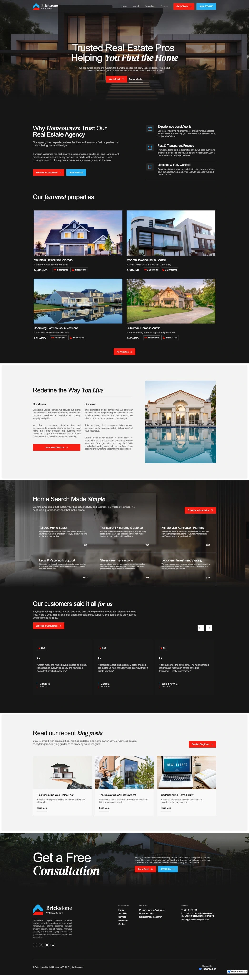 Brickstone needed a clean and modern website that explains their real estate and investment services without confusing the visitor. I designed and built a simple structure with clear sections, direct messaging, and a layout that feels trustworthy.