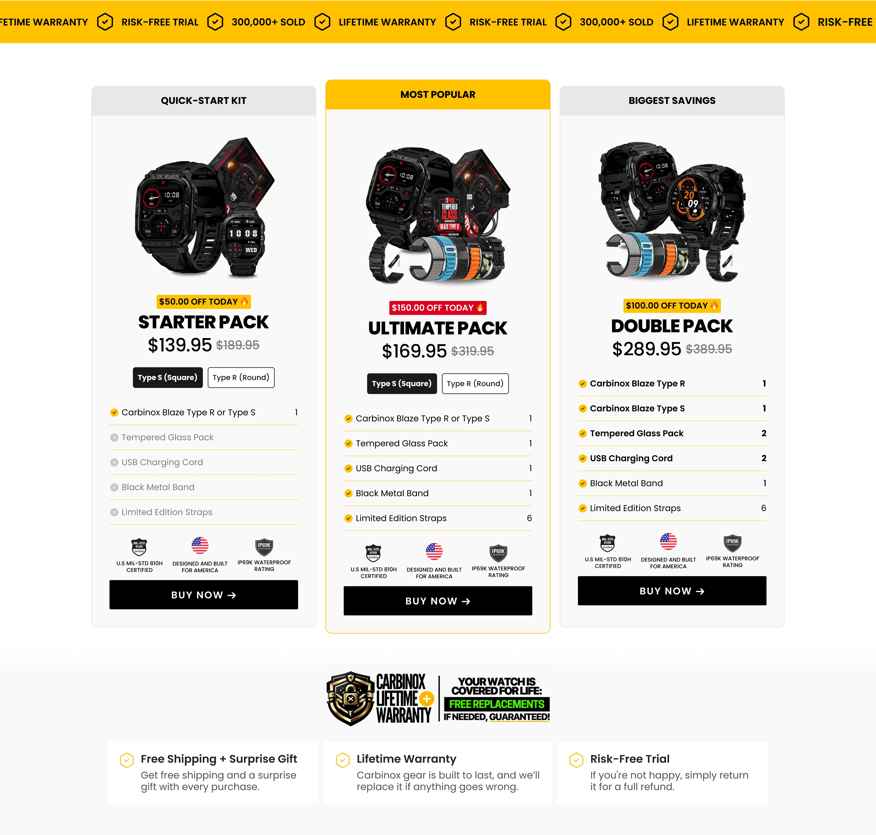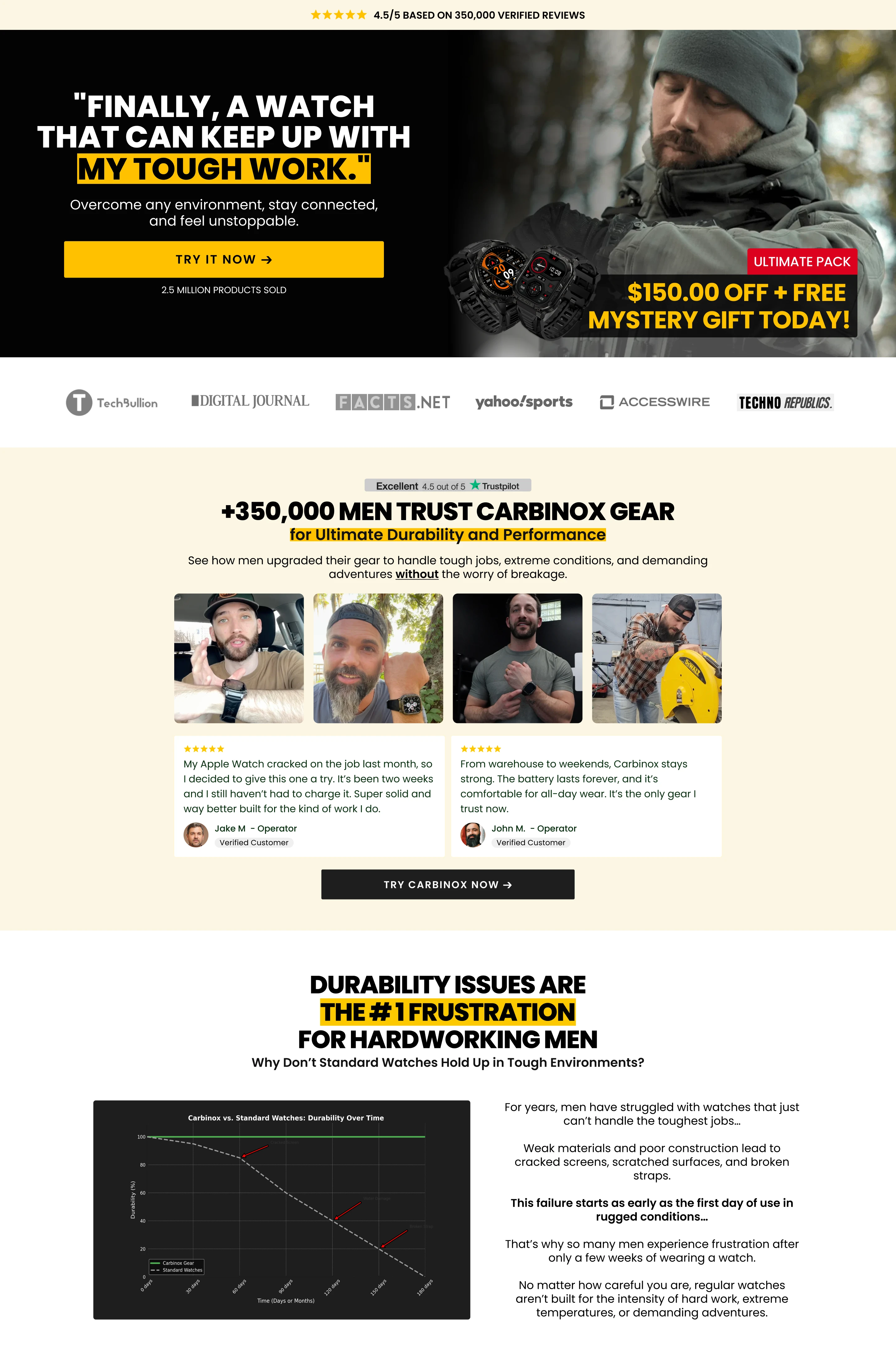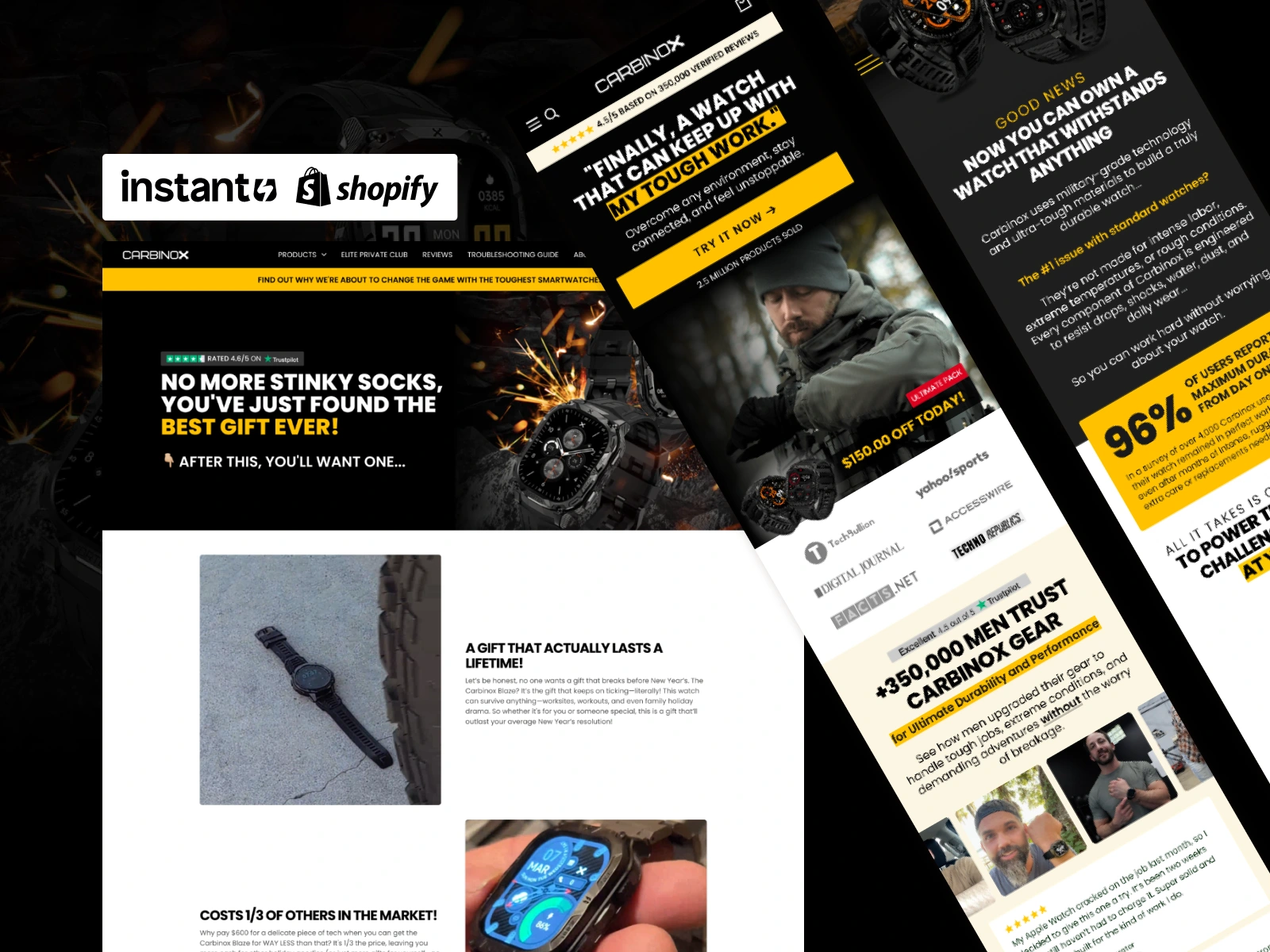 Carbinox is a 7-figure DTC brand selling rugged, military-grade smartwatches to blue-collar workers and outdoor enthusiasts. The brand needed a high-performance, bold Shopify funnel to match their tough product — and we delivered a beast of a landing page built with Instant.