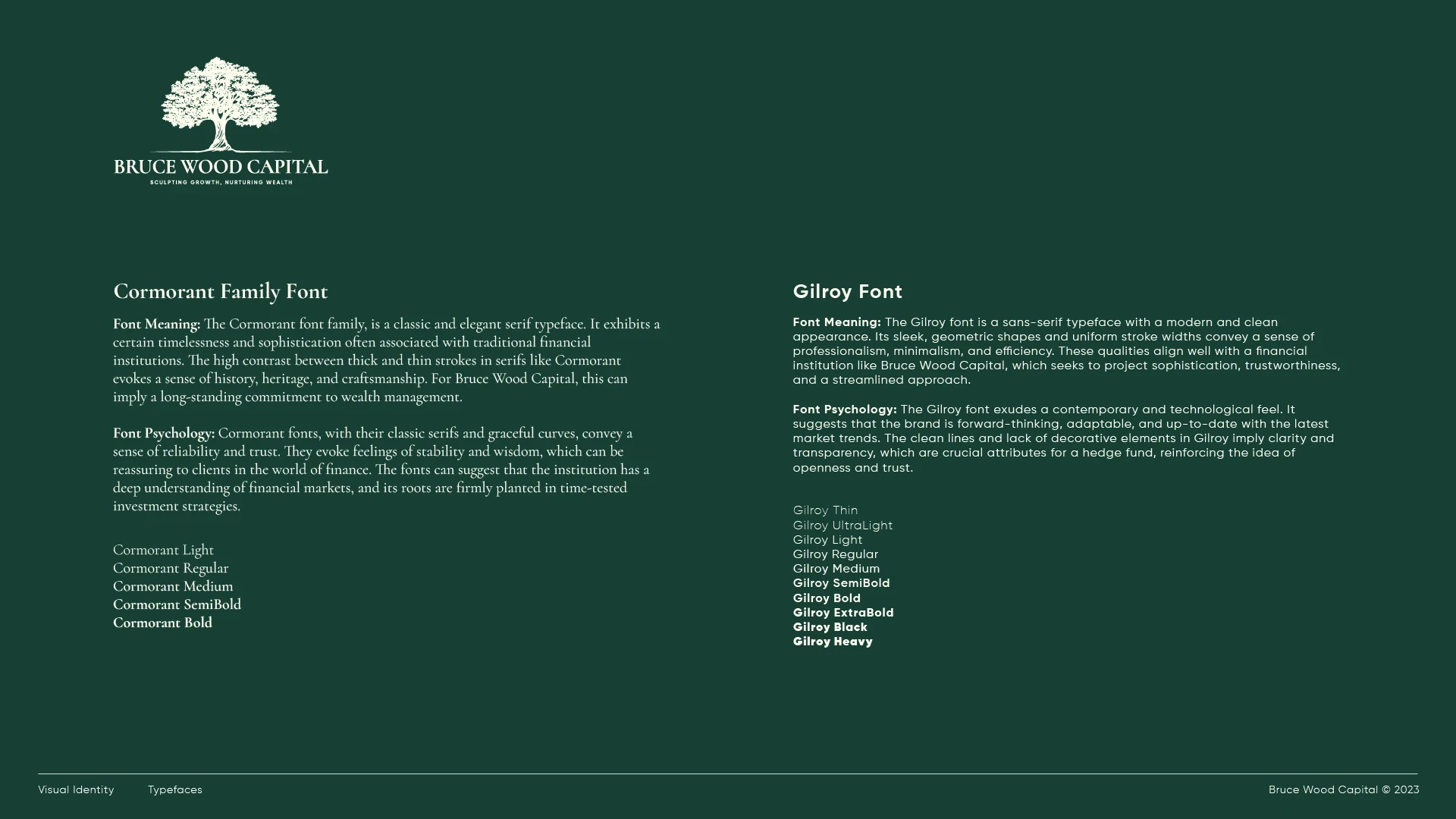 Bruce Wood Capital is a boutique hedge fund management firm serving a selective network of sophisticated investors and institutions. Their focus is long-term stability, disciplined strategy, and wealth growth. My role was to build a brand identity that reflects this level of financial expertise while projecting credibility, intelligence, and quiet confidence.