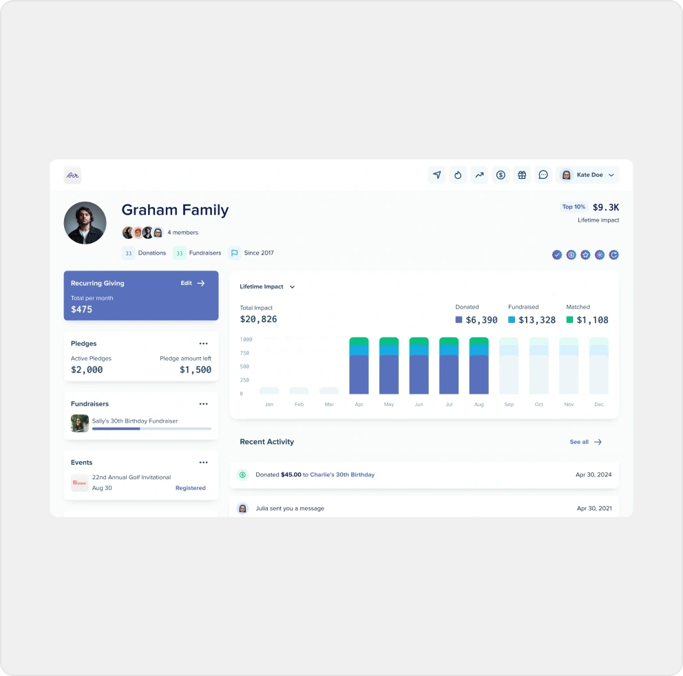 A giving experience platform that helps nonprofits create branded donation pages and track fundraising impact.
