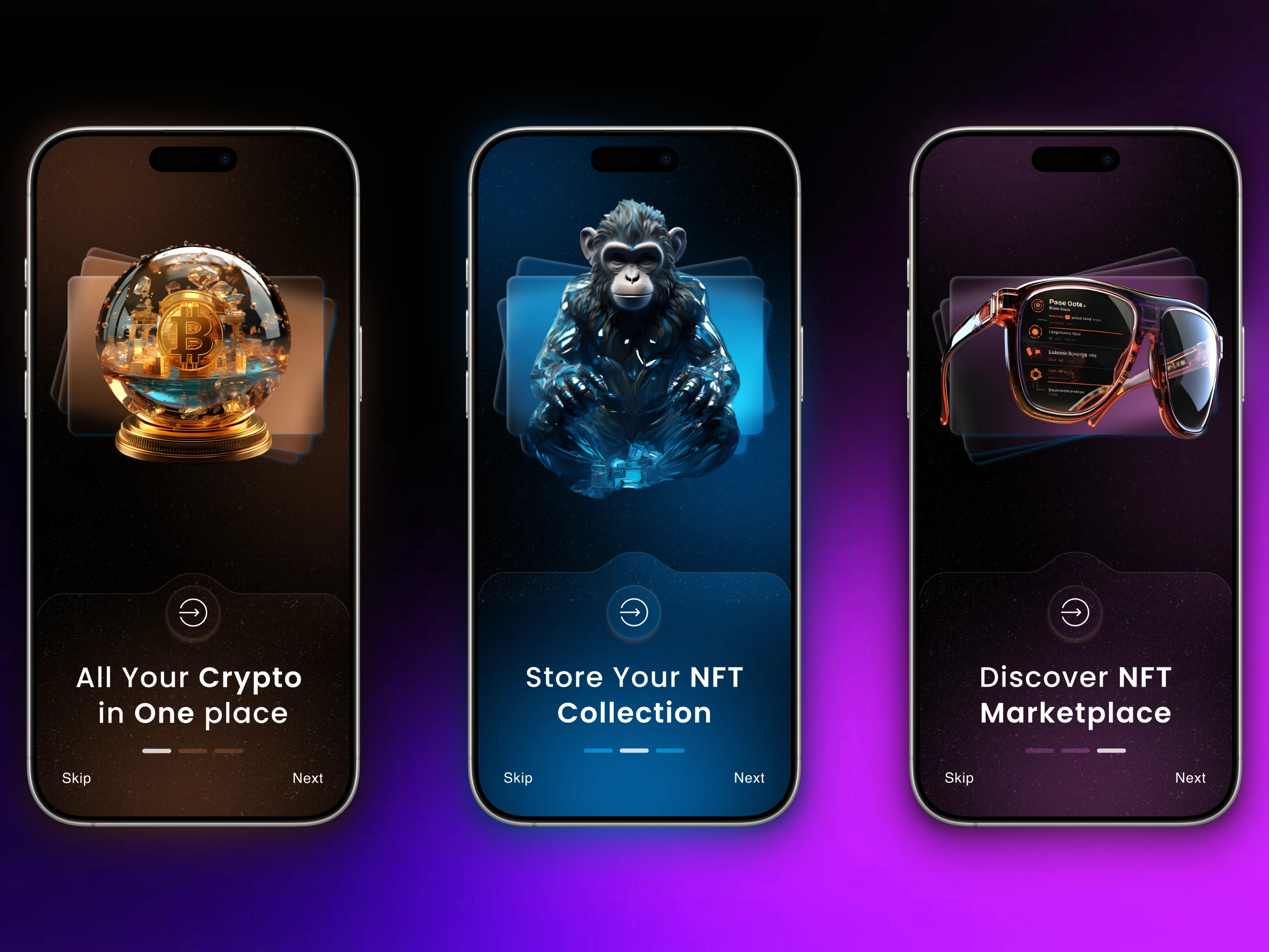 Onboarding flow for an NFT Marketplace Mobile App, focusing on smooth navigation, digital asset visuals, and futuristic design elements.
