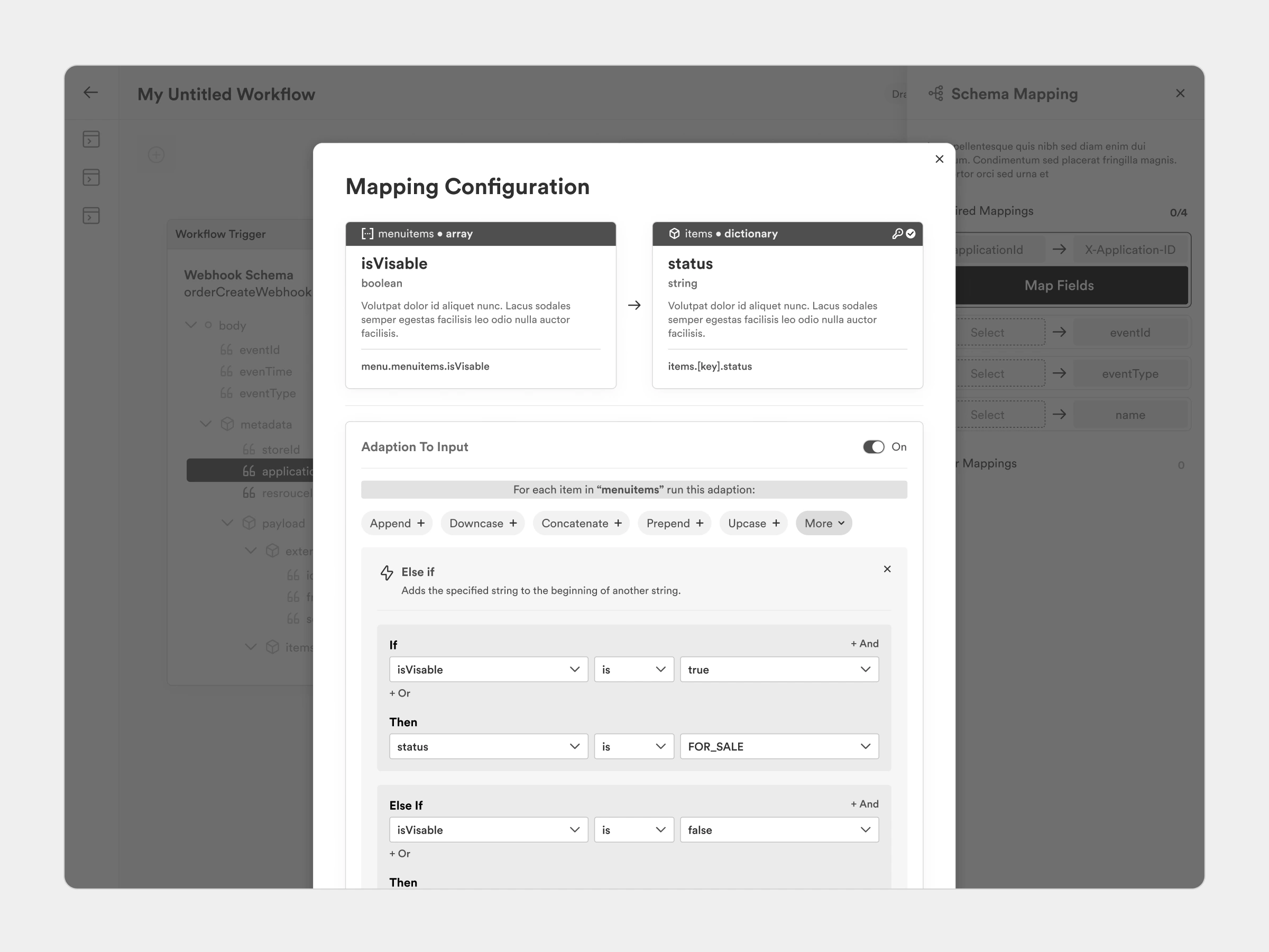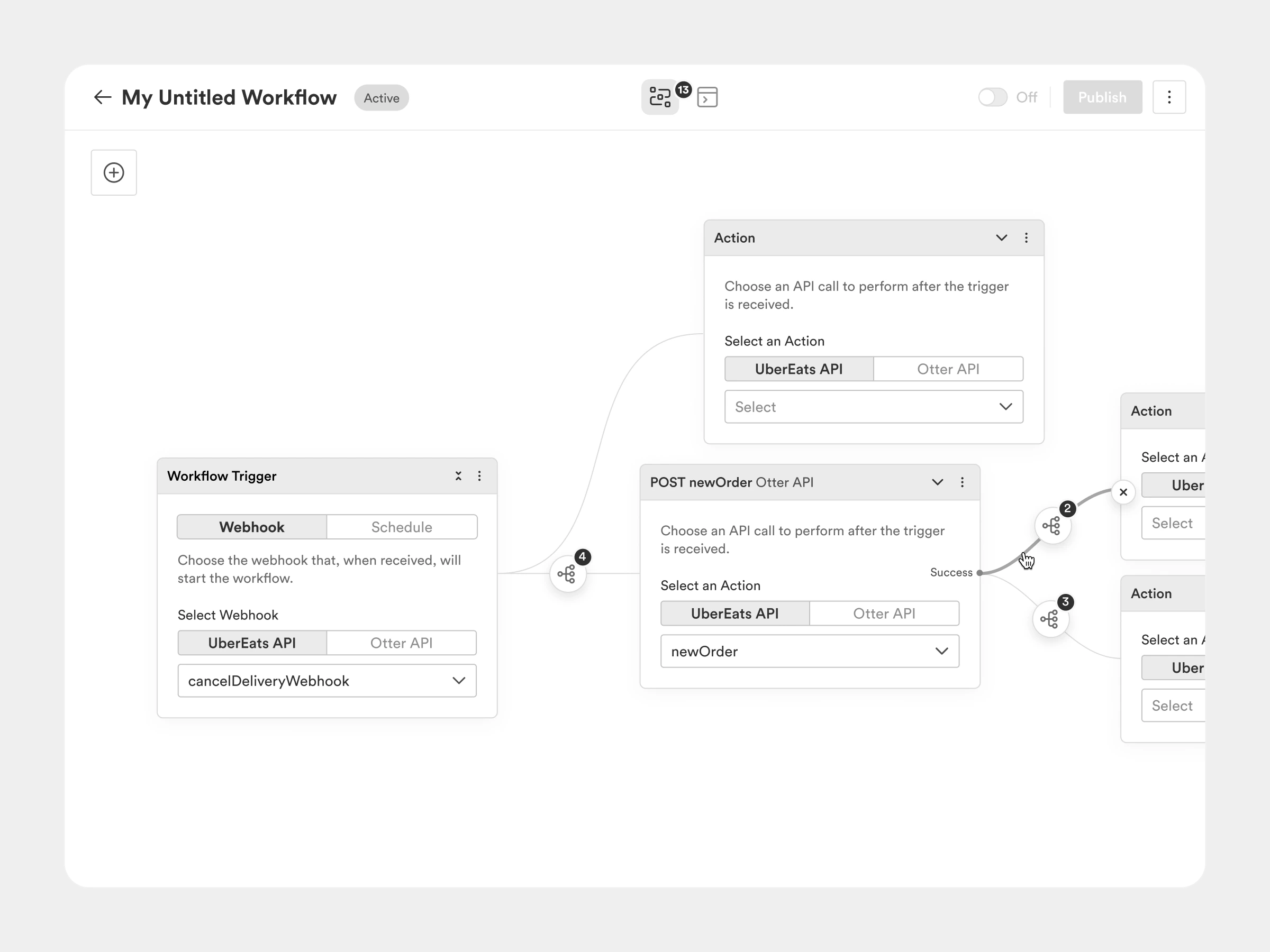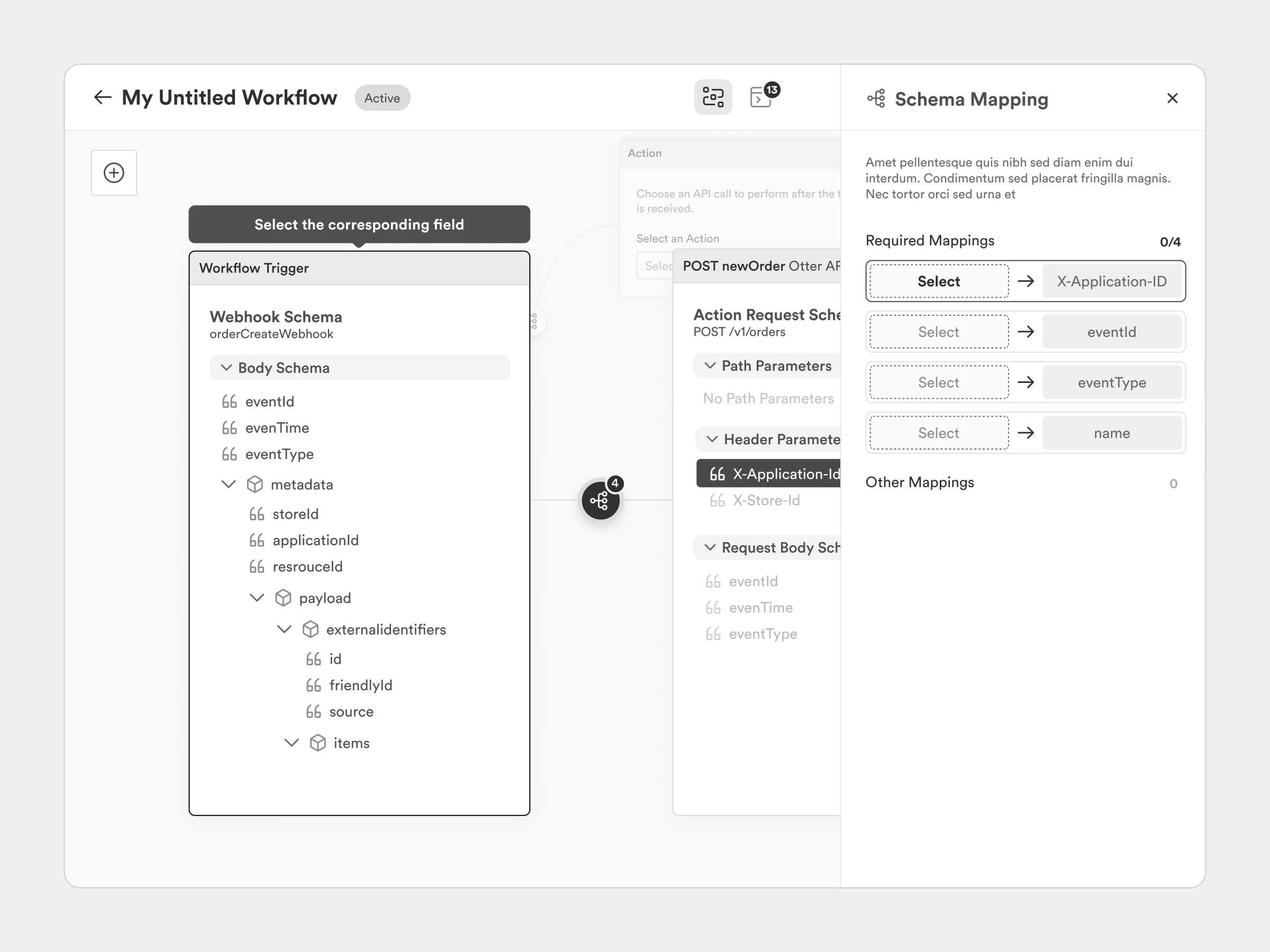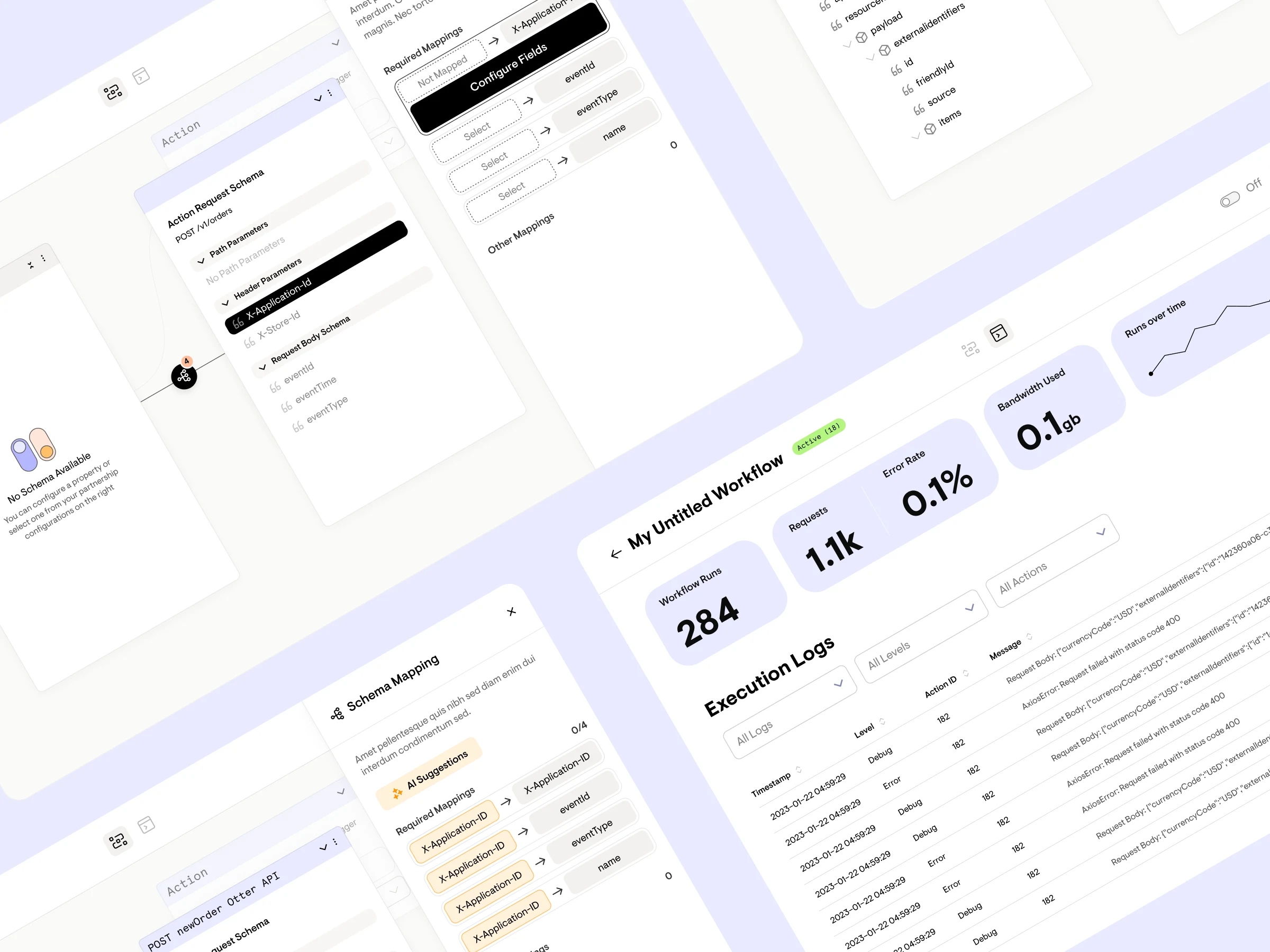The core experience of the product is creating and testing workflows. For low-code tools, a visual workspace where users can create actions and make connections is a common pattern. We focused on making these interactions feel natural and discoverable. We also needed to find a way to communicate the required schema mapping tasks users need to complete after a connection is made.