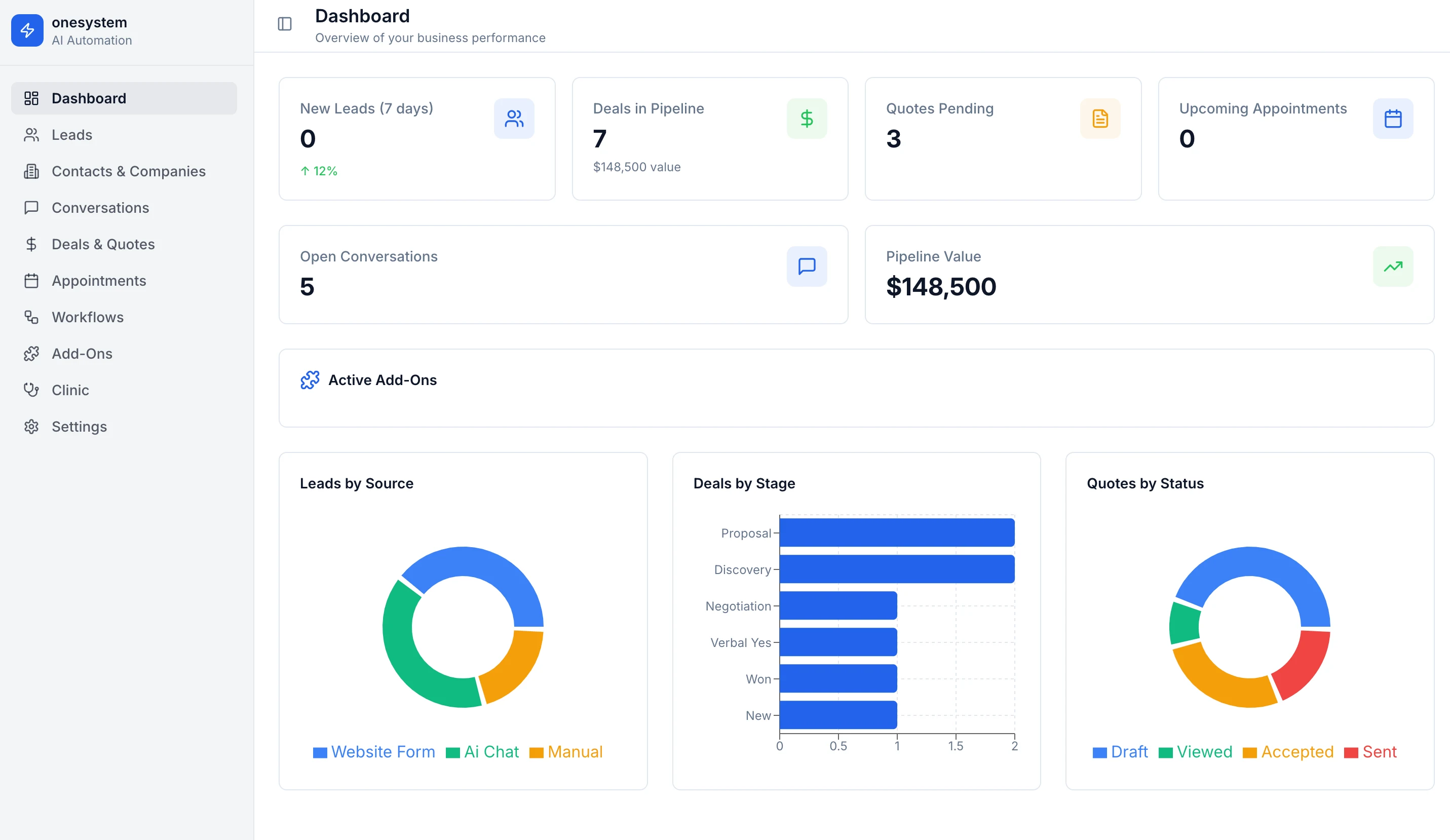 A full internal operating system to capture leads, manage conversations, run a deals pipeline, generate quotes, and automate follow-up with full auditability.