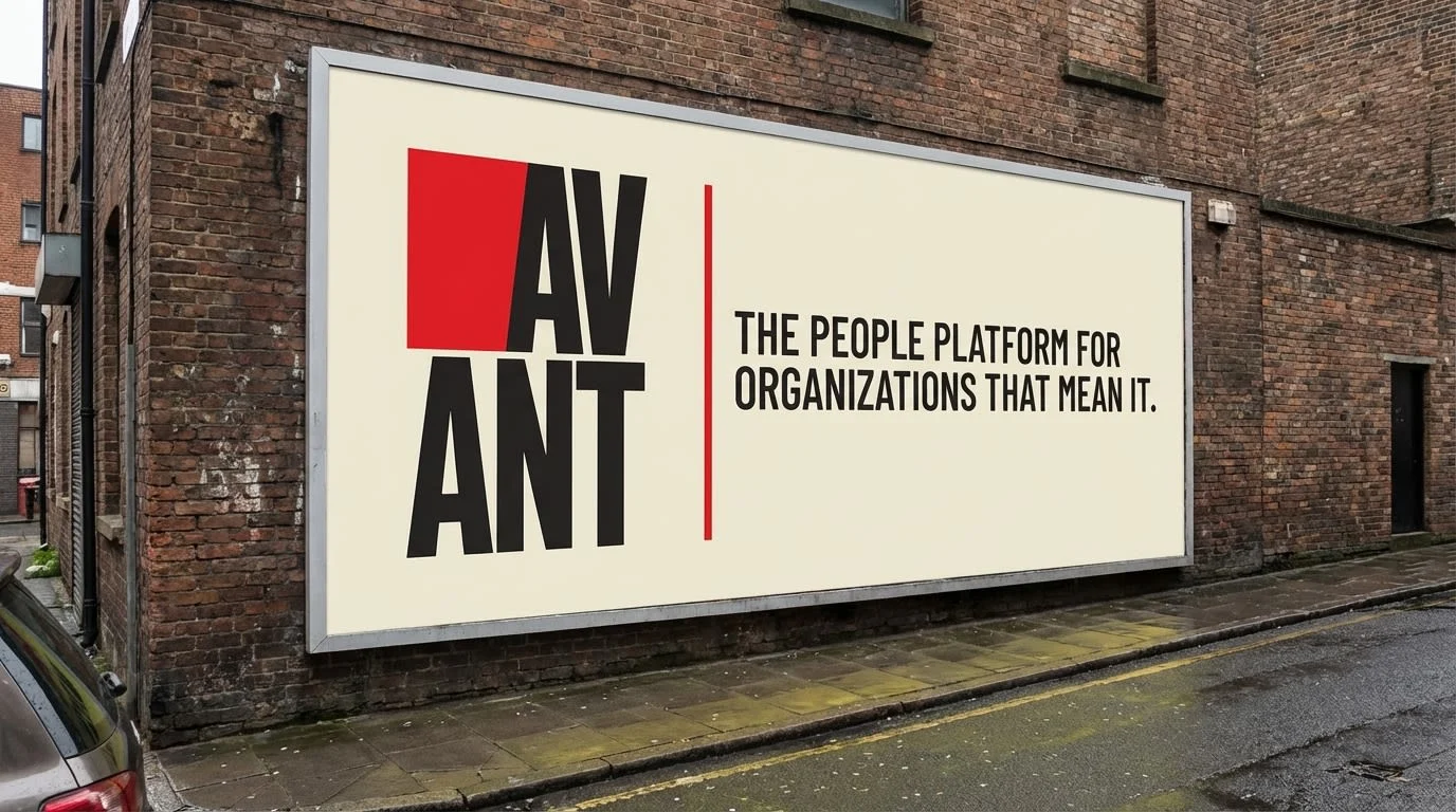 The A3 poster is the clearest expression of the brand's movement ambition - the hero logo at maximum scale, a #CC1010 rule line beneath it, and three lines of text reading "PEOPLE ARE NOT A RESOURCE / THEY ARE THE FORCE / AVANT PEOPLE OS." It is designed to be pinned to a wall, not framed. The newsprint insert pushed the editorial angle: tabloid format, the headline "THE ORGANIZATION IS THE PRODUCT." set at 42pt across four columns of condensed body copy. It reads like a manifesto, which is the point.